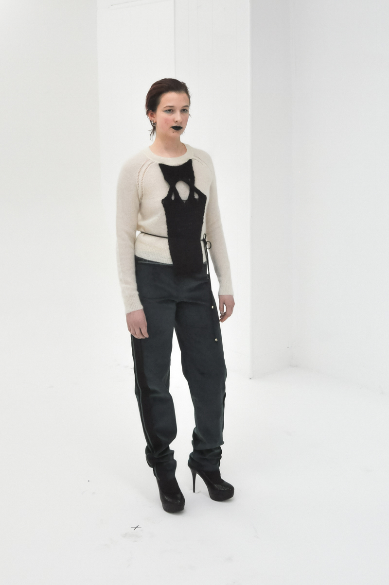 The freedom and playfulness are seen in the golden, tight pants paired with a silky black shirt and a grey asymmetrical cardigan that are reminiscent of the 1980s style. But the hit of the collection was the mid-length white dress with a delicate chiffon top, exposed back and a provocative slit in the front of the dress accentuating femininity. As Jorge said, it would be the dress to wear on a romantic date on Valentine’s day.