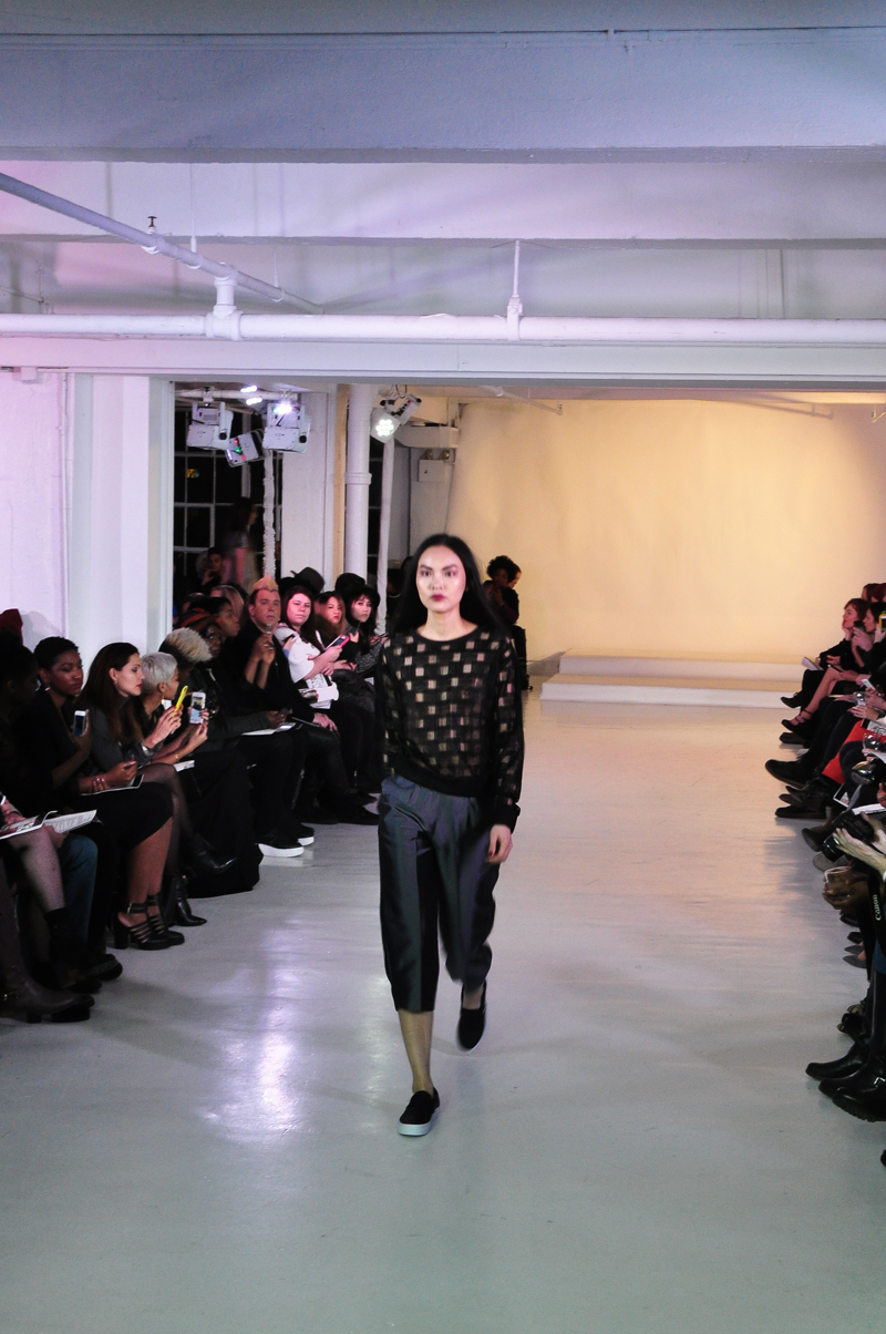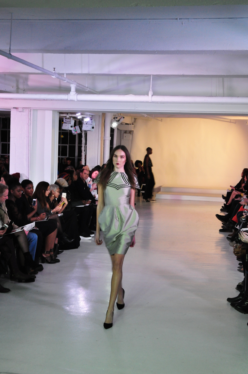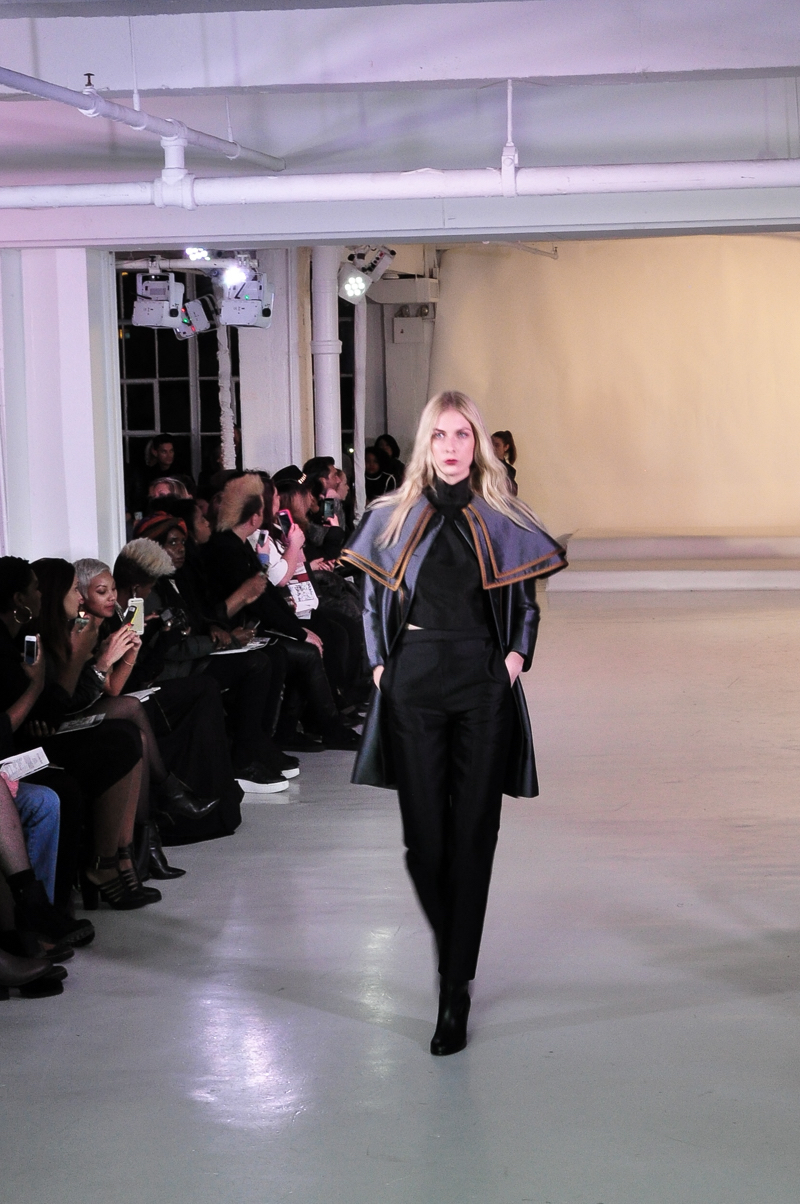 A rather cold and windy evening on the West Side of Manhattan turned into bright event once we stepped inside of Studio 450 on February 12th. Anticipation was in the air. Fashion editors, bloggers, models and guests of the designer gathered to see what appeared to be inspirational collection of extremely feminine looks mixed with structured boyish pants and oversized shirts and low cut dresses.