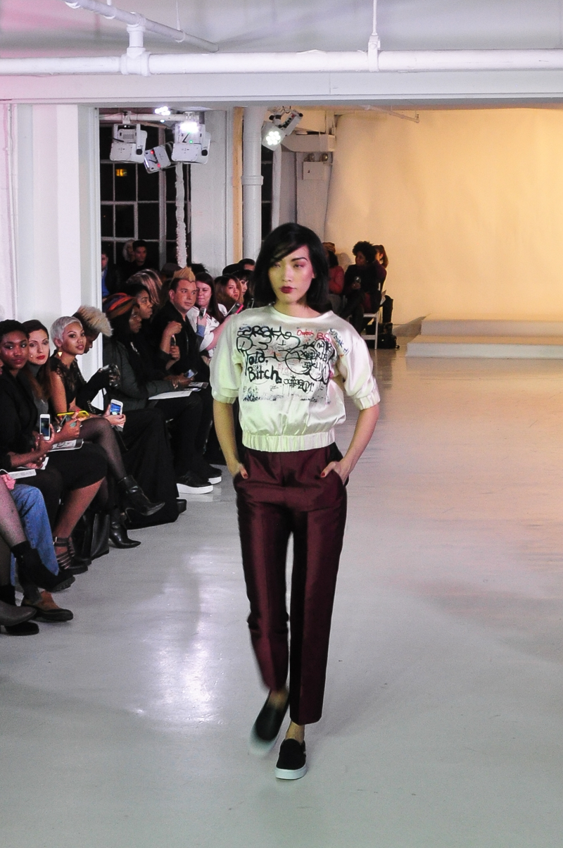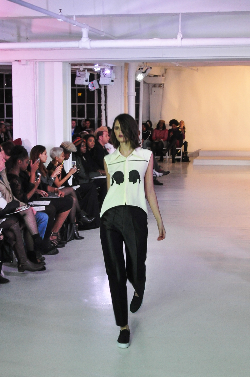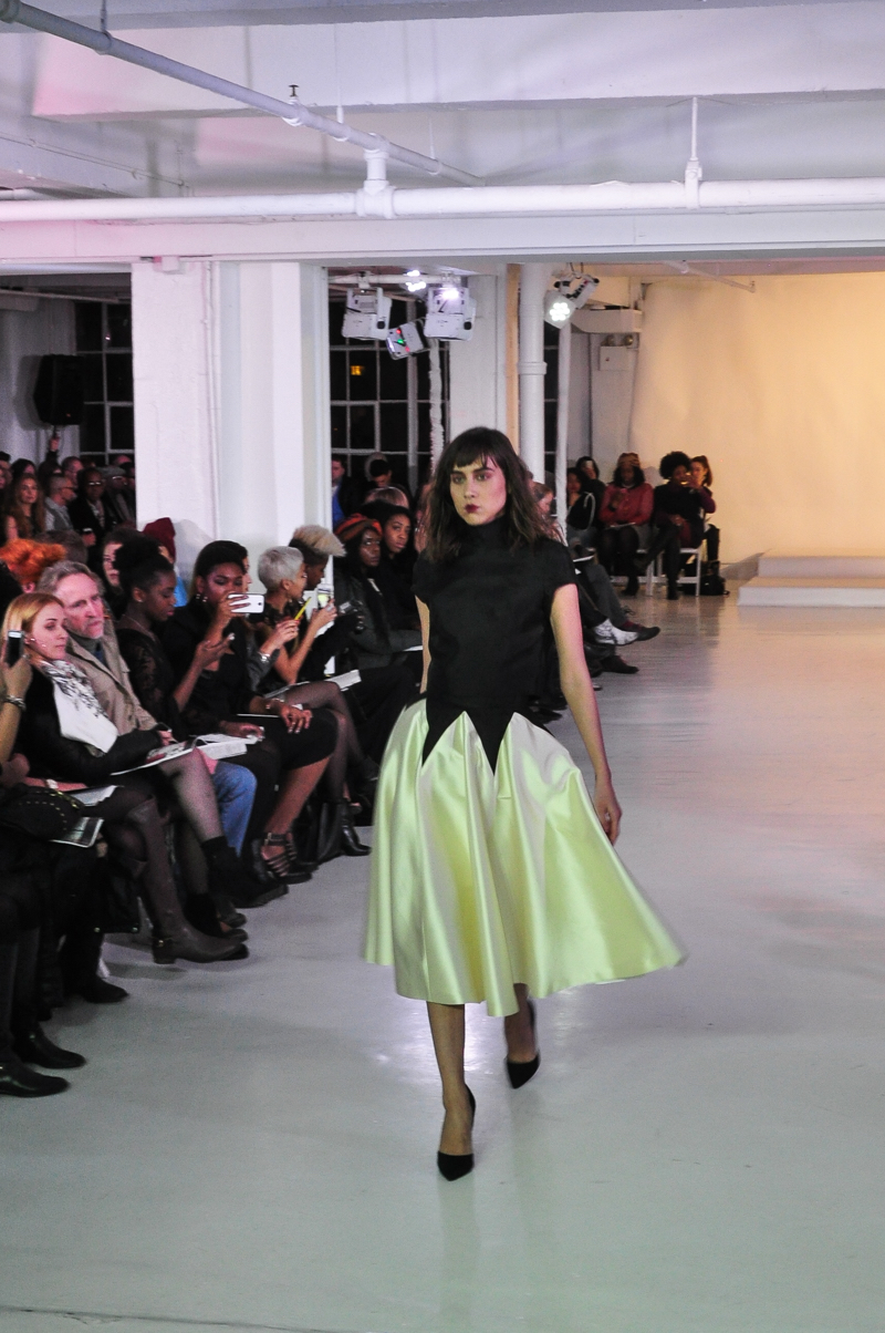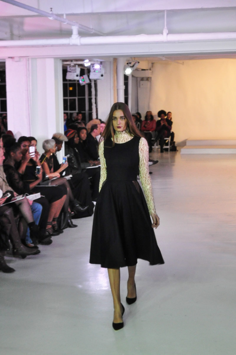 A rather cold and windy evening on the West Side of Manhattan turned into bright event once we stepped inside of Studio 450 on February 12th. Anticipation was in the air. Fashion editors, bloggers, models and guests of the designer gathered to see what appeared to be inspirational collection of extremely feminine looks mixed with structured boyish pants and oversized shirts and low cut dresses.
