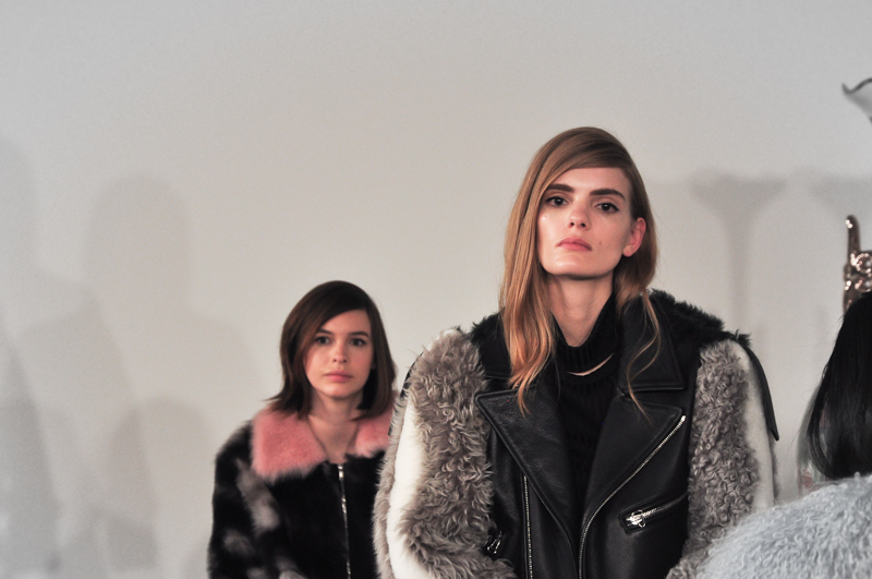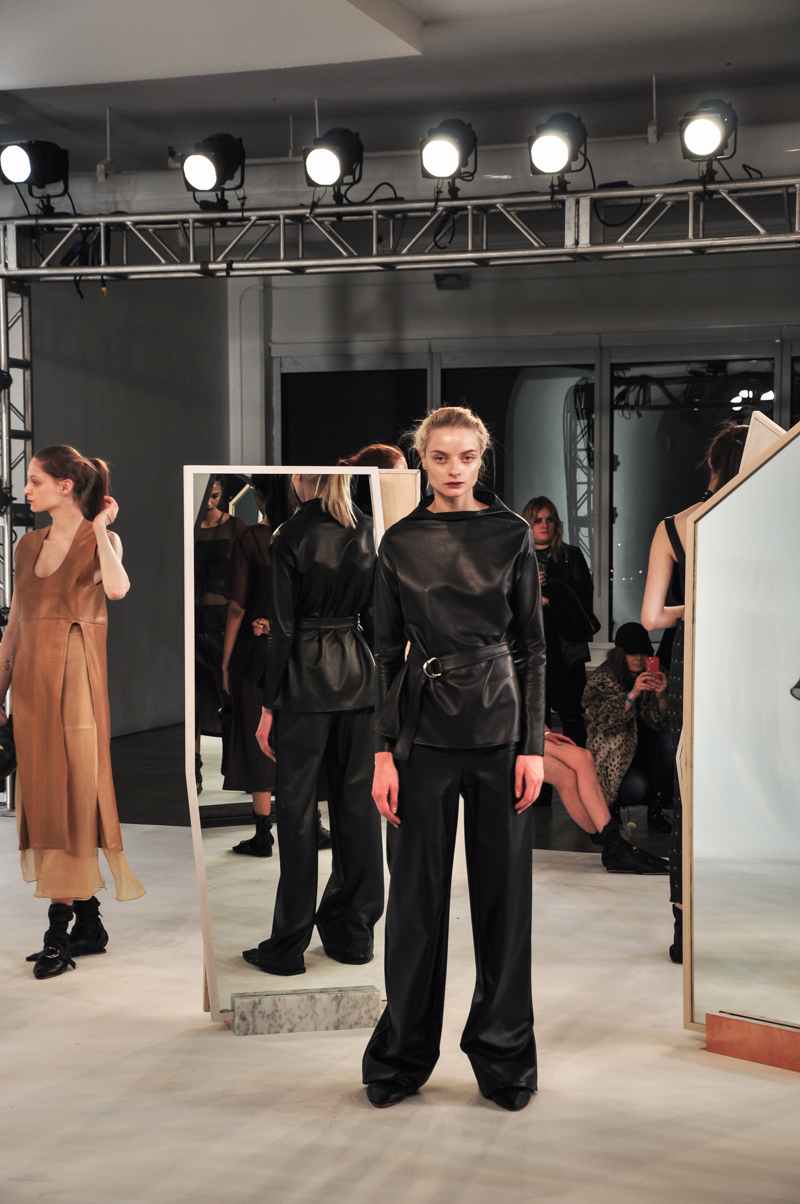 If you had to sum up Collina Strada’s A/W 2015 collection in one word, you couldn’t. It was so successful at combining so many design elements, that you couldn’t pinpoint one element that held its ground throughout. Leather and buckles were in the same look as long chiffon skirts and jersey tops. Models were set up amongst angular mirrors, where they would look to occasionally fix their hair or glance just to see how cool they appeared in Strada’s creations. The collection shined in its balance of warrior-esque leather and details with soft sheers and knits. Each look felt structured and feminine all at the same time.