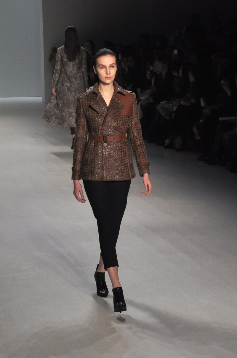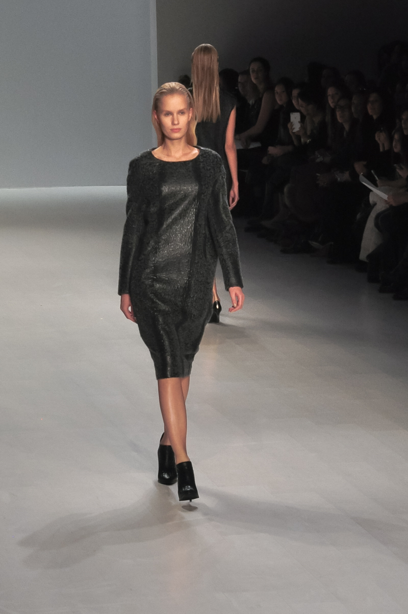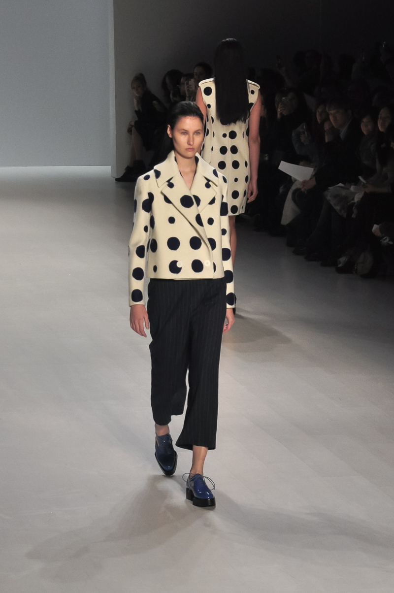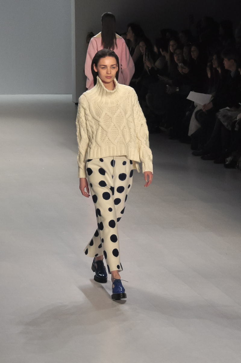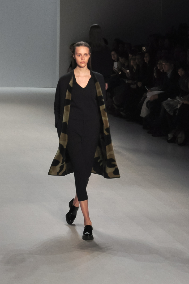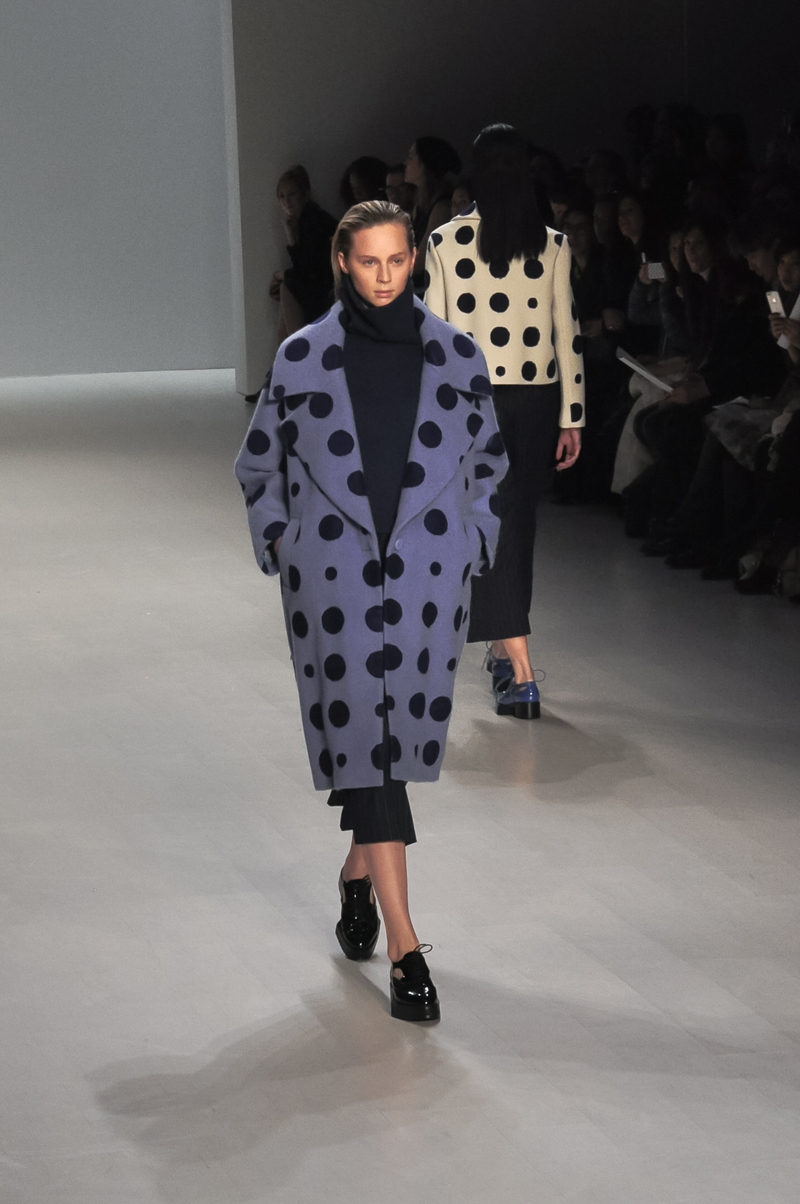 Large and small polka dot patterns, textured monochrome, and stylized camouflage punctuated a subtle palette of muted greys, blacks, burgundies, browns, greens and other fall colors. Fabrics and materials included vegan leather, textured wool, bonded fabric, and fur trim. Zippers occasionally added an accent on jackets or an element of surprise at the edge of a skirt pleat, but the strength of the collection lies in the soft, sculpted forms and subtle color combinations the designer creates.
