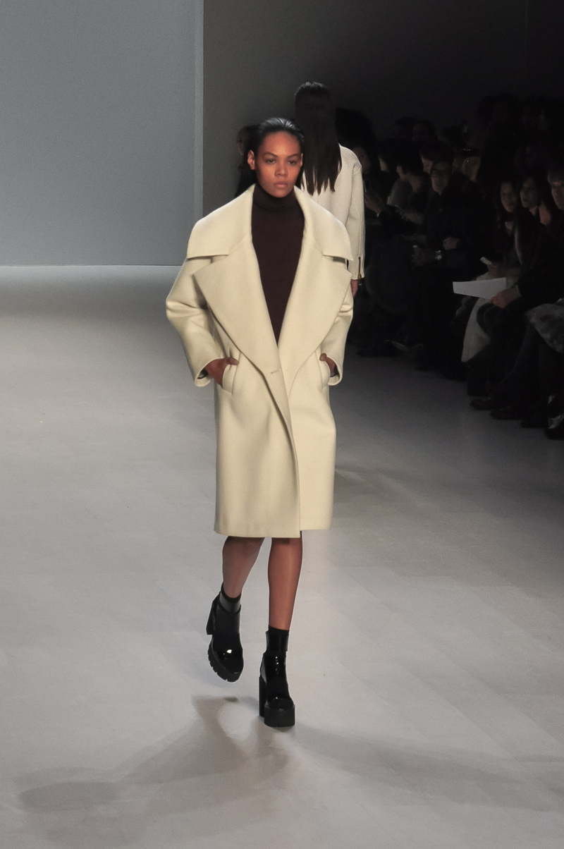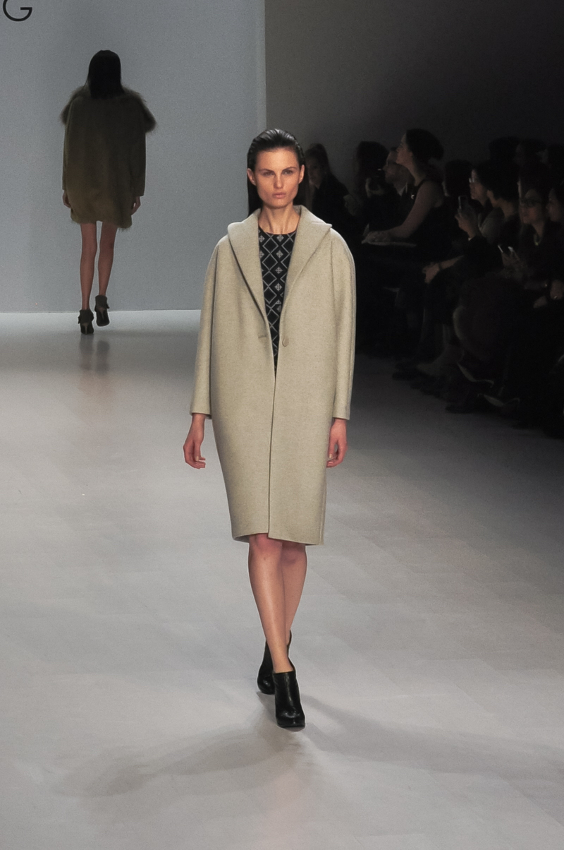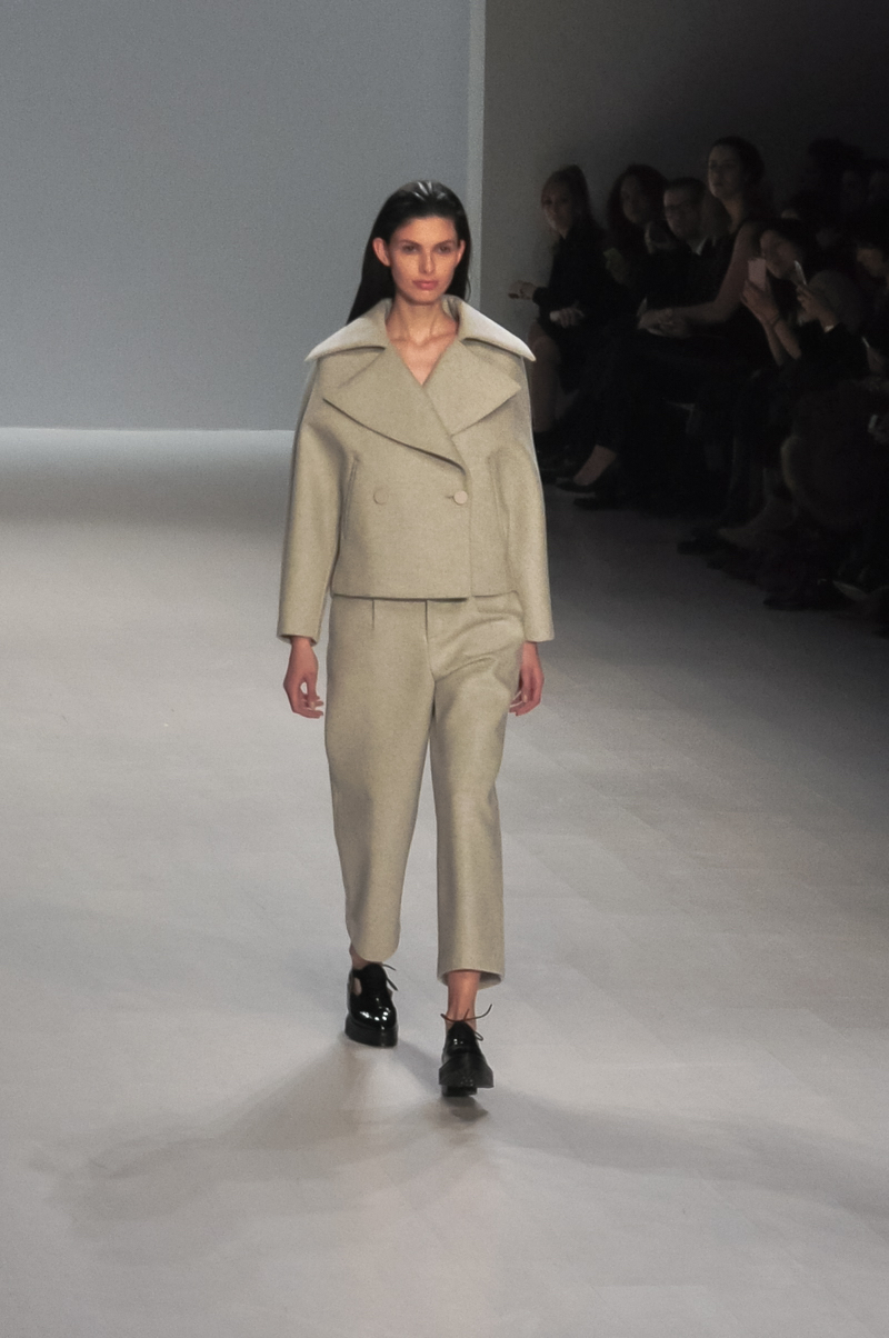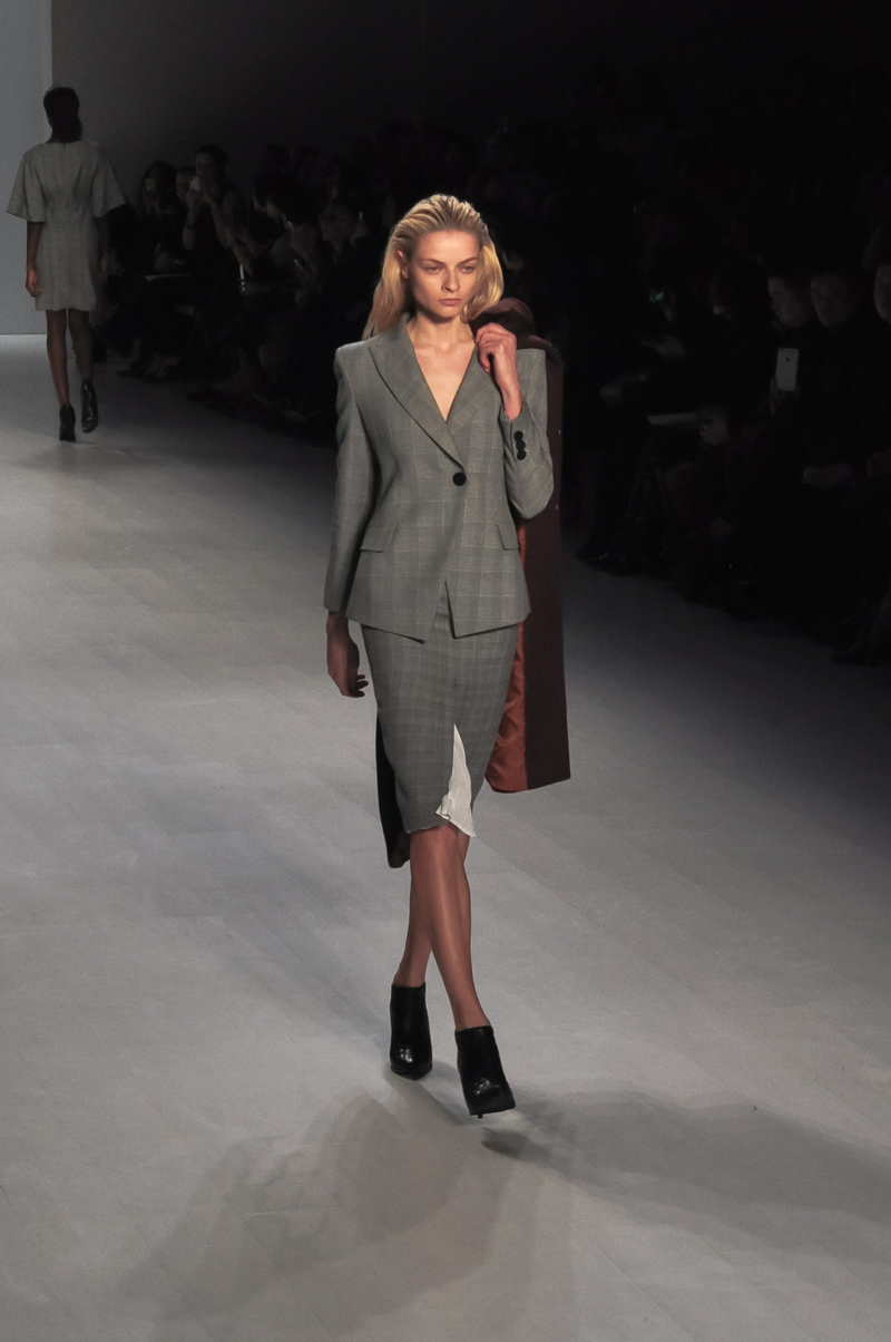 The first model wore a cool grey pantsuit in wool plaid. The double breasted jacket buttoned at the waist, had a wide lapel, and was cropped in a gentle curve that tapered slightly toward the hips. The suit was worn with a long slim wool coat in a warmer tone of grey.