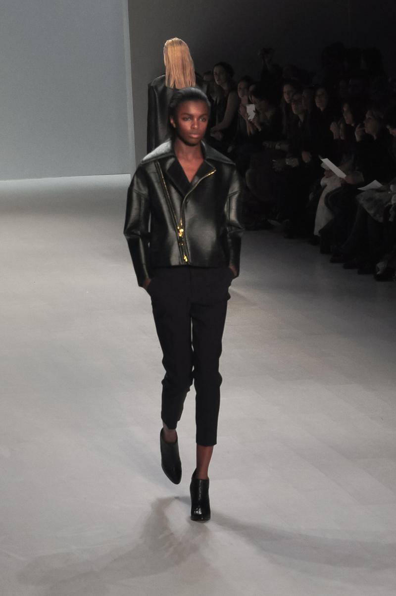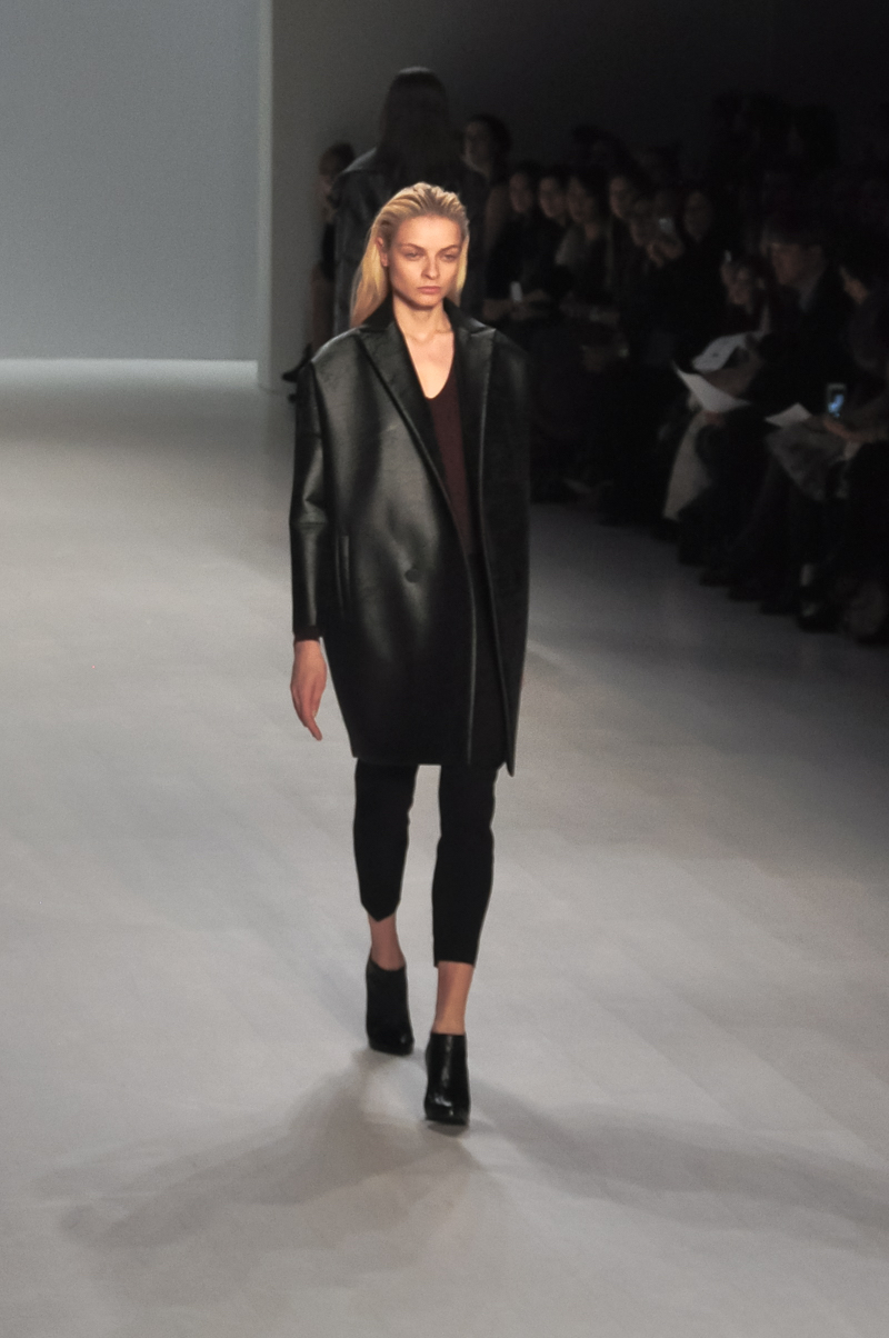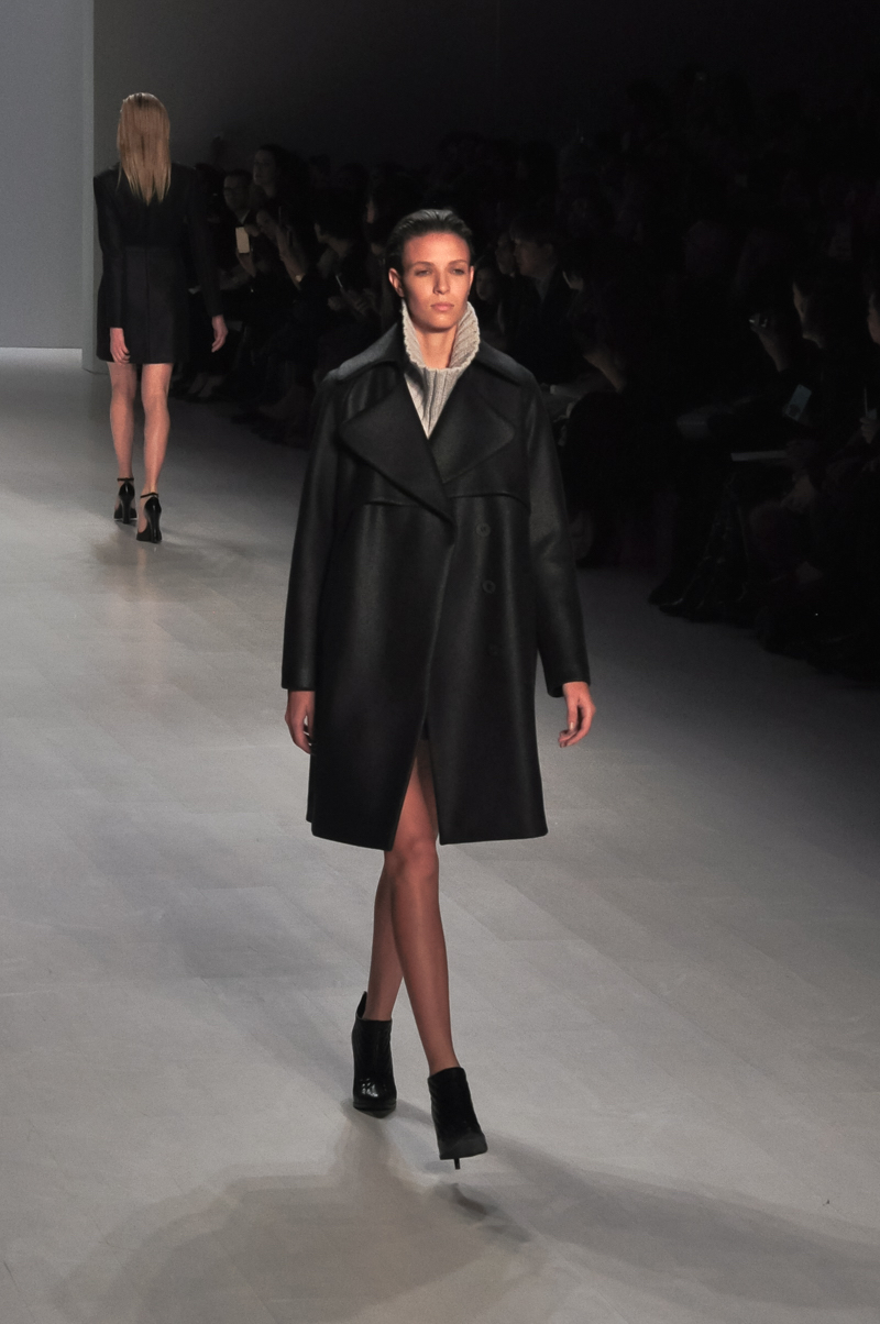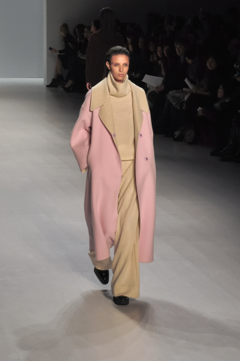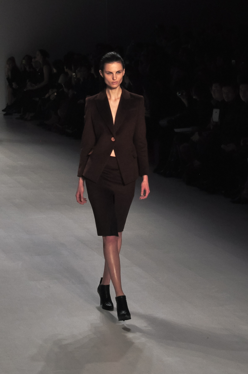 The first model wore a cool grey pantsuit in wool plaid. The double breasted jacket buttoned at the waist, had a wide lapel, and was cropped in a gentle curve that tapered slightly toward the hips. The suit was worn with a long slim wool coat in a warmer tone of grey.