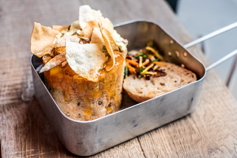 Eyes will be immediately drawn to the Chakalaka, a combination of spicy chicken, tomato, raita and mango chutney, served in a hollowed-out brioche loaf in an old-school mess tin. It’s an interesting mix of familiar Indian flavours with rustic twists of South African influence that takes it into a new territory. Eating with the odd combo of wooden fork and plastic knife, reaching into the mess tin, at first proves slightly challenging. Bunnychow may have the decor of a more up-market dining experience, but they are keen on you getting to grips, hands-on, with your bunny.