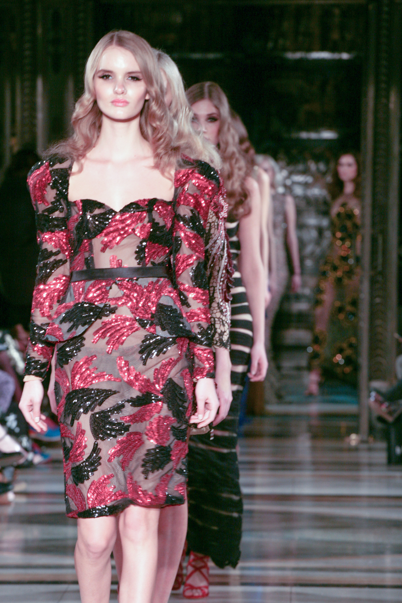 Tran set the tone for the second half of the show with a flamboyant red blazer suit, which was markedly more sensual than the exclusively black and nude designs seen previously. The collection took on elements of avant-garde design, featuring angled off-the-shoulder dresses with seductive cut-outs. A black and red glitter evening gown was amongst the stand out pieces, with an undisputed ability to command attention – no doubt part of Tran’s mantra to empower the modern woman.