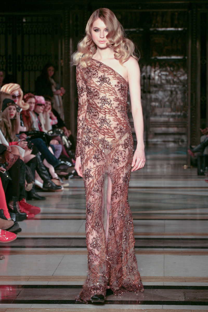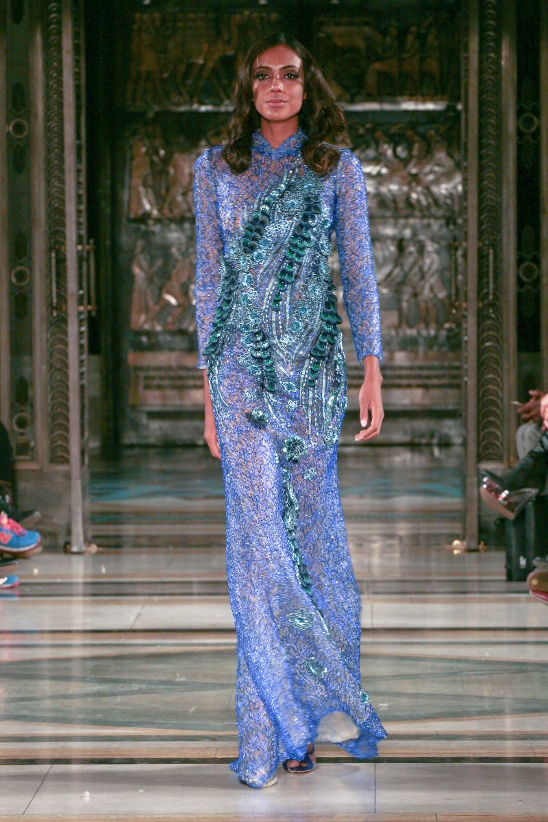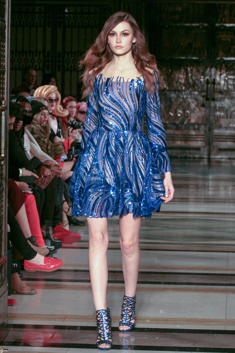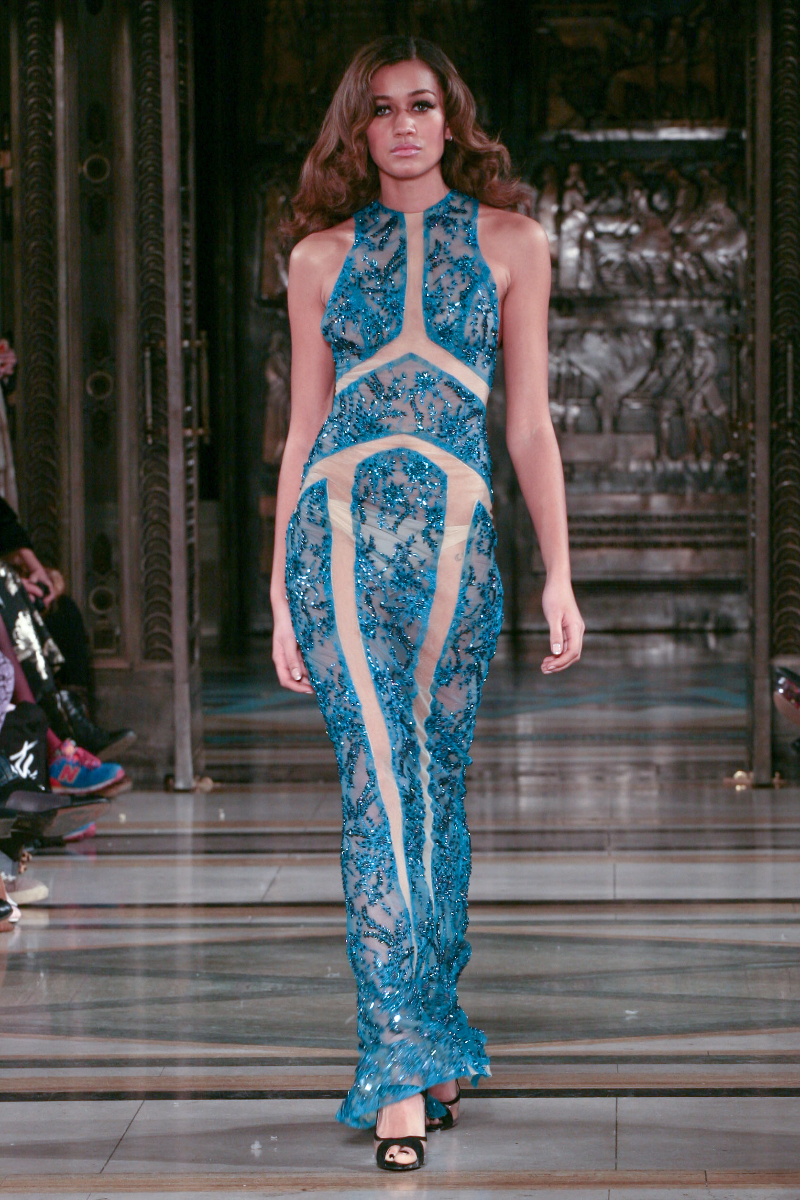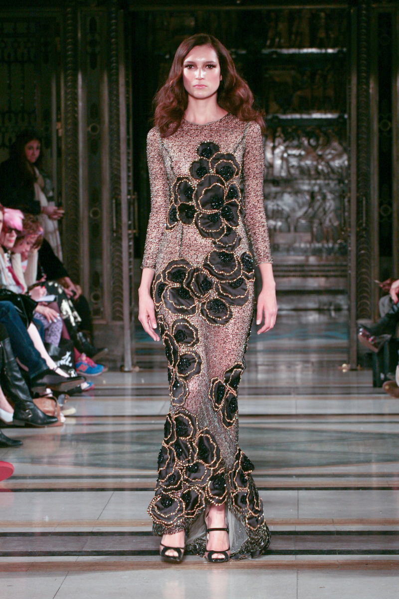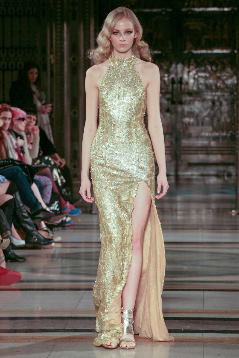 Mimi Tran boasts design elegance in her aptly named Red Carpet Collection, delivering a vibrant showcase for autumn/winter 2015 that was big on drama. Bringing classic glamour to the LFW runway, Mimi’s designs took a contemporary turn as figure-hugging gowns were adorned with masses of jewelled embellishment.