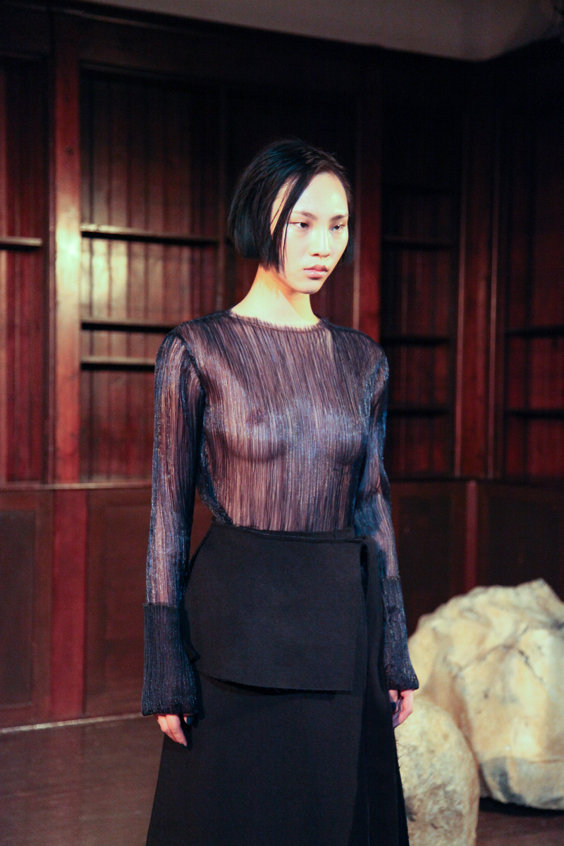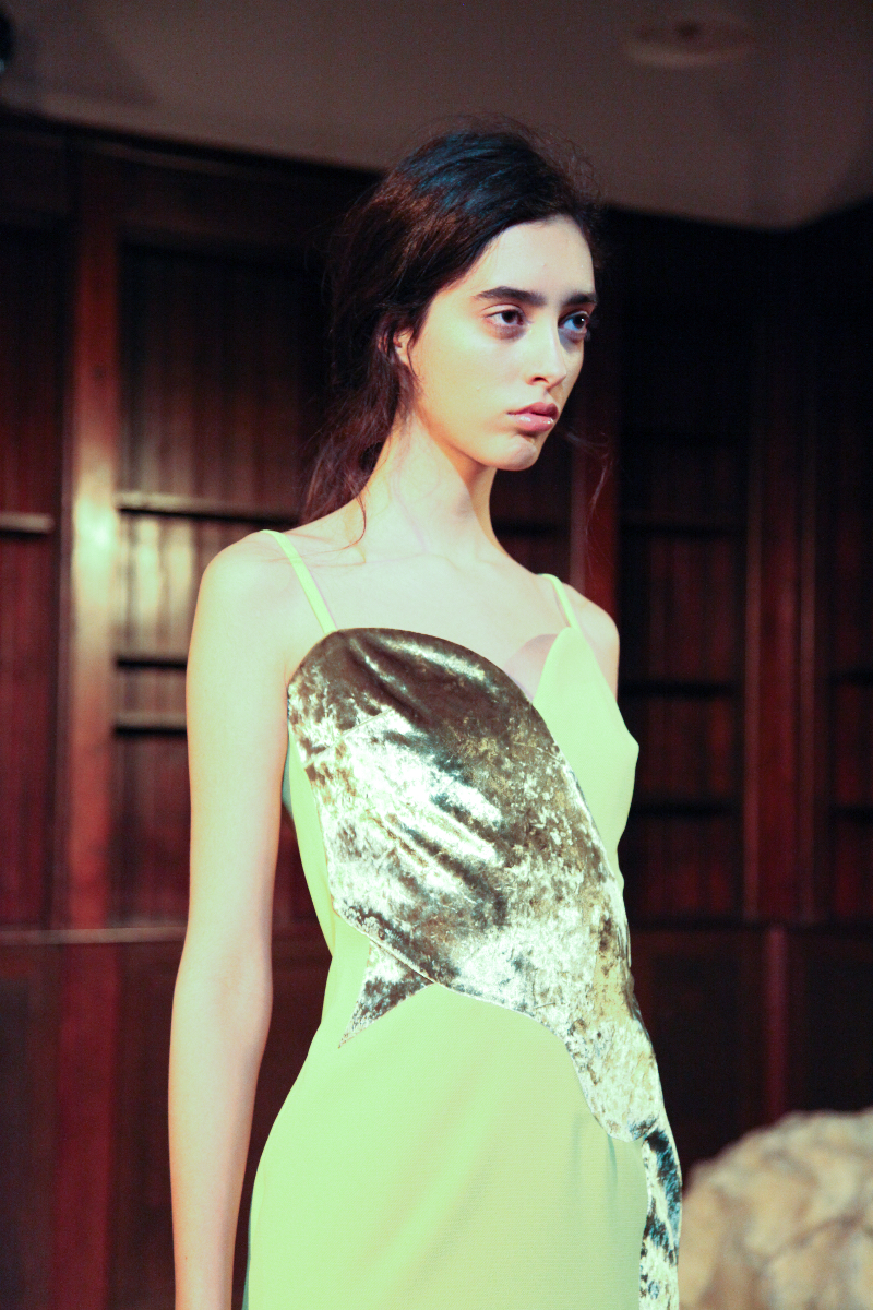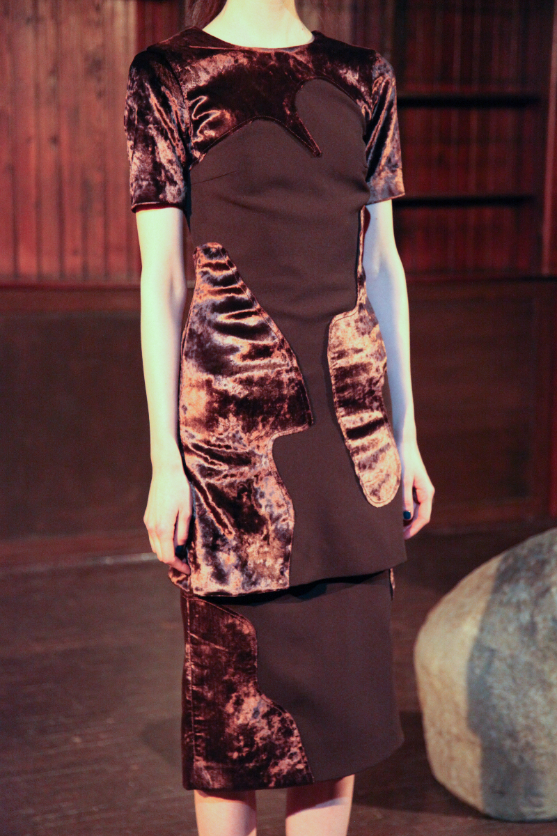 Pyo understands how nature contrasts with itself in its most basic form, and she has managed to capture this in her clothing, balancing materials with cuts and finishes, creating individual pieces that are truly unique. She mixed velvet with satin, created asymmetric patterns and finished them with straight and free-flowing cuts to create an inherently contradicted collection.
