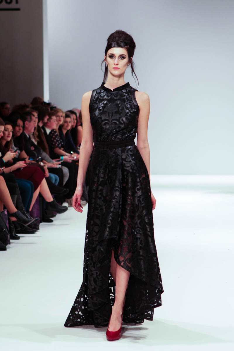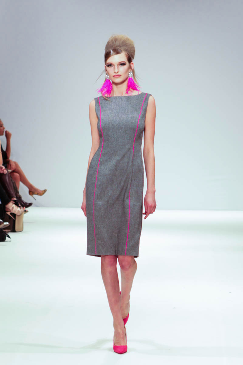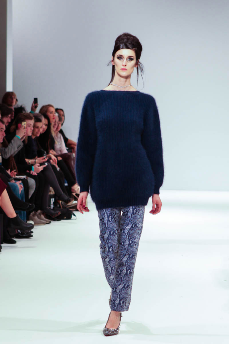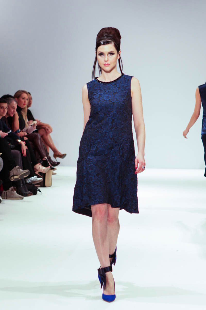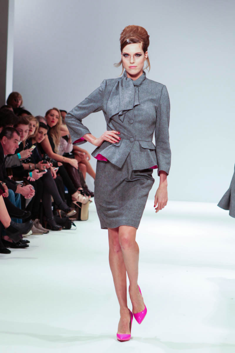 Aptly named The Dolls, the collection is inspired by the beauty and style of these well-loved figures. Models strutted down the catwalk sporting 60s-esque beehives in royal blue gowns, textured silver dress coats and midi skirts printed with images of china dolls. Cuts were clean, feminine and elegant, with woollen dresses and straight coats featuring hot pink linings.