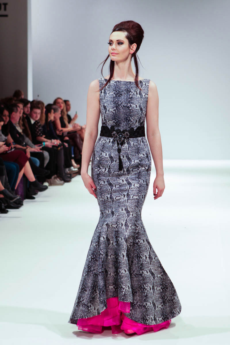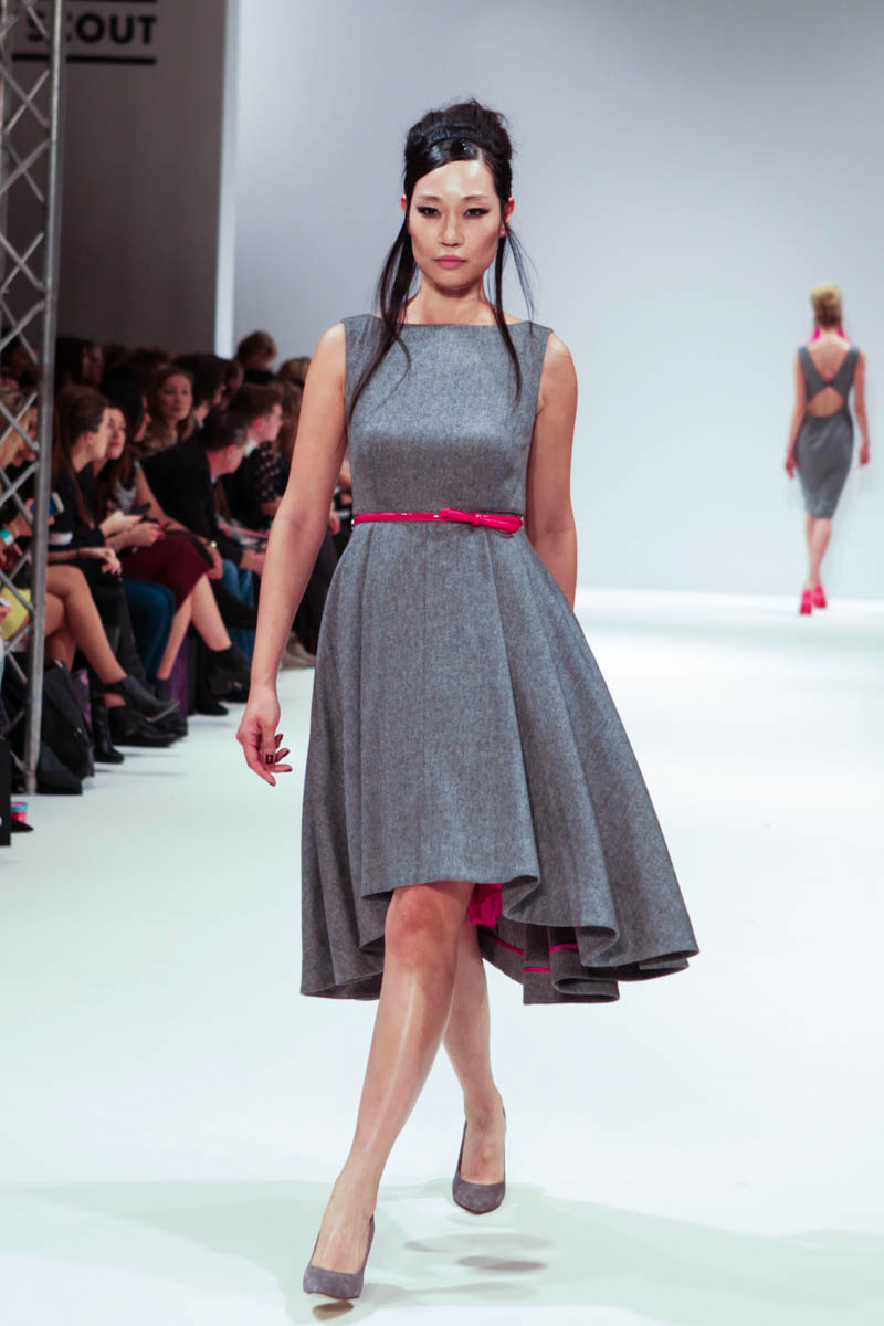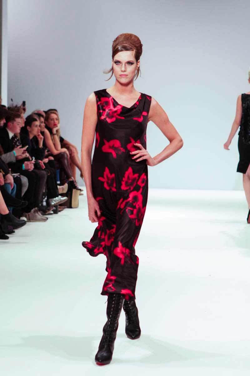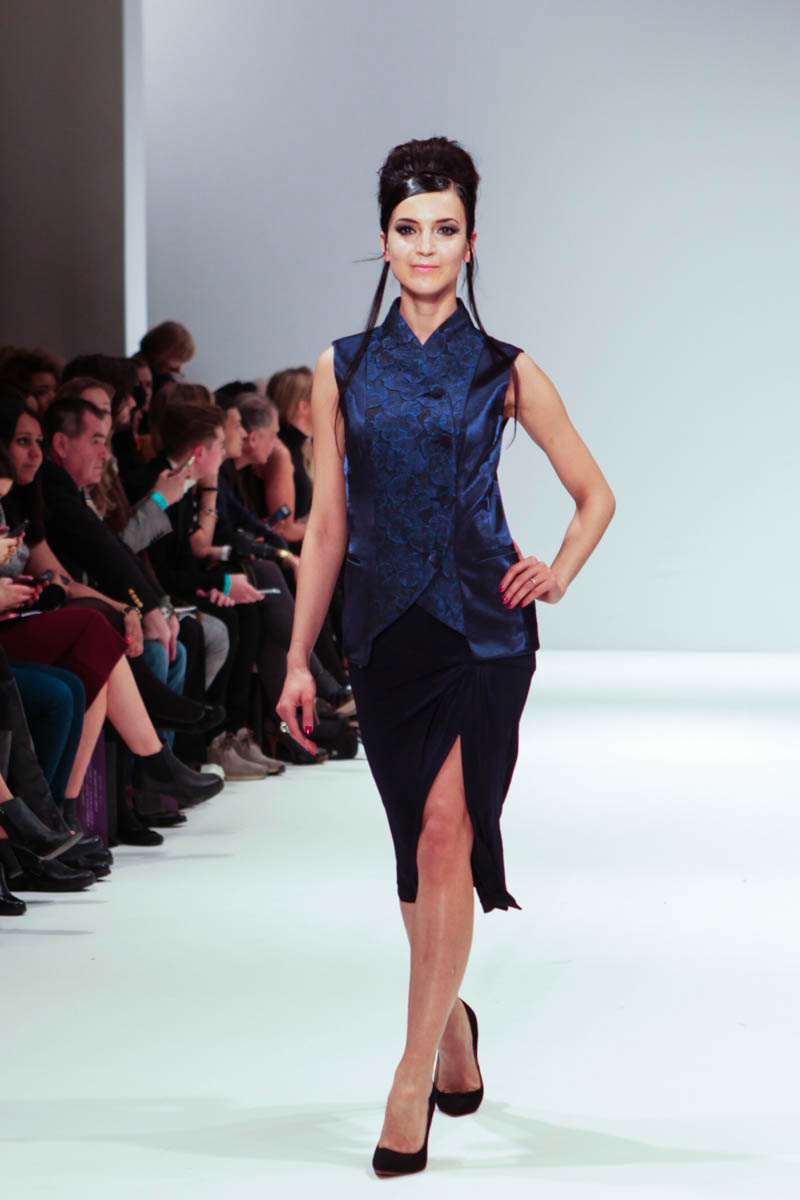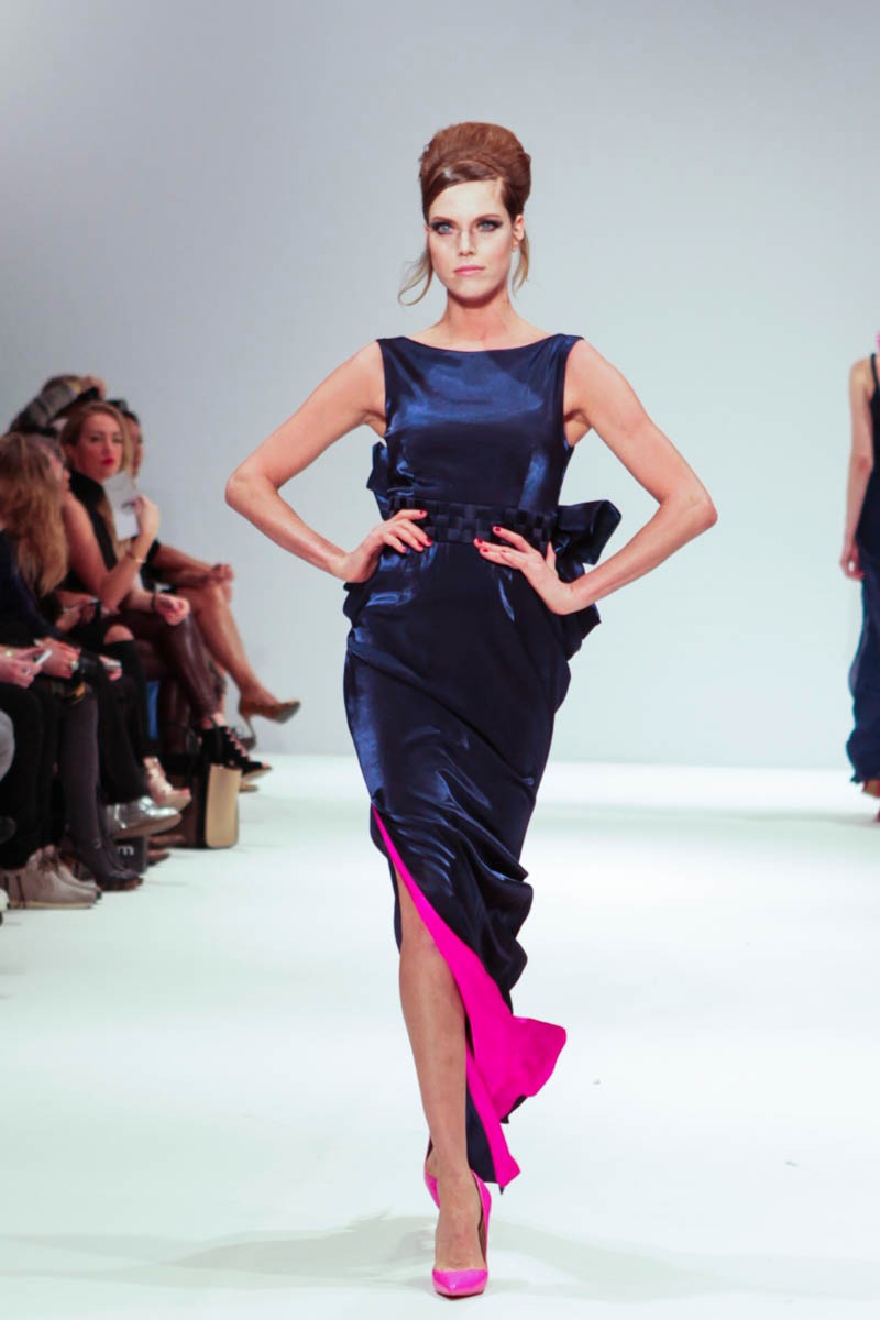 Aptly named The Dolls, the collection is inspired by the beauty and style of these well-loved figures. Models strutted down the catwalk sporting 60s-esque beehives in royal blue gowns, textured silver dress coats and midi skirts printed with images of china dolls. Cuts were clean, feminine and elegant, with woollen dresses and straight coats featuring hot pink linings.