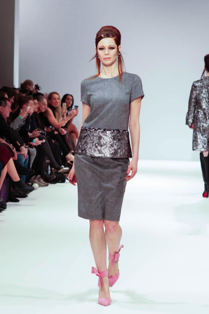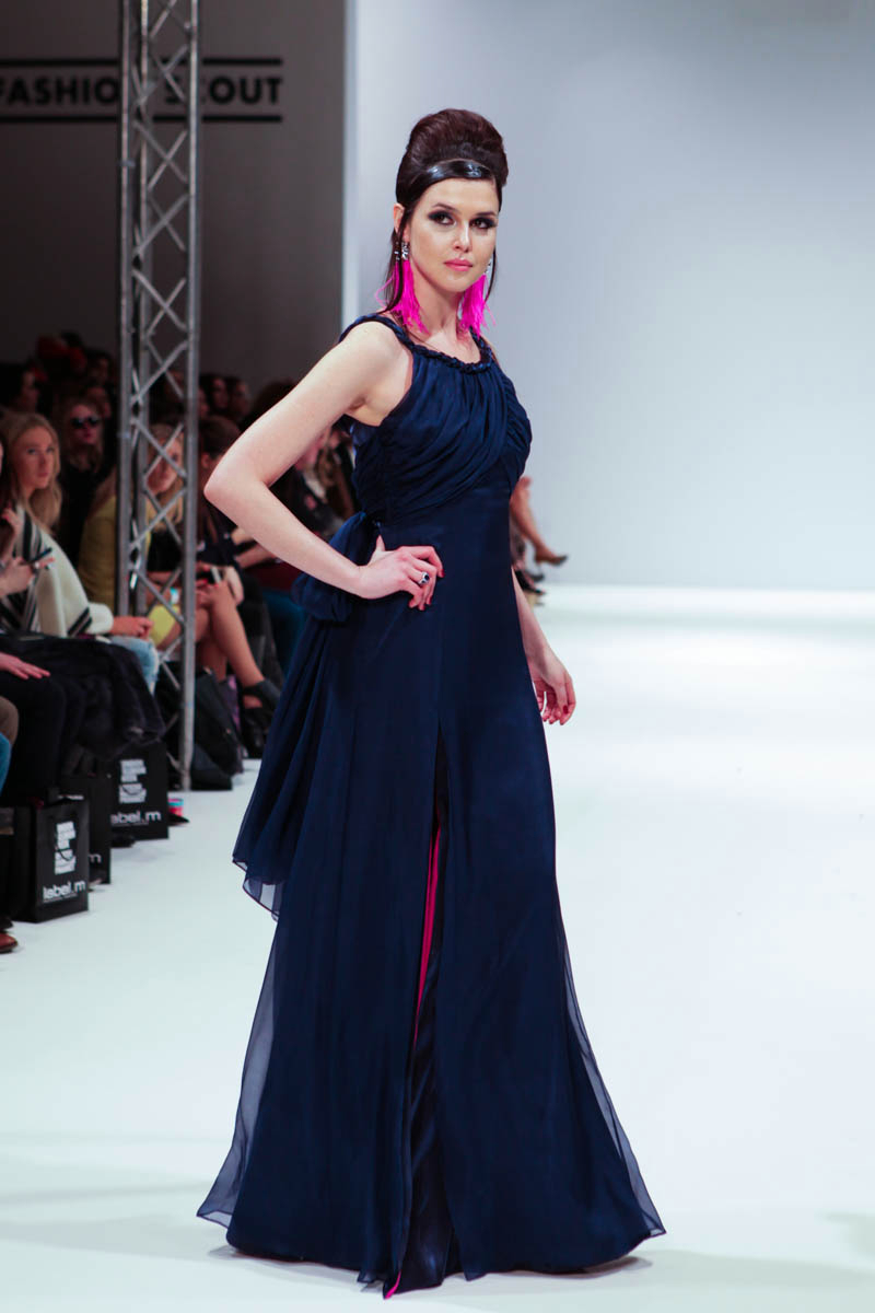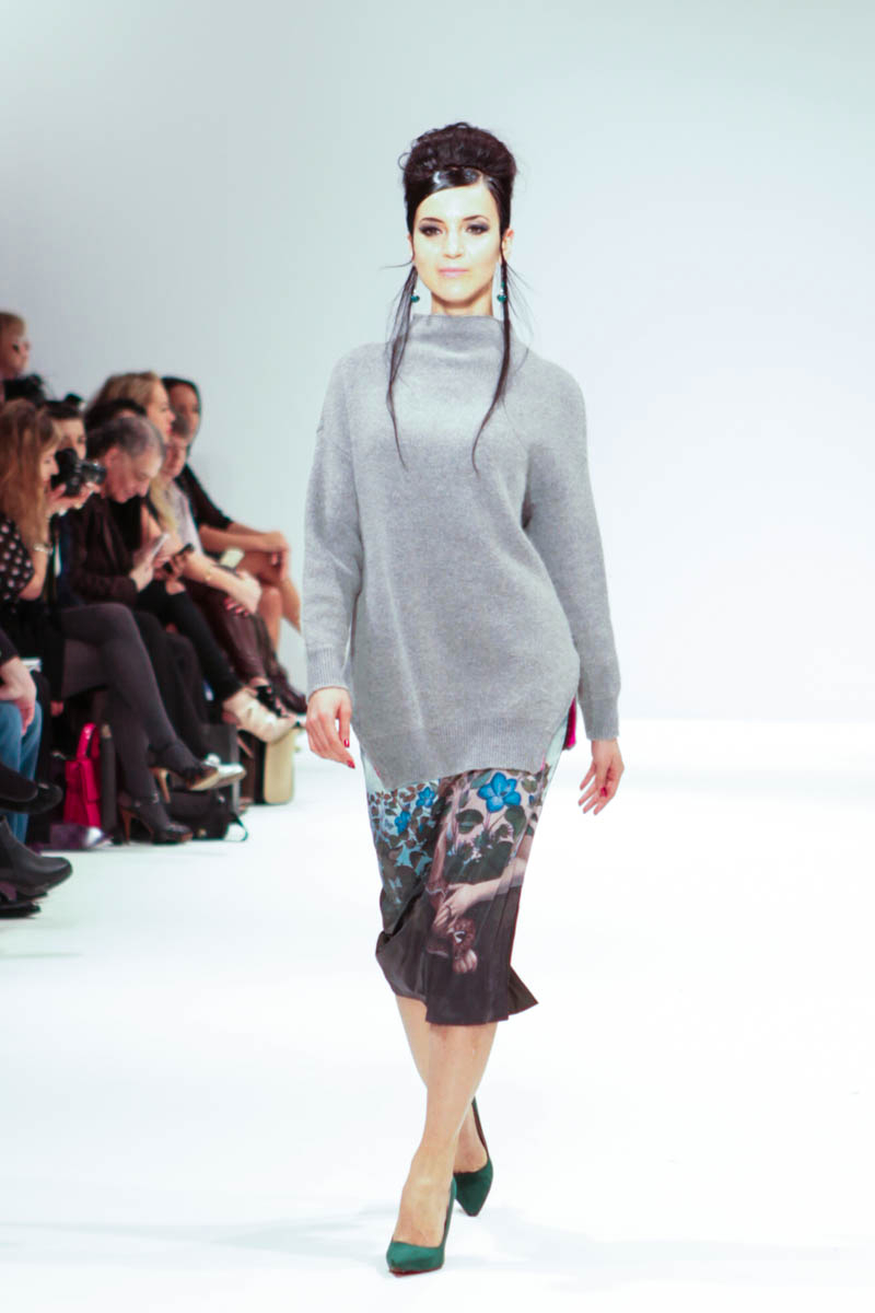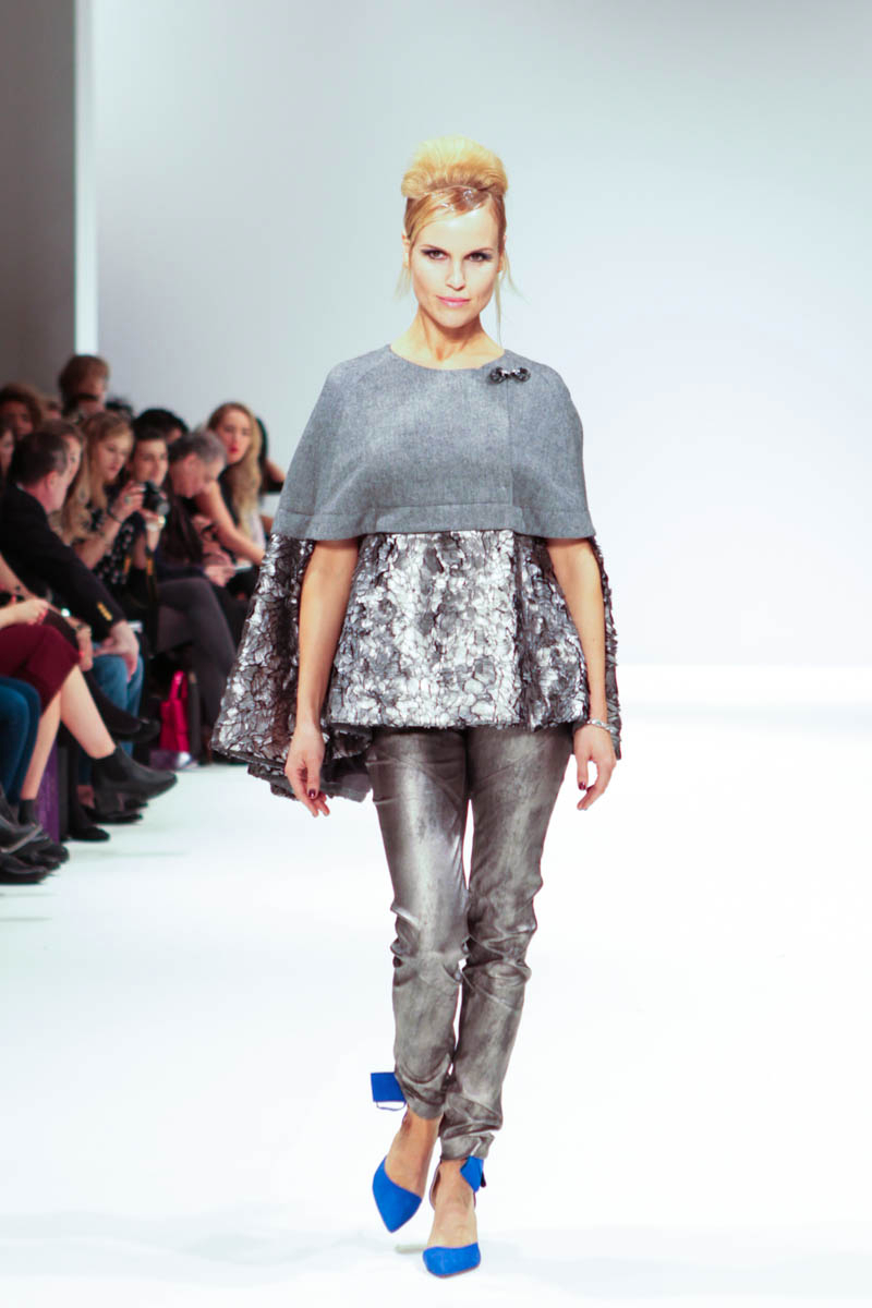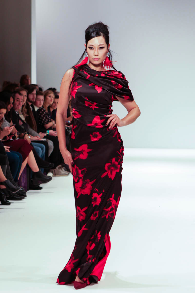Aptly named The Dolls, the collection is inspired by the beauty and style of these well-loved figures. Models strutted down the catwalk sporting 60s-esque beehives in royal blue gowns, textured silver dress coats and midi skirts printed with images of china dolls. Cuts were clean, feminine and elegant, with woollen dresses and straight coats featuring hot pink linings.