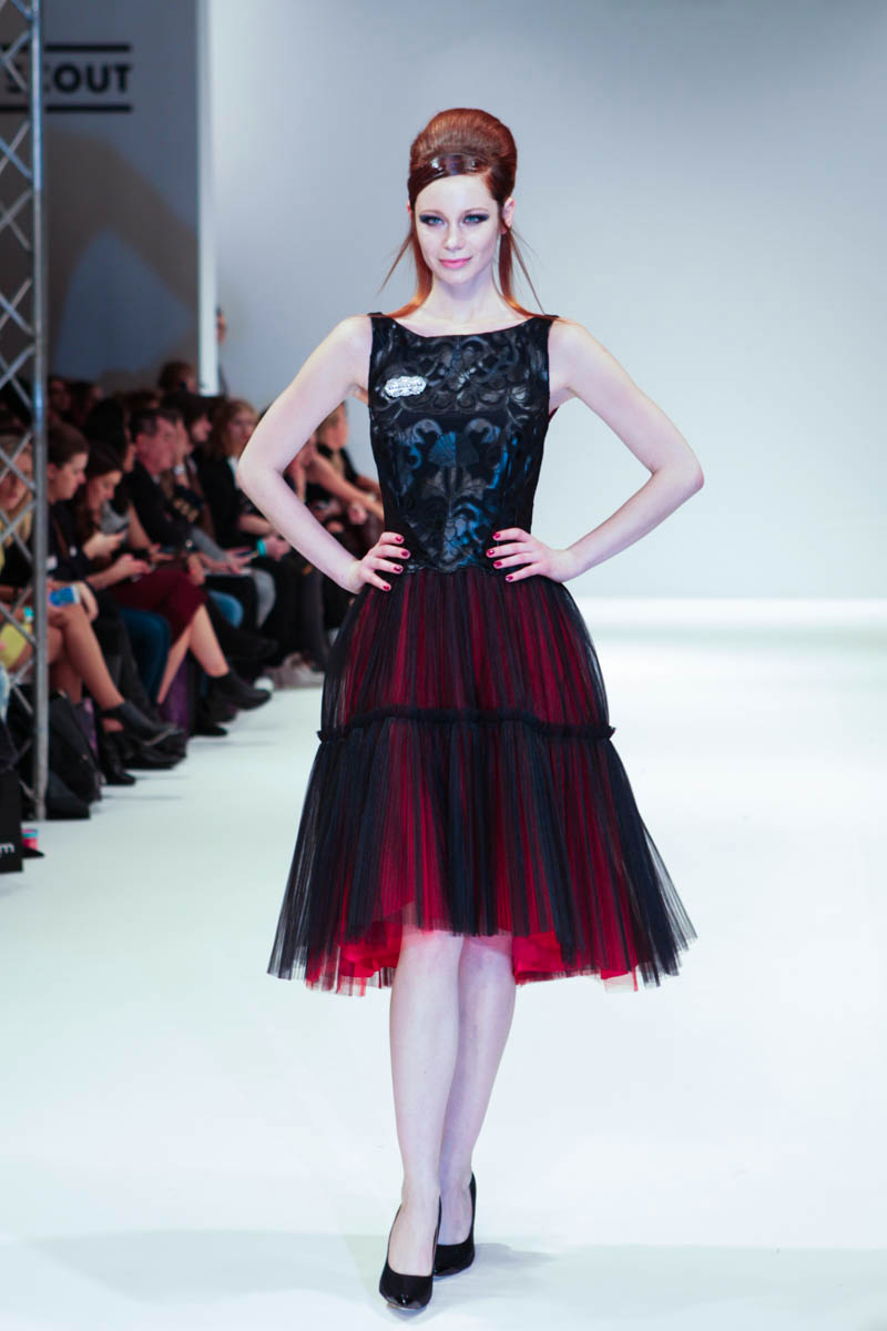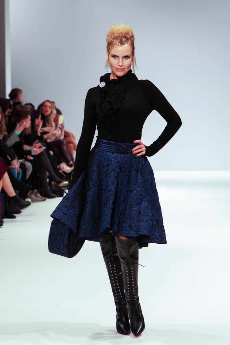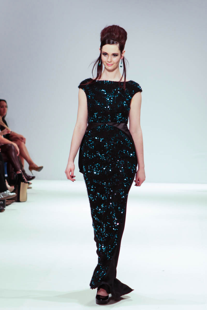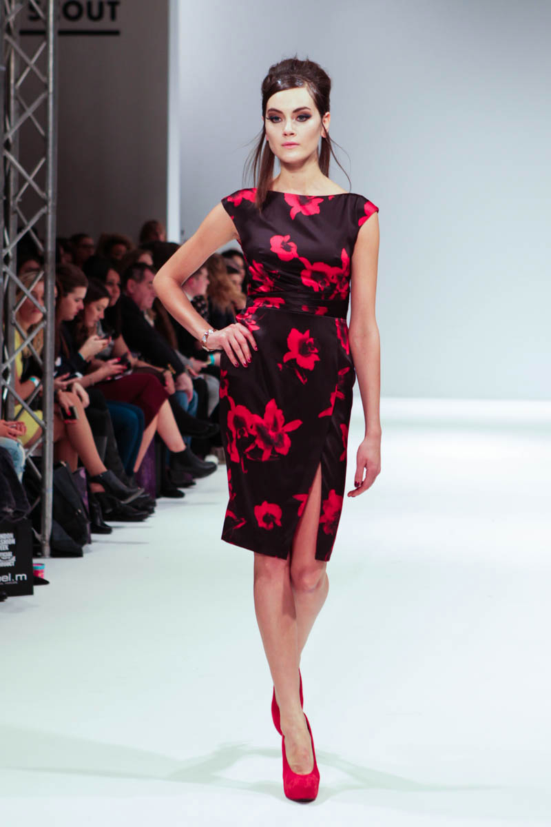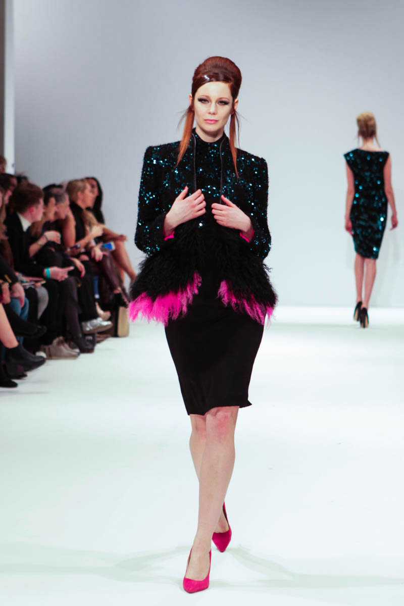 Aptly named The Dolls, the collection is inspired by the beauty and style of these well-loved figures. Models strutted down the catwalk sporting 60s-esque beehives in royal blue gowns, textured silver dress coats and midi skirts printed with images of china dolls. Cuts were clean, feminine and elegant, with woollen dresses and straight coats featuring hot pink linings.
