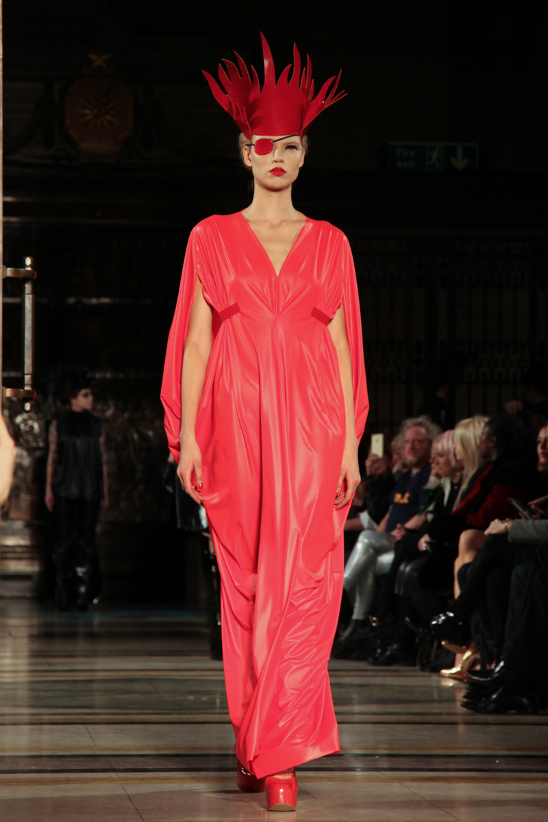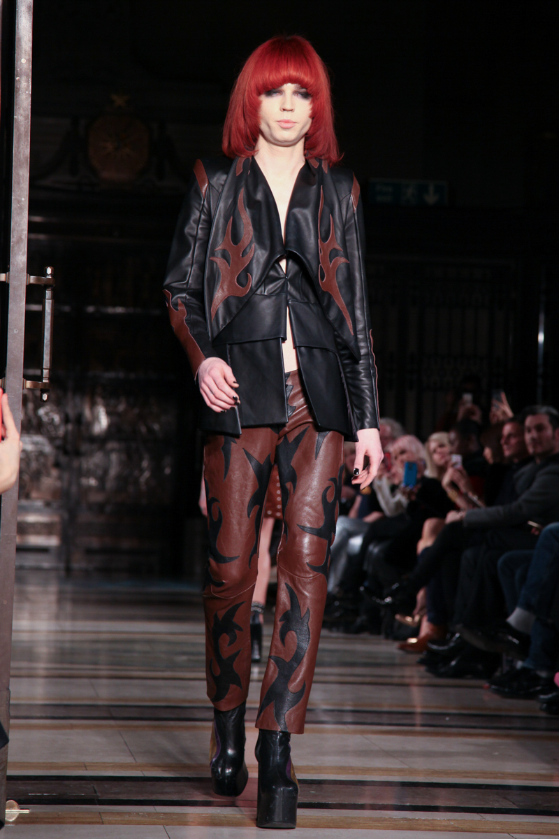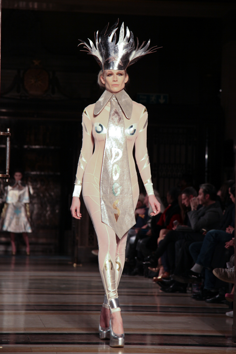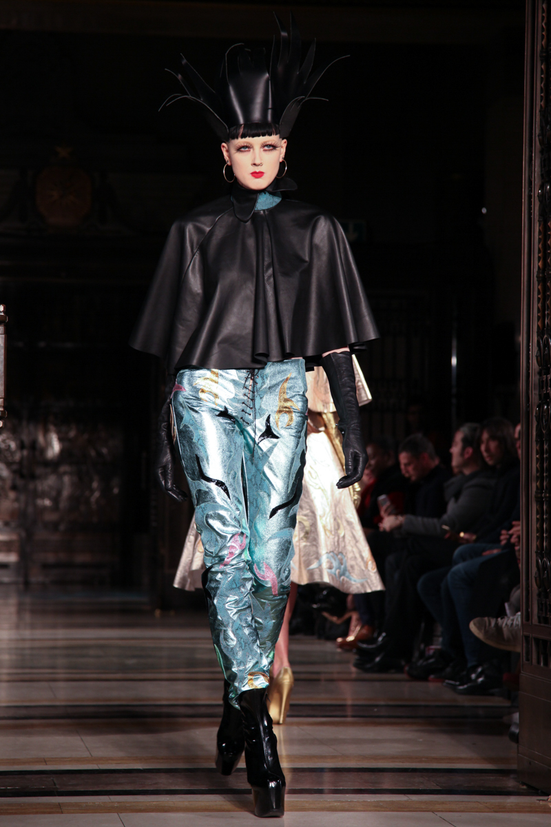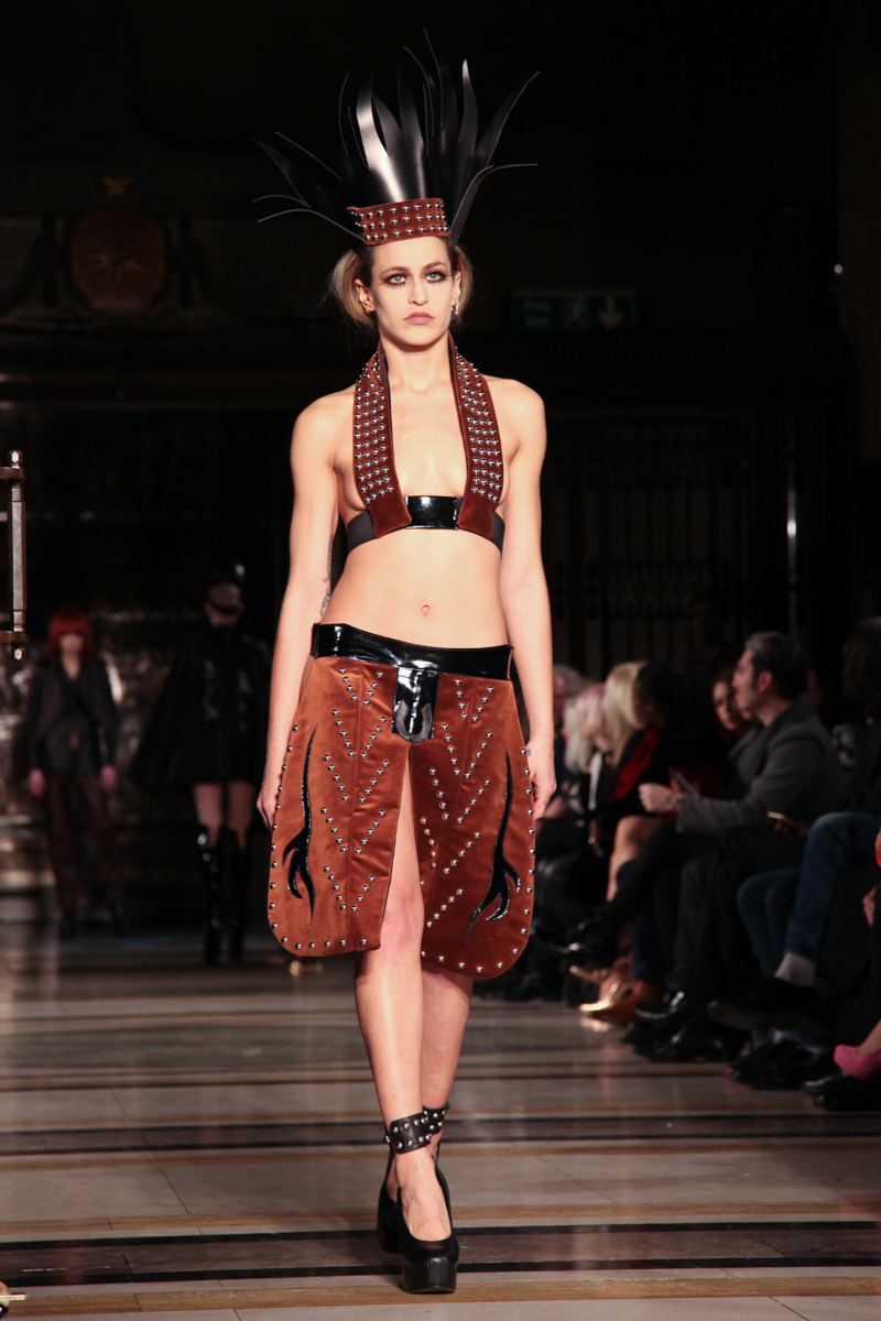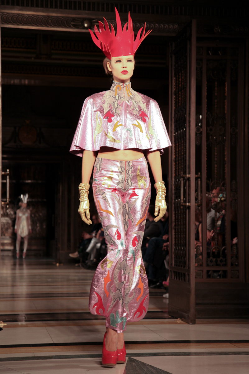 Pam Hogg presented a wild punk autumn/winter 2015 collection at the Freemasons’ Hall for London Fashion Week. The new looks were daring and exuberant. Here are our images from the show.