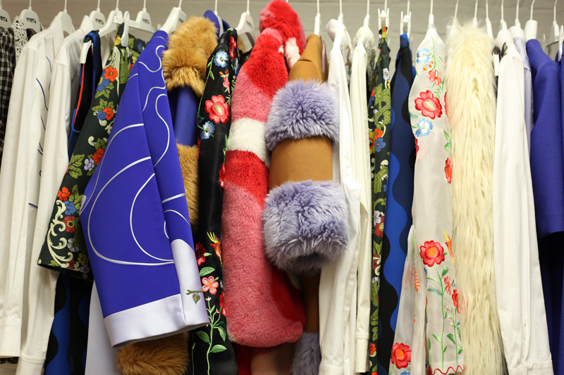 A Harajuku-esque collection came from the London-based rising star Clio Peppiatt. The extremely bright and colourful graphic designs inspired a sugary-sweet and fun feel bringing joy to all attendees. The collection favourite was a bright, yellow-sleeved jacket with a spotted faux fur texture, covered with hearts and assorted pink and white buttons embellishing its front.