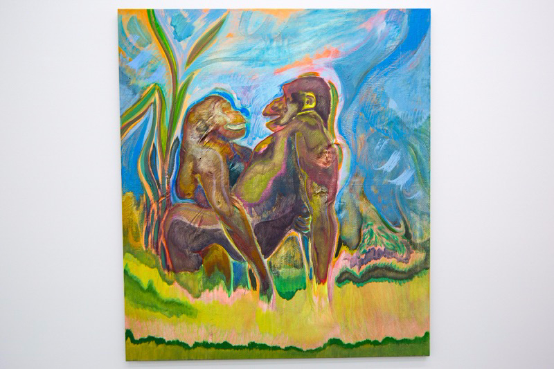 These freely streaming narratives are mirrored by the fluidity of the brush strokes used to form both the background environment and the characters portrayed. Armitage has a unique canvas, painting with oils on Lubugo, a traditional bark cloth from Uganda. This enables him to create an expressive texture to the compositions. The artist makes thorough use of the colour palette but does not blend the solid hues together, instead letting them stand on their own. The result is free, creative and unrestricted, and it gives the viewer a vast painterly world to observe and absorb.