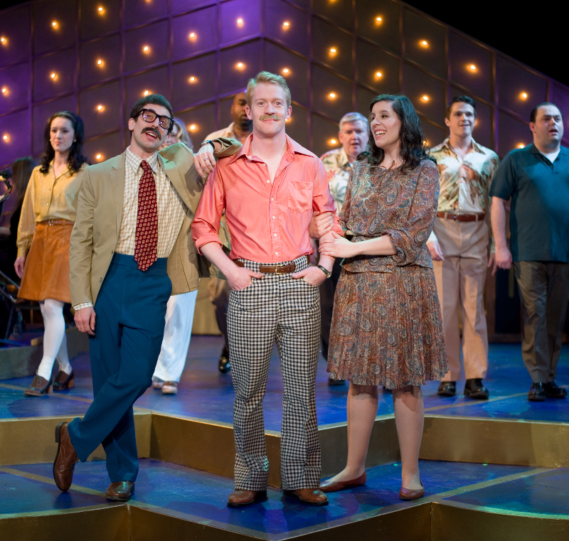 Like Sondheim’s other musicals, Merrily We Roll Along is stunningly innovative. The 20-year friendship of composer Frank (Jack Mosbacher), lyricist/playwright Charley (Nicholas Park) and writer Mary (Ally Bonino) reveals itself in reverse chronological order, mainly occurring at a familiar Sondheim plot device, the cocktail party. Director Dev Bondarin wisely keeps the orchestration and staging to a bare minimum. The talented, multitasking chorus bridges the period of 1957-1977 moving what little scenery there is, taking on minor parts, singing about key world events of the featured year, and wearing unflattering styles from those two decades.