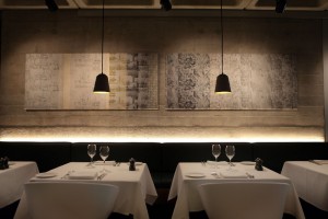 The false ceiling and wall-coverings have been removed to expose the original concrete beneath. Metal pendant lights hang over each table, illuminating the pressed white tablecloths. The bar has become the focal point, emanating a 007 vibe with Martini glasses and full-length mirrors. Canvases that adorn the feature walls imprint a personal mark, but it all feels a little uncomfortable
