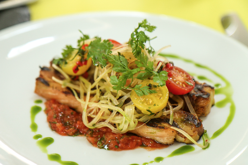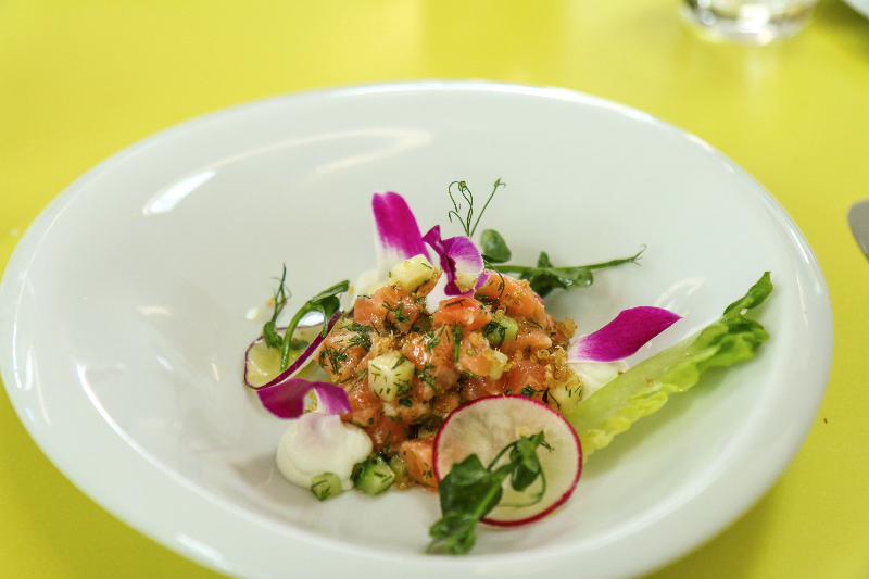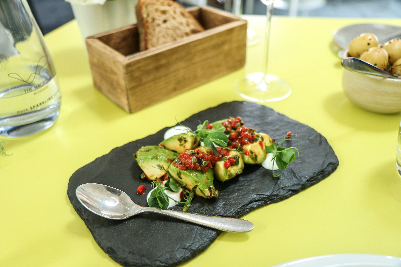With the comfort of home-made bread with butter, sipping two refreshing signature cocktails – Elderberry and Stem Ginger Collins and Blackberry and Coriander Margarita – we analyse the balanced menu and decide to try the Scottish Salmon Tartare, Granny Smith and Radishes and the Scrambled Eggs, H Forman & Son’s Smoked Salmon, Dill Crème Fraîche for starters.
