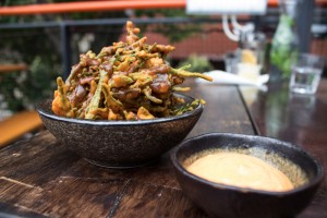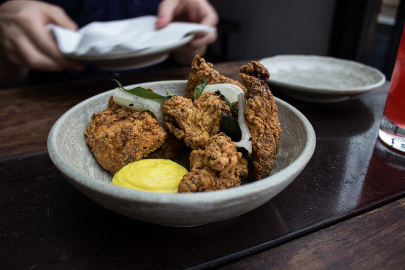 Samphire Pakoras comes next, stacked high and drizzled with date and tamarind chutney. It’s not a dish that would seem to be screaming out for a sweet addition but it actually works surprisingly well. There’s not a hint of grease in the batter, which breaks with a satisfying crunch to reveal salty green tendrils of samphire hidden within. The real gem is Keralan Fried Chicken. Its mundane exterior hiding a thin layer of spicy marinade on the surface of the meat that cuts through the richness of the dish perfectly. There’s a real tang to it, an aromatic sucker punch that catches your taste buds entirely off guard. This is fried chicken taken to a whole new level, an impressive evolution of an ubiquitous food.