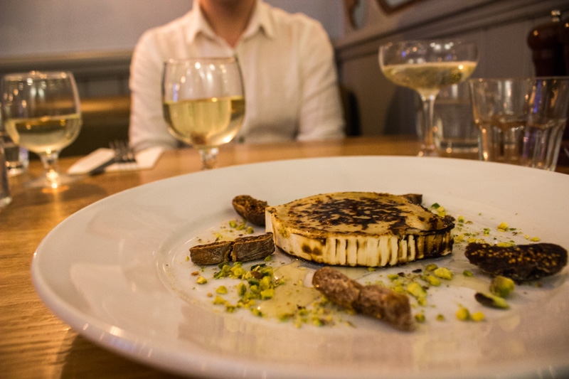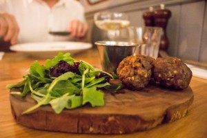 We start with the most interesting dish on the menu. Grilled Goat’s Cheese with Figs, Honey and Pistachio reads like a dream and tastes like it too. The sweet flavour of the honey and dried fruit is a classic contrast to the saltier, more pungent taste of the cheese, and the rich, nutty sprinklings of pistachio harmonise well with both. We are sceptical about the value of charring either side but the gentle smokiness from the grill really does add an extra dimension to the dish. Chili Meatballs with Tzatziki packs a definite punch, dense and meaty with a real slug of heat. The tzatziki is a little light on the garlic but cools the spicy meat perfectly.