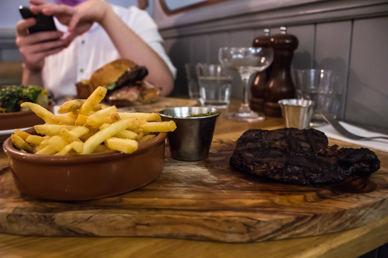A well-done Rib-Eye Steak draws some worry from the waitress, who really does recommend that we have it medium. The mark of an excellent kitchen, however, is being able to cook a steak to the customer’s preference. At an exemplary offering, such as Hawksmoor, you can get one done to perfection however you want it. The trick is to give the meat a quick sear on either side, then position it and keep the temperature low, ensuring a well-cooked steak that’s still juicy. In this case, it’s clear that the steak has been cooked according to the standard method, the result of which is not especially pretty. It looks much worse than it will turn out to be, but there’s no denying that the outside is burnt, tasting less of the grill than of the charcoal – a shame, because this is clearly an excellent steak, well-sourced from a grass-fed cow. Cut away the crust though and there’s still some beautifully succulent meat inside, so the entire thing isn’t a bust. And it’s not as if we can say that they didn’t warn us.