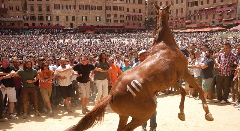 “The Palio is a game, not a race” more than one participant observes in Cosima Spender’s documentary – and the name of that game is “legitimate corruption”. On 2nd July and 16th August, Il Campo’s central piazza in the Italian city of Siena is transformed into a race track for the biannual old-age horse race: the Palio. The city’s denizens cheer as jockeys ride bareback around the tight, near-rectilinear corners, while money changes hands to give one district advantage over another. It is ritual and tradition that dictates here. Spender’s Palio shines a light on the arcane unknown to demystify a sport dominated by corruption.