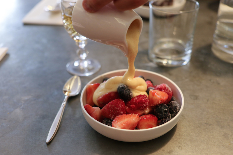 For the greedy, there’s also a small but delicious selection of desserts. Being a chocolate junkie, I let the Brownie, Persian Fairy Floss, Purbeck Vanilla Bean Ice Cream tempt me: it respects rule number one – chocolate desserts need to strongly taste of chocolate – and the fluffy Persian candy floss reminds me of my childhood. However, it’s the Mixed Berries, Topped With Loupiac Sabayon that steals the show. Pouring the thick, creamy sabayon over the berries is an immense pleasure.