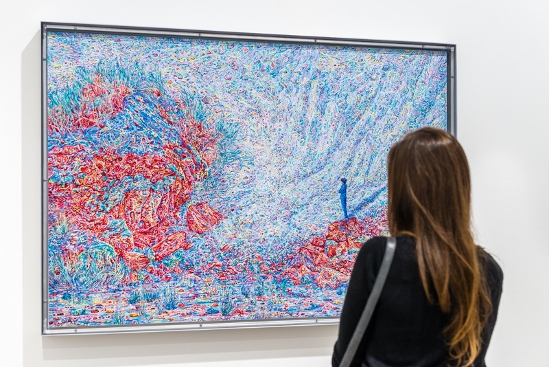 While different colours dance together in untameable, tangled mixtures, there is often a human figure or two, maybe invisible at first sight, but always there. There is the young boy, staring at the viewer with eyes full of wonder and isolation, in the stunningly blue The Battle of Nant y Coed. He is almost hidden in the endless branches yet also defines them. Then there is the striking Perfect World, which sees a boy and girl in the middle of a lush forest. Somehow, they look lost, away from the composition, but they also appear to be part of it at the same time.