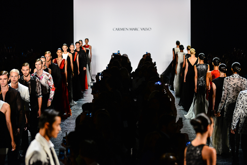 Carmen Marc Valvo presented a delightful spring/summer 2016 collection at The Arcfor New York Fashion Week. The new looks were filled with geo-prints and pops of bright floral prints on dresses and one-piece swimsuits. Here are our images from the show.