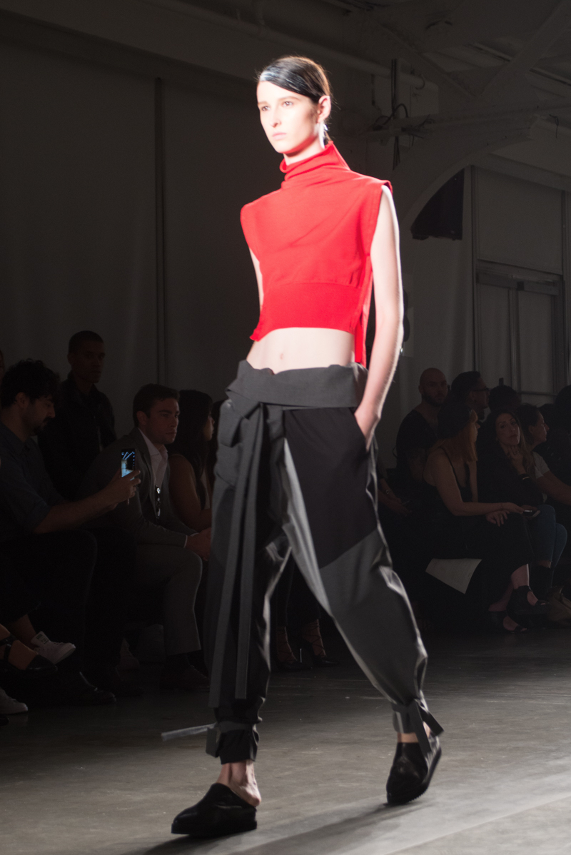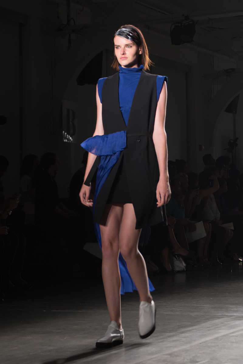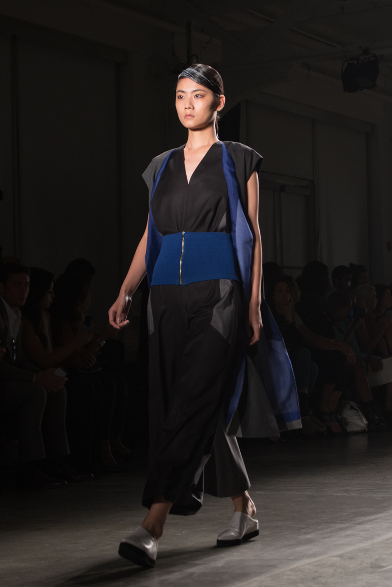 Titled “Balance”, the spring/summer 2016 collection is inspired by the Cheongsachorong gauze lantern. The blue and red lantern has come to symbolize balance and new beginnings. These colors along with the yin and yang of black and white bring harmony into the collection. The monotone of the black and white along with the pops of bold color are signatures of Park’s aesthetic. The sporty, masculinity of the streamlined pieces was balanced by the more feminine flowy, gauze fabrics. Complimenting the streamlined silhouettes were the slicked back ponytails of the models. Music by avant garde singer Kissey fit perfectly with the avant garde designs.