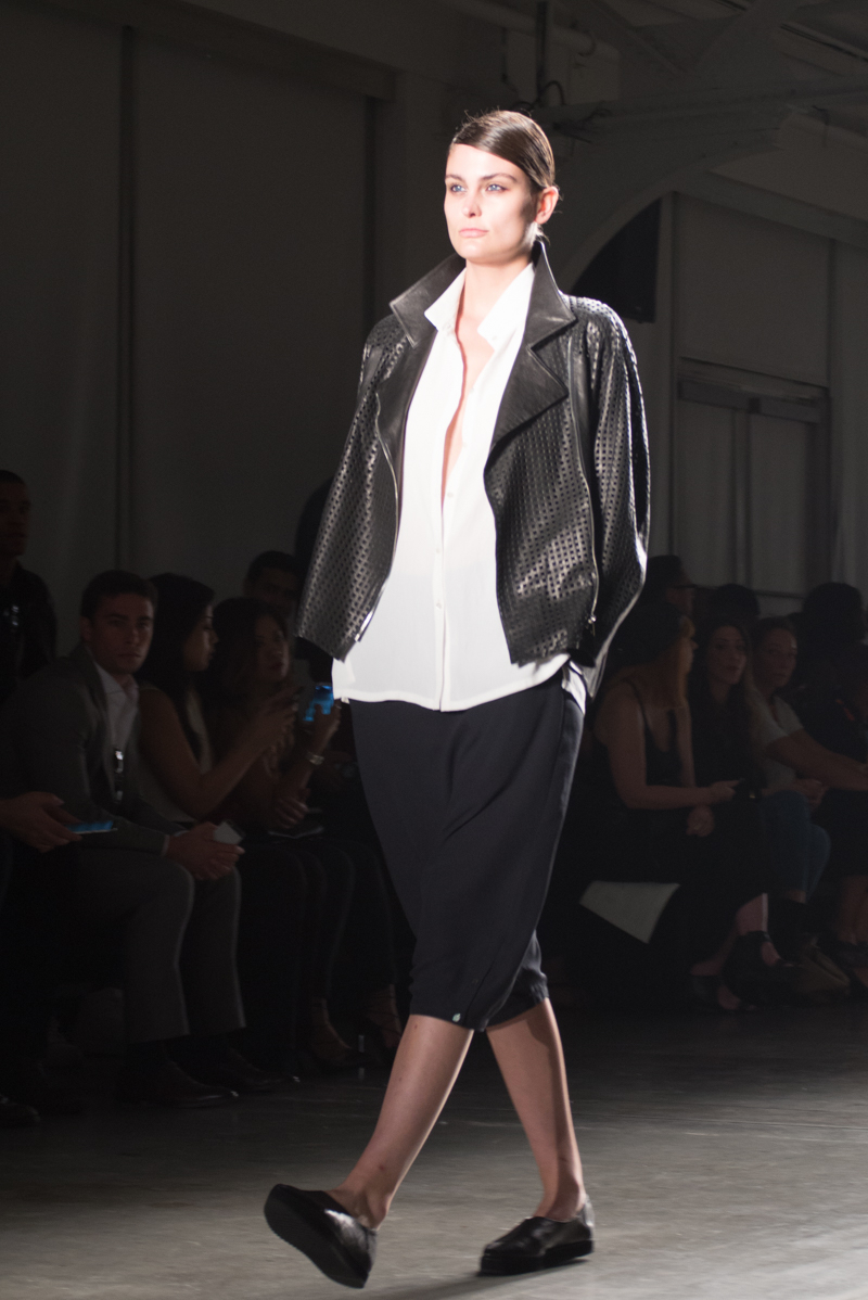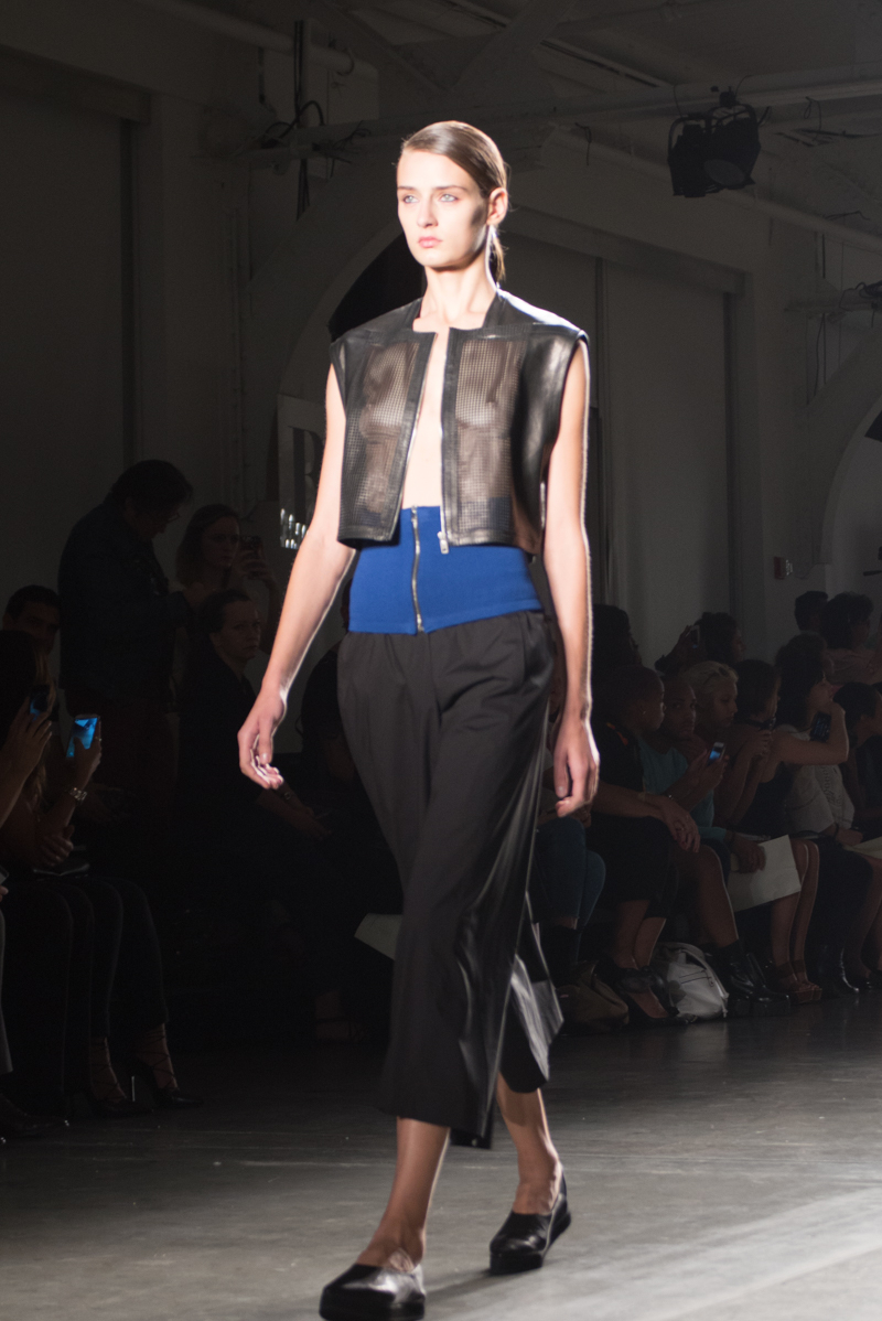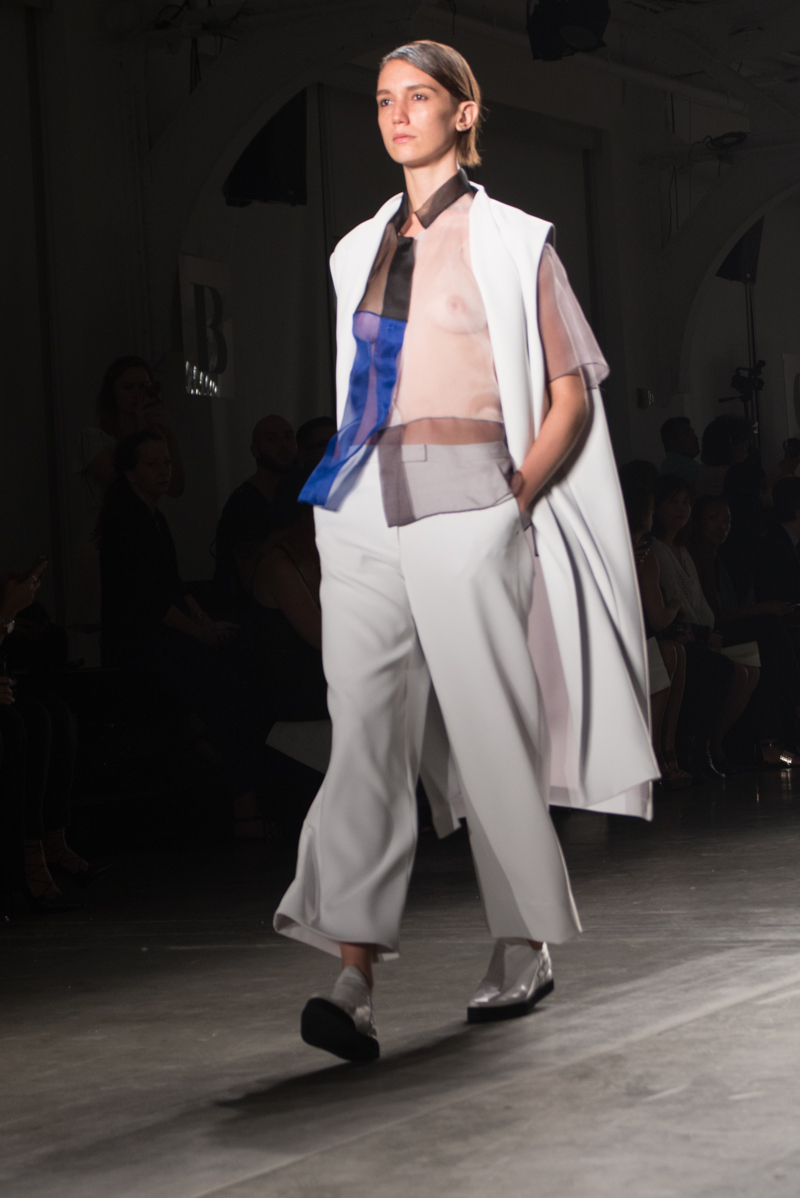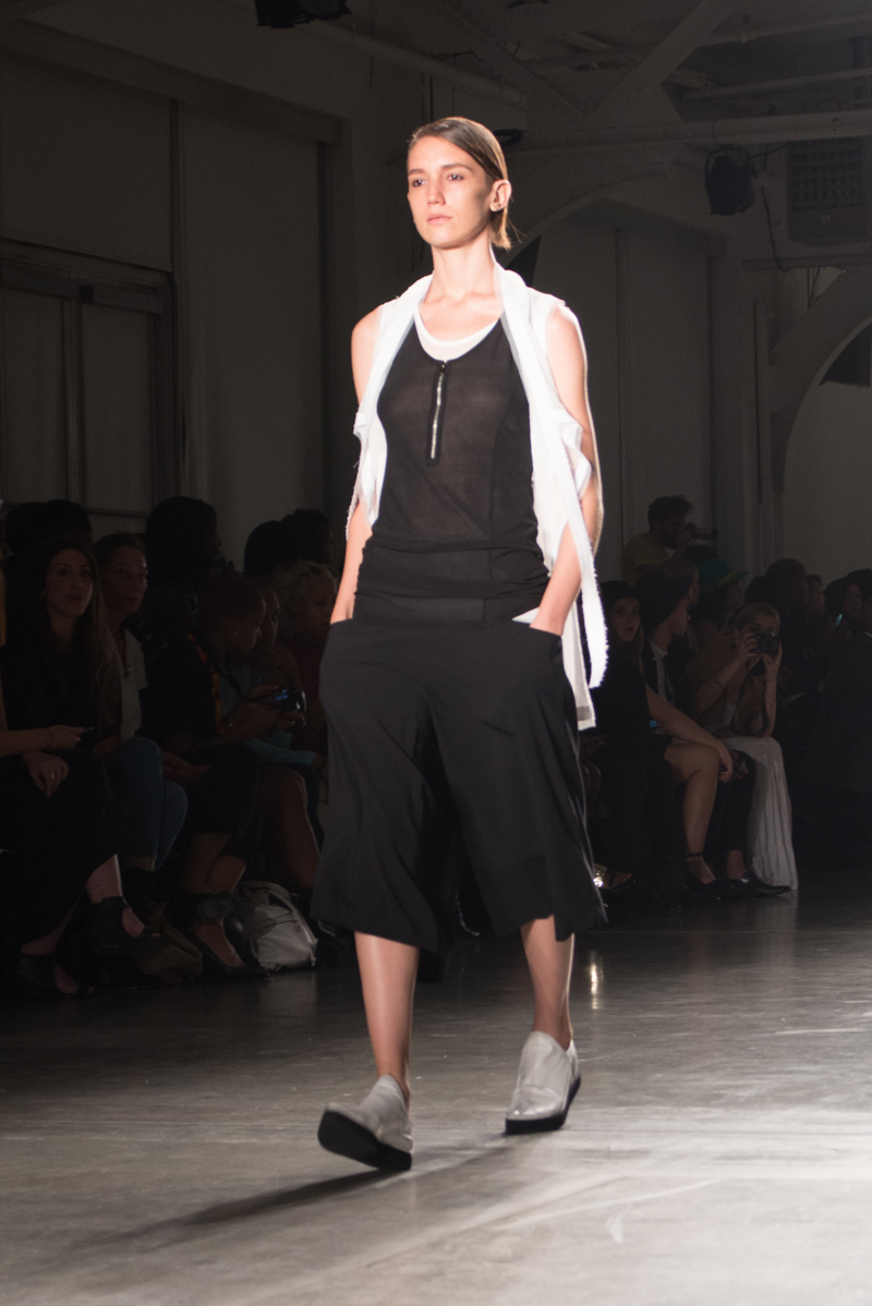 Titled “Balance”, the spring/summer 2016 collection is inspired by the Cheongsachorong gauze lantern. The blue and red lantern has come to symbolize balance and new beginnings. These colors along with the yin and yang of black and white bring harmony into the collection. The monotone of the black and white along with the pops of bold color are signatures of Park’s aesthetic. The sporty, masculinity of the streamlined pieces was balanced by the more feminine flowy, gauze fabrics. Complimenting the streamlined silhouettes were the slicked back ponytails of the models. Music by avant garde singer Kissey fit perfectly with the avant garde designs.