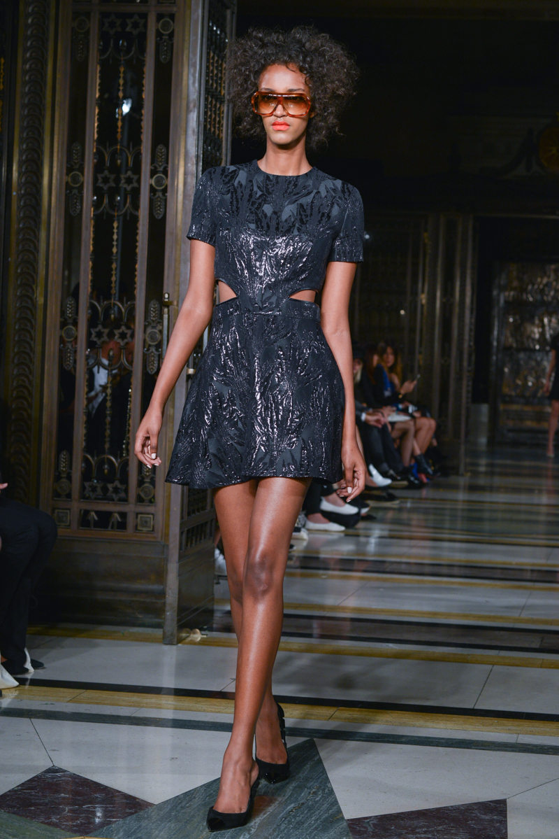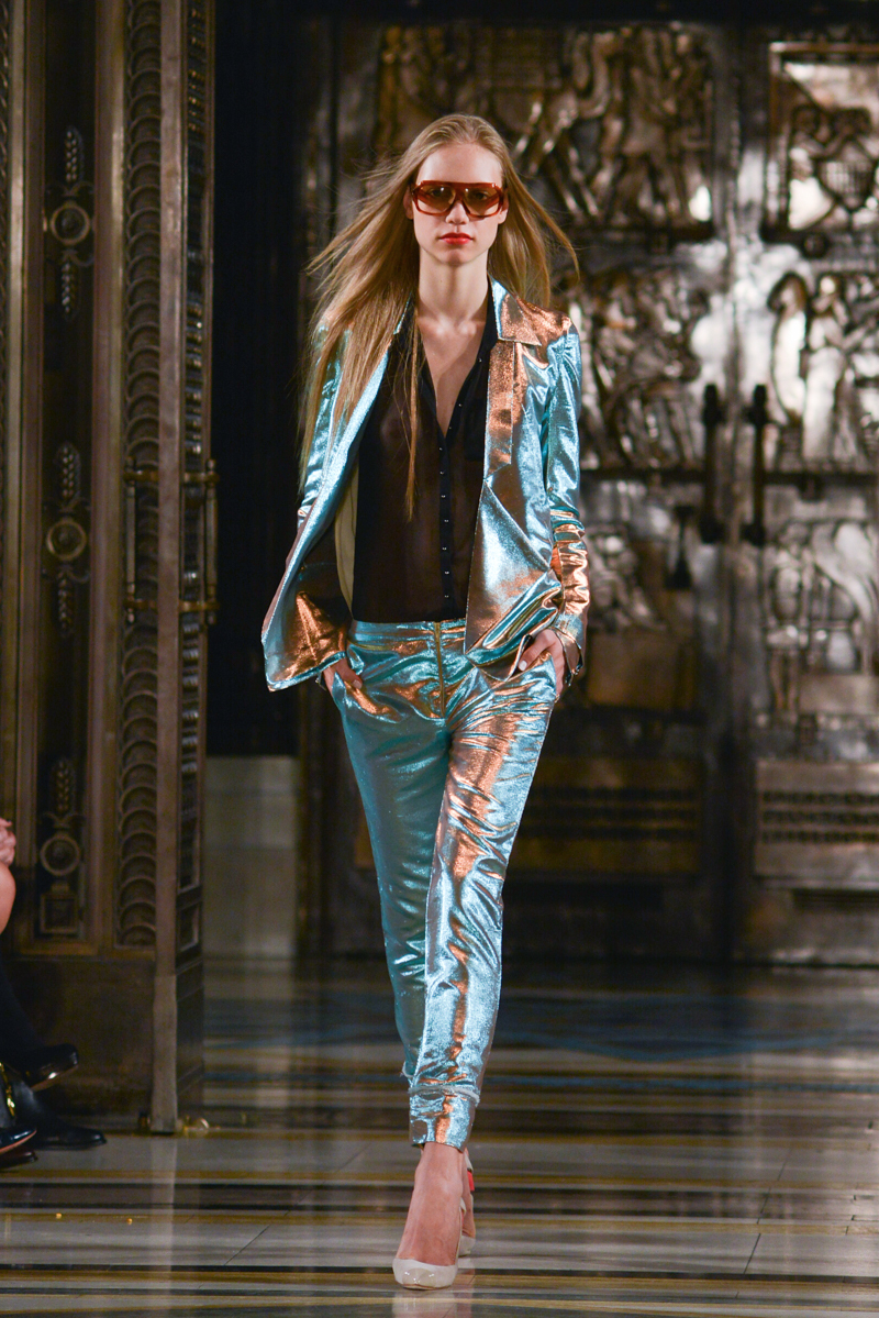 The show began with metallic dual-coloured soft foil jackets and cropped trousers in striking gold, turquoise, bronze and pink ombré. Super-sexy is the key to this collection; gloriously extreme miniskirts, sheer chiffon full-length gowns with thigh-high splits and cut-out backs (almost biker-style) juxtaposing figure-hugging pencil skirts and midi-length godet skirts.
