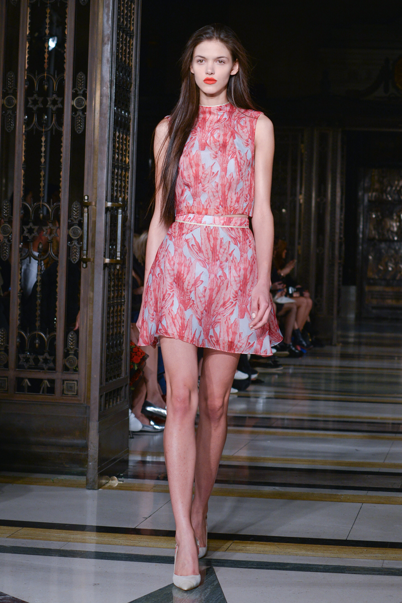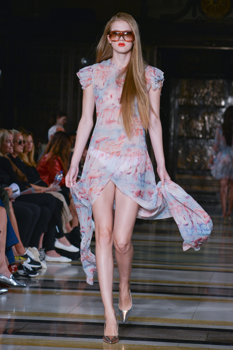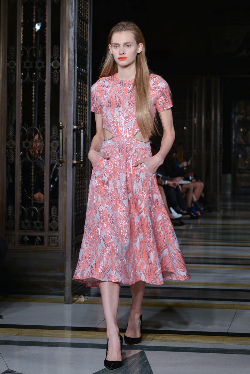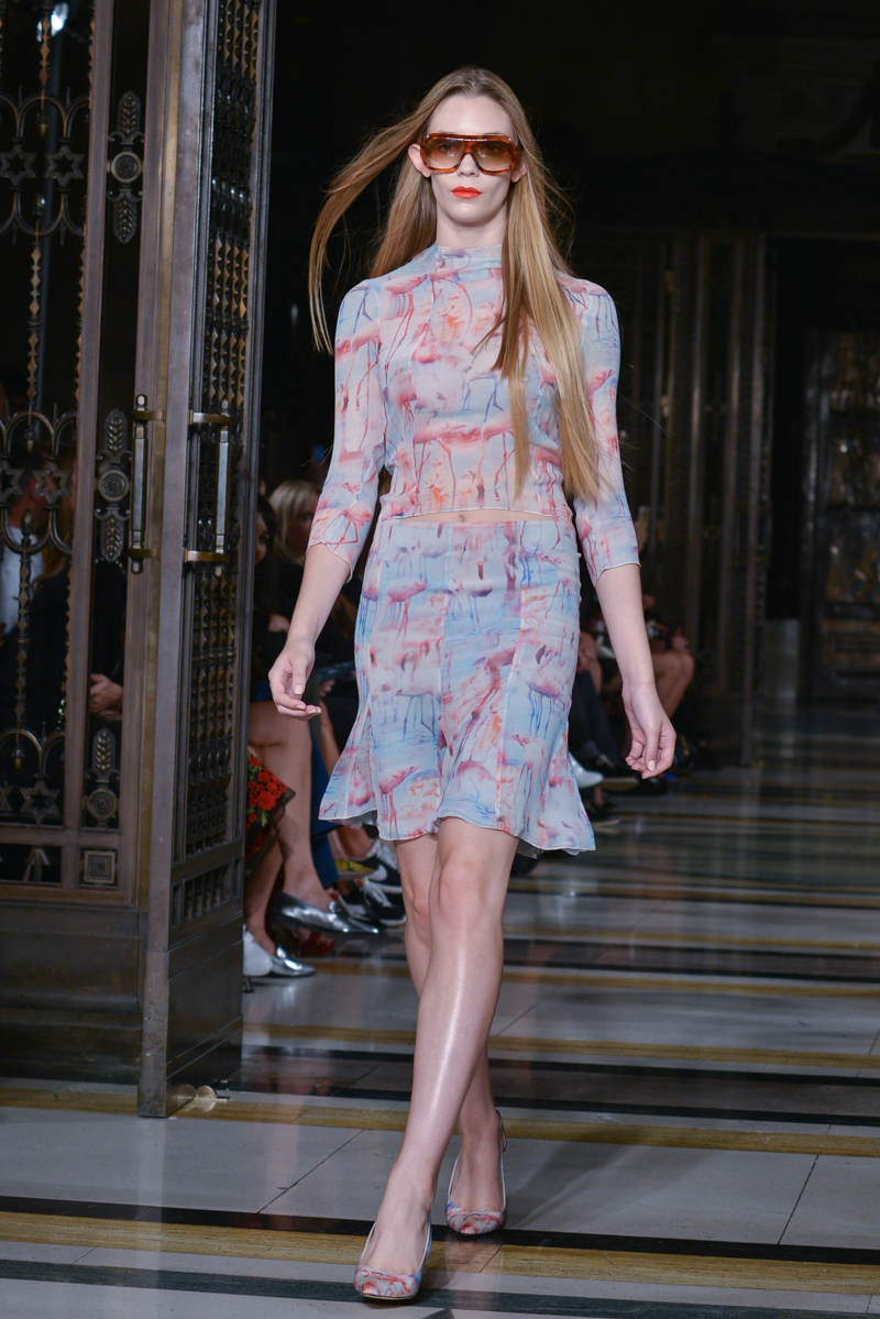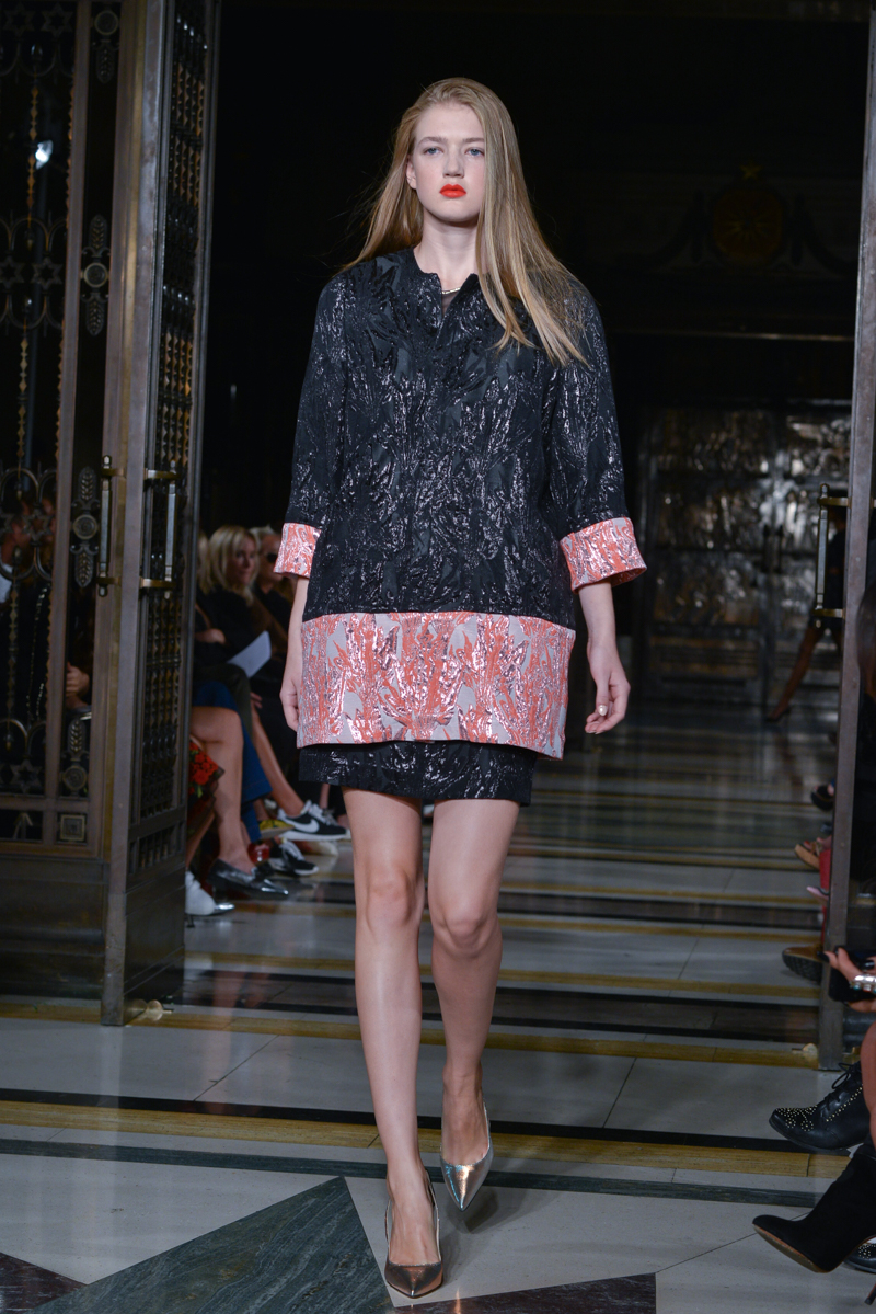 Made in Chelsea’s Milly Mackintosh watched on as the German-born design twins Daniela and Annette Felder presented Flamingo Flaneur for spring/summer 2016. Gorgeous tropical prints highlighted with bold flamingo feathers, stood against shimmering aqua and gold foil organzas, and jacquards – this collection oozed sensual, Miami cool.