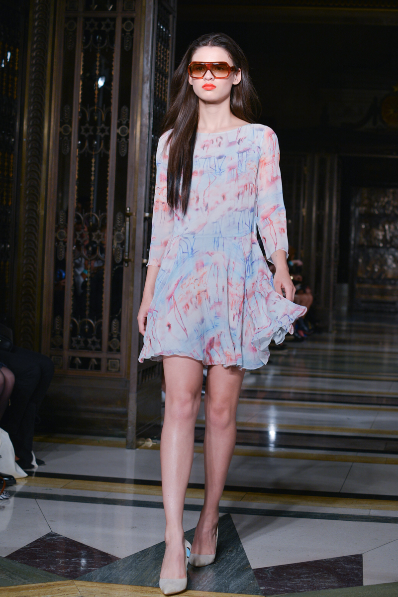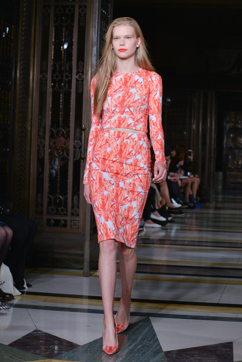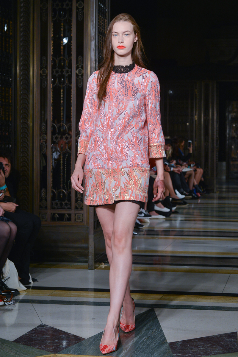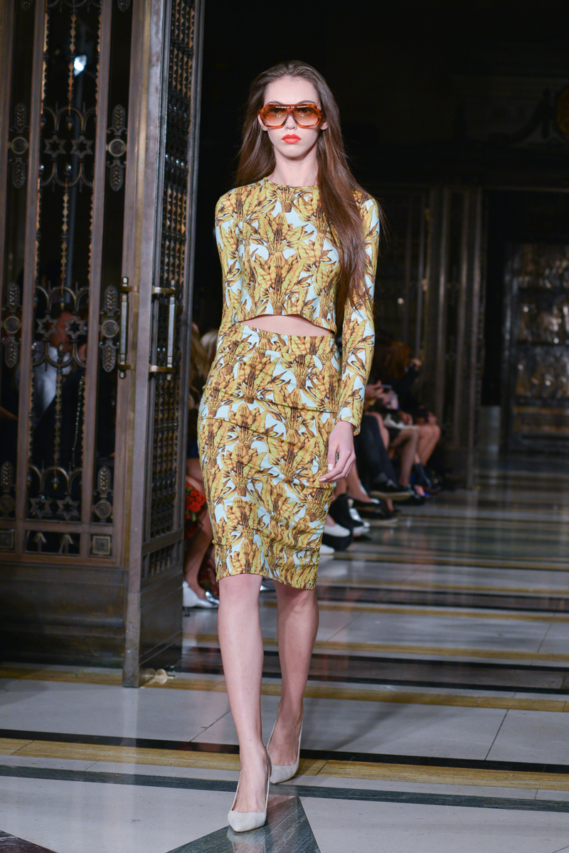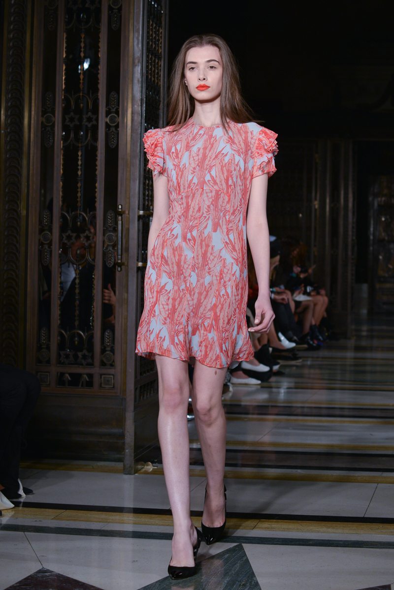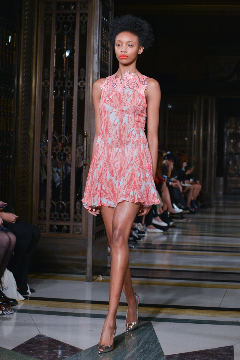 Made in Chelsea’s Milly Mackintosh watched on as the German-born design twins Daniela and Annette Felder presented Flamingo Flaneur for spring/summer 2016. Gorgeous tropical prints highlighted with bold flamingo feathers, stood against shimmering aqua and gold foil organzas, and jacquards – this collection oozed sensual, Miami cool.