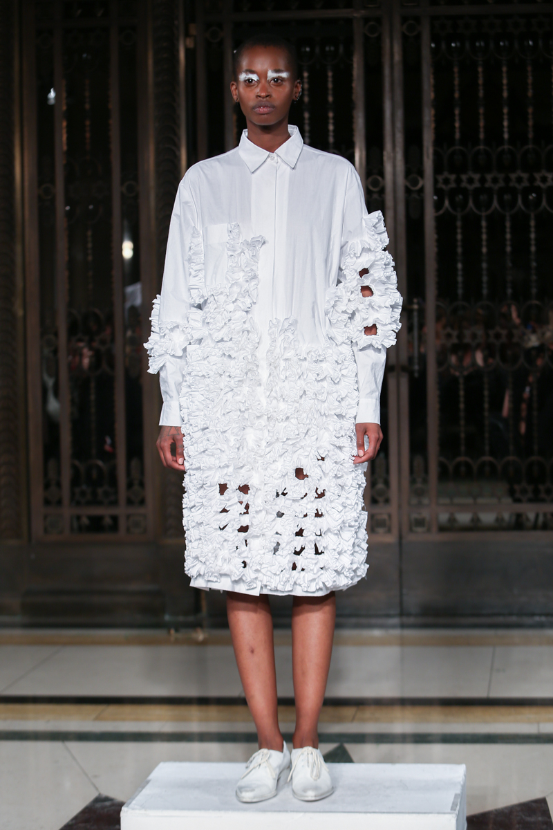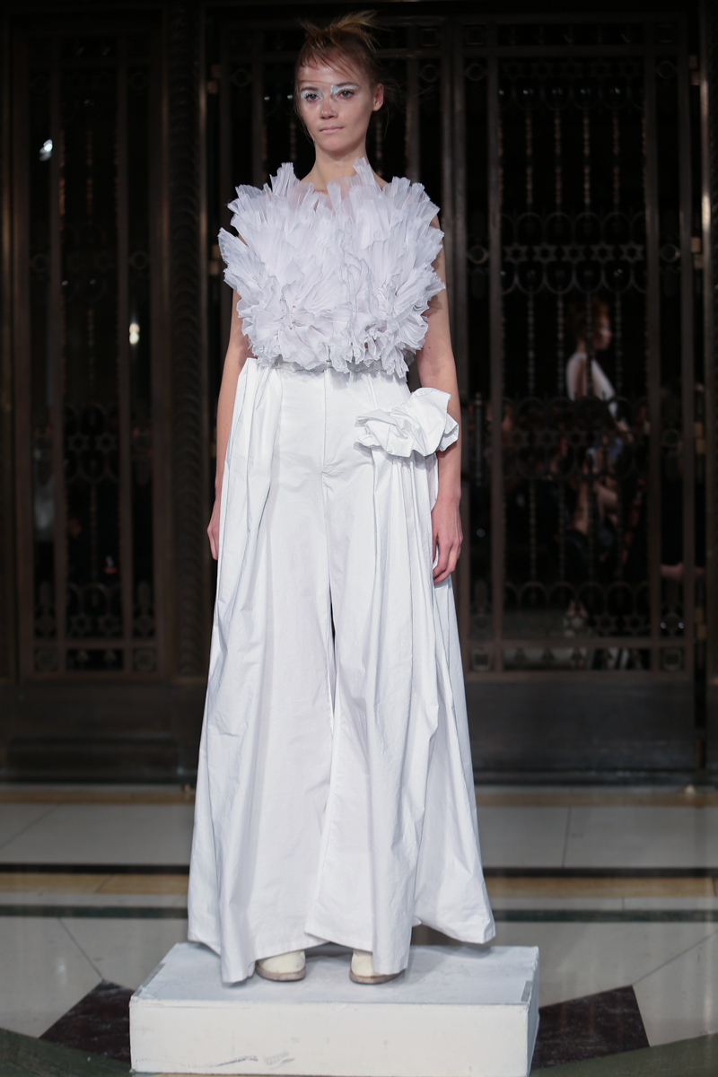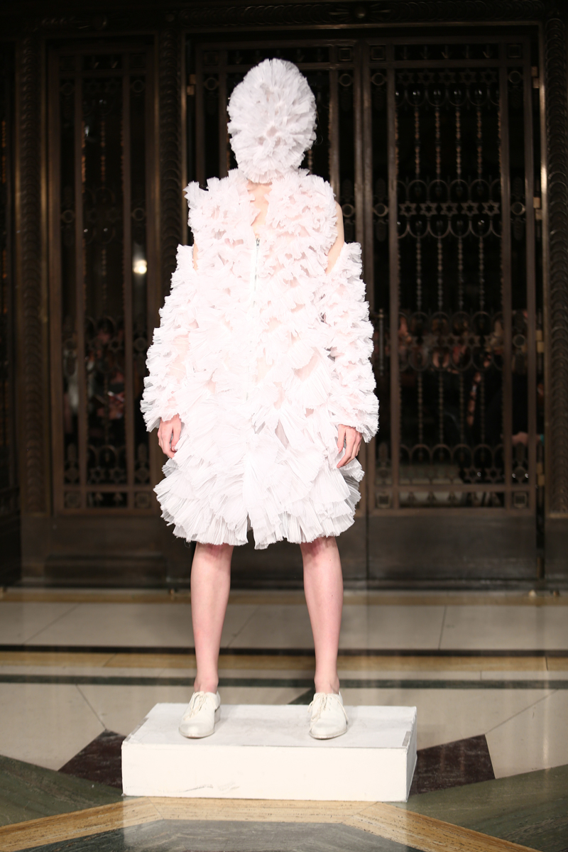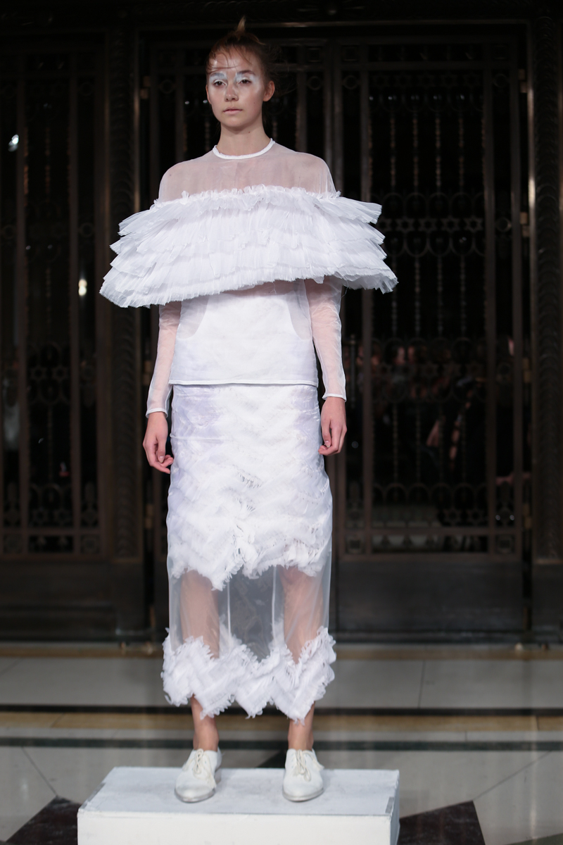 Ruffled headwear, bold white-eye makeup and white lace up brogues completed the primarily neutral collection. Roberts Wood’s fascinating collection played with the realms of reality and fantasy with her bold use of fabrics and contrasting structures, ultimately infusing a sense of the unreal into her work.