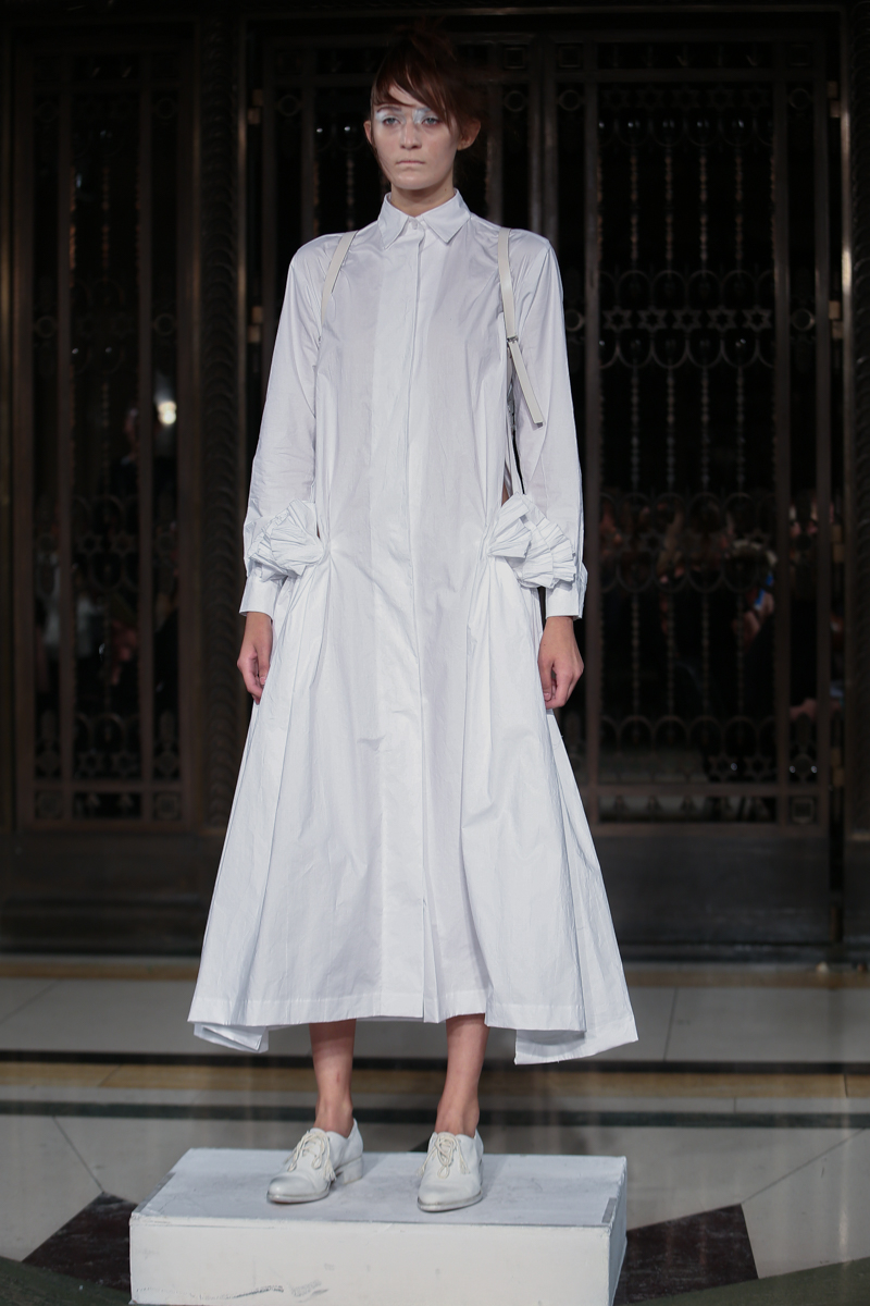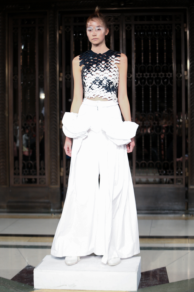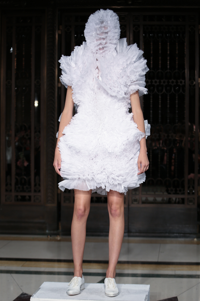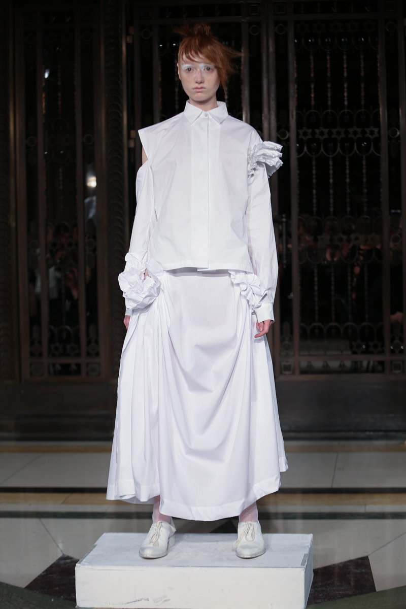 Ruffled headwear, bold white-eye makeup and white lace up brogues completed the primarily neutral collection. Roberts Wood’s fascinating collection played with the realms of reality and fantasy with her bold use of fabrics and contrasting structures, ultimately infusing a sense of the unreal into her work.