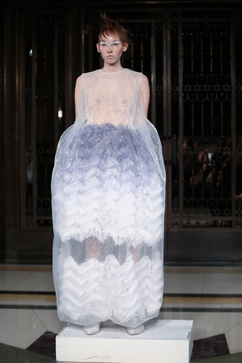 Frilled bodices were completed with the incorporation of lace and stitched mesh pieces whilst the colour palette stayed largely neutral with hues of white, navy, grey and black all taking centre stage on the runway.