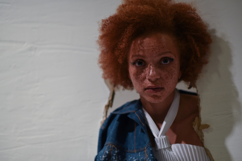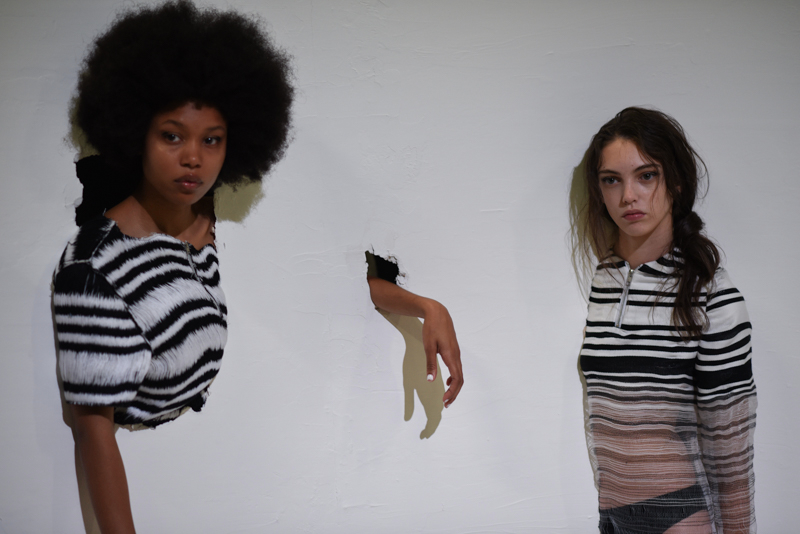 CSM graduate and Paris-born London-based designer Faustine Steinmetz deconstructed her SS16 runway today: the models caught in their own moment of unreadiness, bound by the wall that bisected their bodies at the waist, ankle, chest, thigh, somehow simultaneously calling to mind the tragic demise of Drew Barrymore in Scream and an advancing zombie army – or is it ghosts walking through walls?