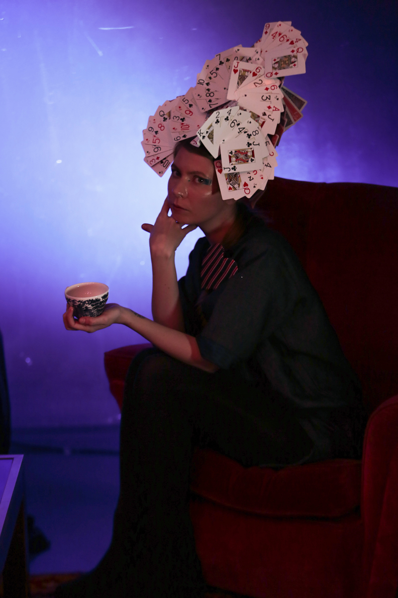 It was the striking headpieces, however, which really stole the show. They also took inspiration from the theme of Wonderland, exploding and swirling from the pony-tailed heads. One monochrome piece evoked the ears of a gothic White Rabbit; another stood in disjointed monochrome stripes like a Queen’s crown. A particular stand out was the headpiece built entirely from swirling playing cards.