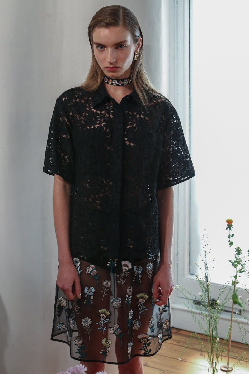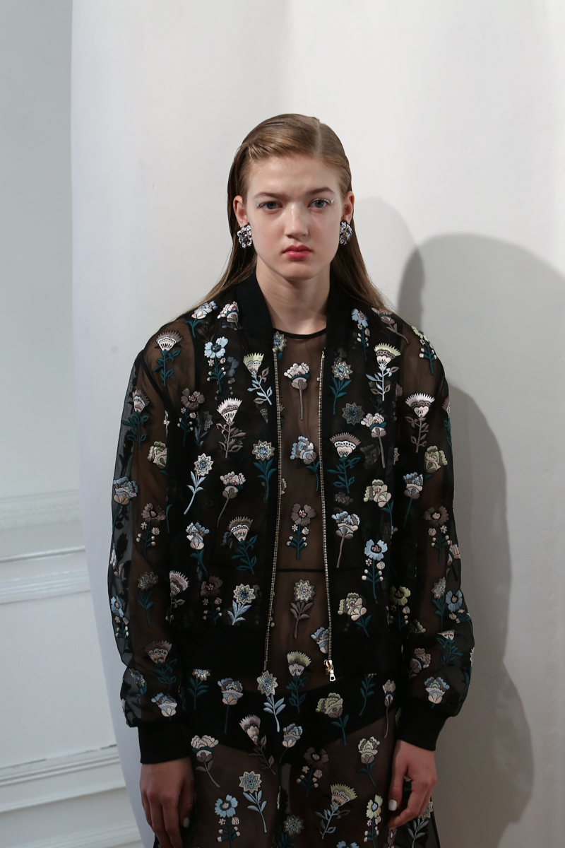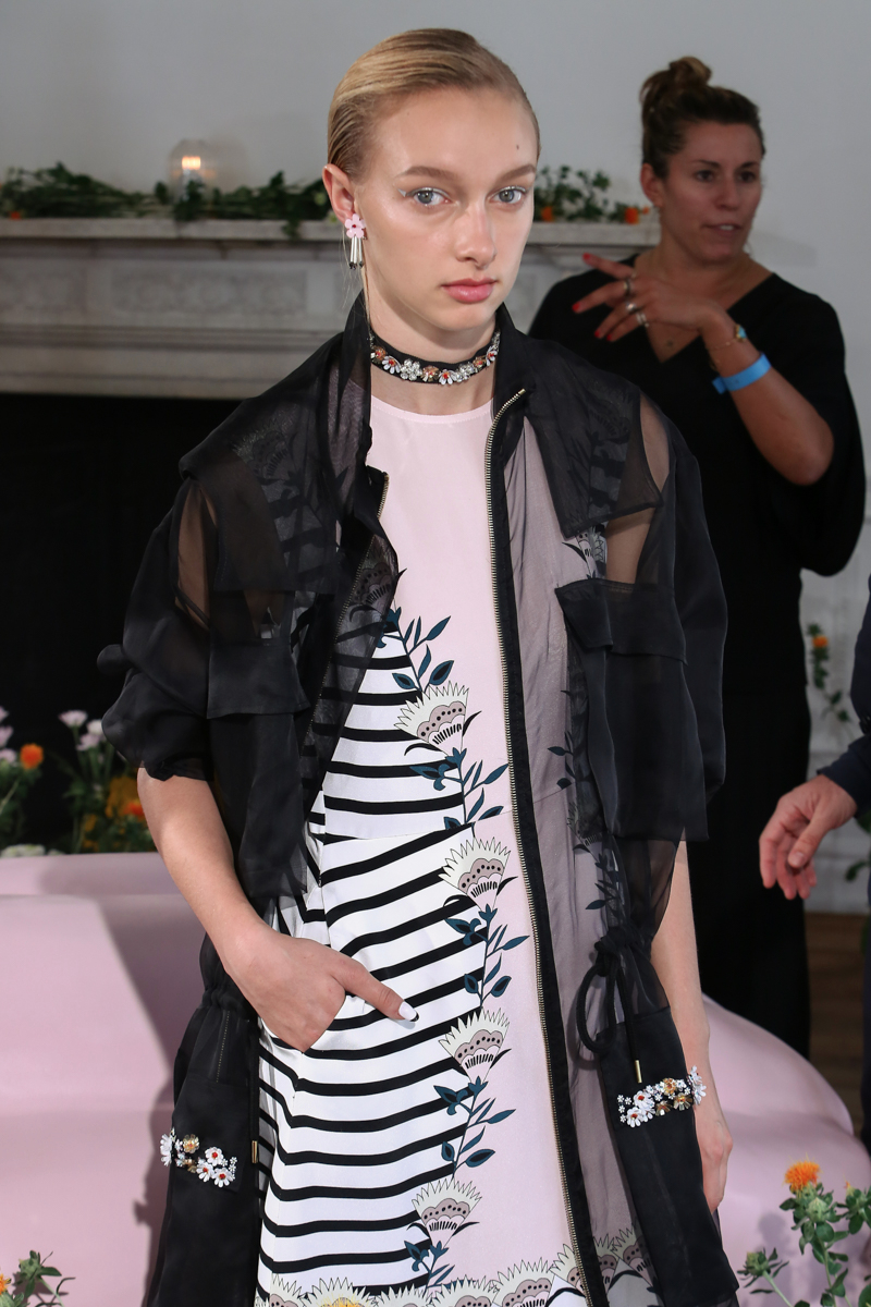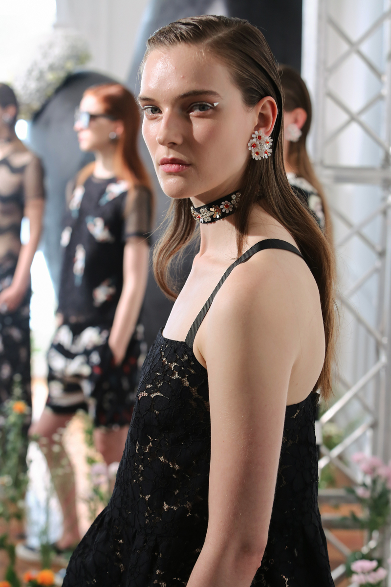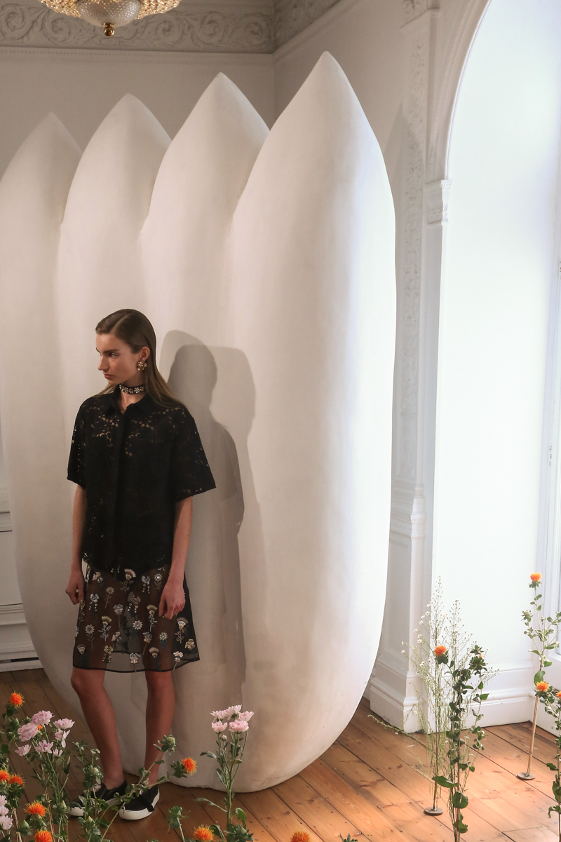 Clean A-line shapes played canvas to the flora and fauna of dry climates, with cacti woven in sheer fil coupé. Rich florals appeared throughout, in prints featuring graphic flowers over stripes, embroidered on sheer organza, and a 3D sequin appliqué resembling a blooming desert – also echoed in footwear decoration.