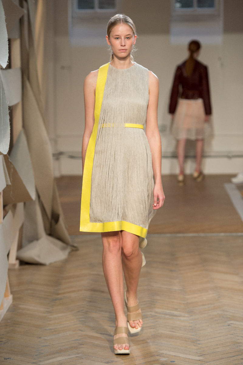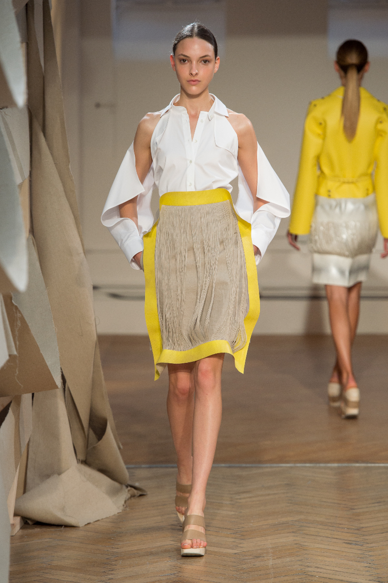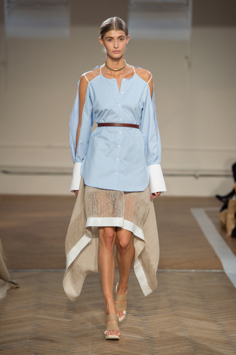 Several looks were based around the deconstruction of the shirt – an aspect the brand is renowned for – with panels dissected and collars and cuffs oversized. A synthesis of fabric manipulations was seen in cotton and linen, which had been dethreaded for a striking tasselled effect, alongside woven jacquard and gilded leather – recurring in attractive muted shades of blue, yellow and pink.