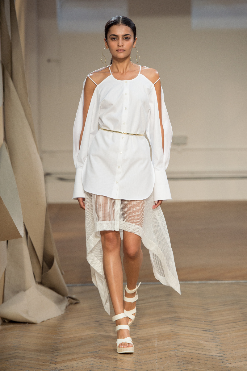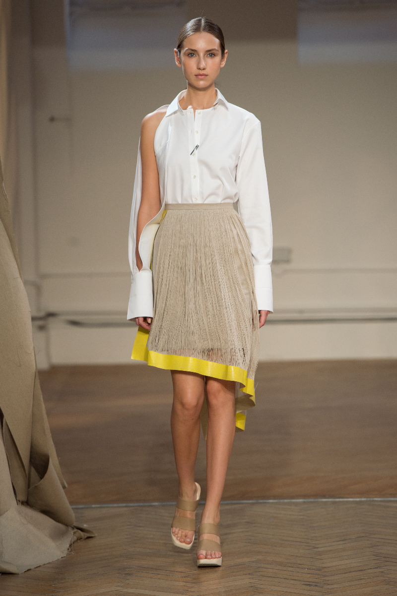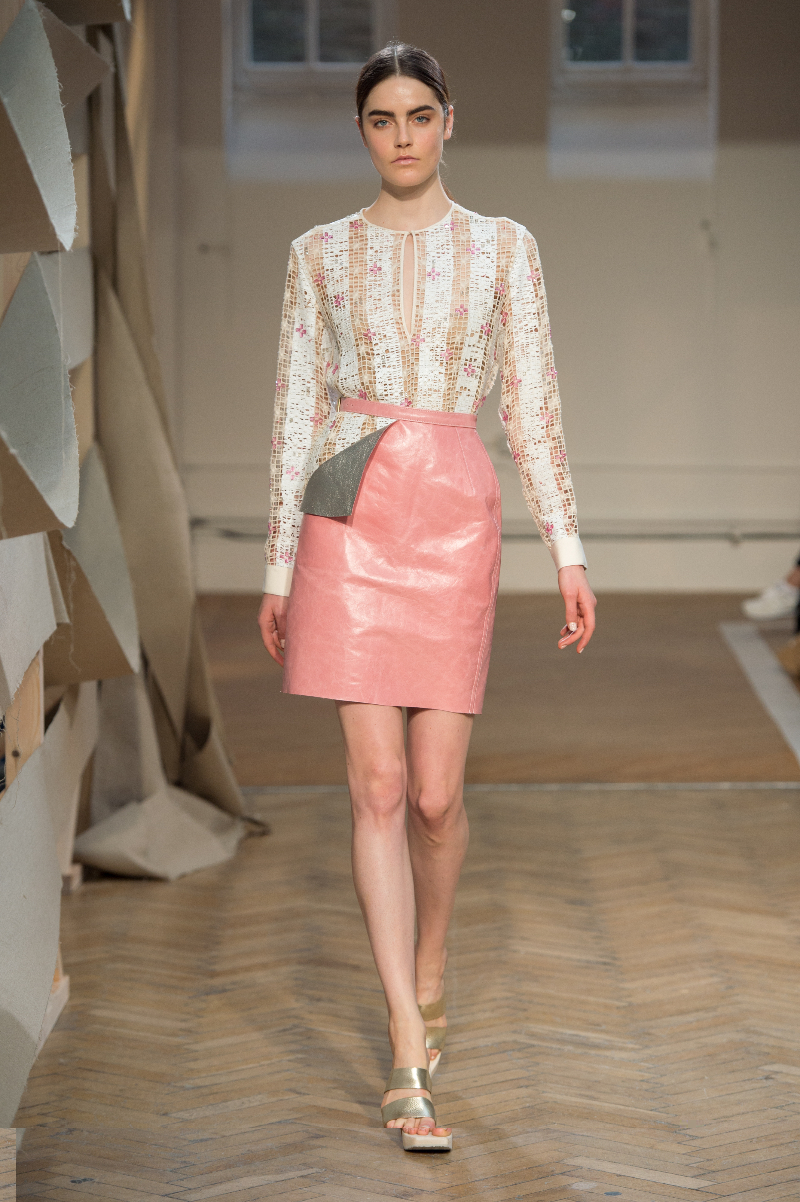 Tailored drapery featured heavily across an abundance of powerful outfits highlighting sheer panels, subtle prints and brass eyelets. The idea of dissection extended into skirts, with segments of material precisely, and beautifully, absent. Waists were cinched by narrow belts; feminine blouses, encrusted with Swarovski crystals, accompanied cut-out shirts, whilst structured, longline layers also made an appearance.