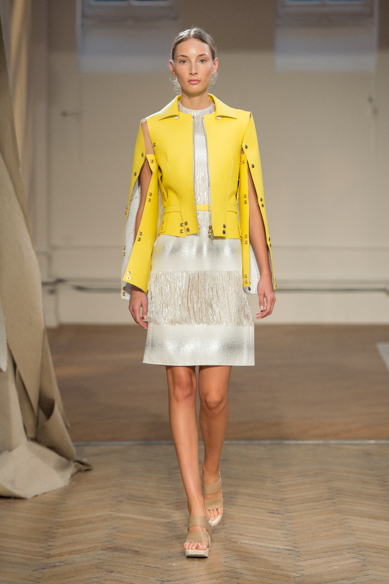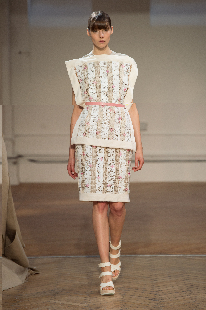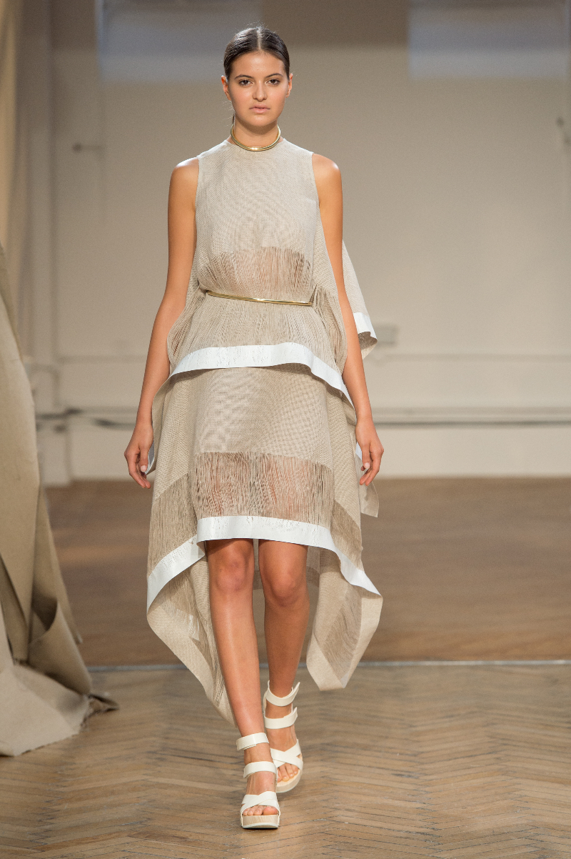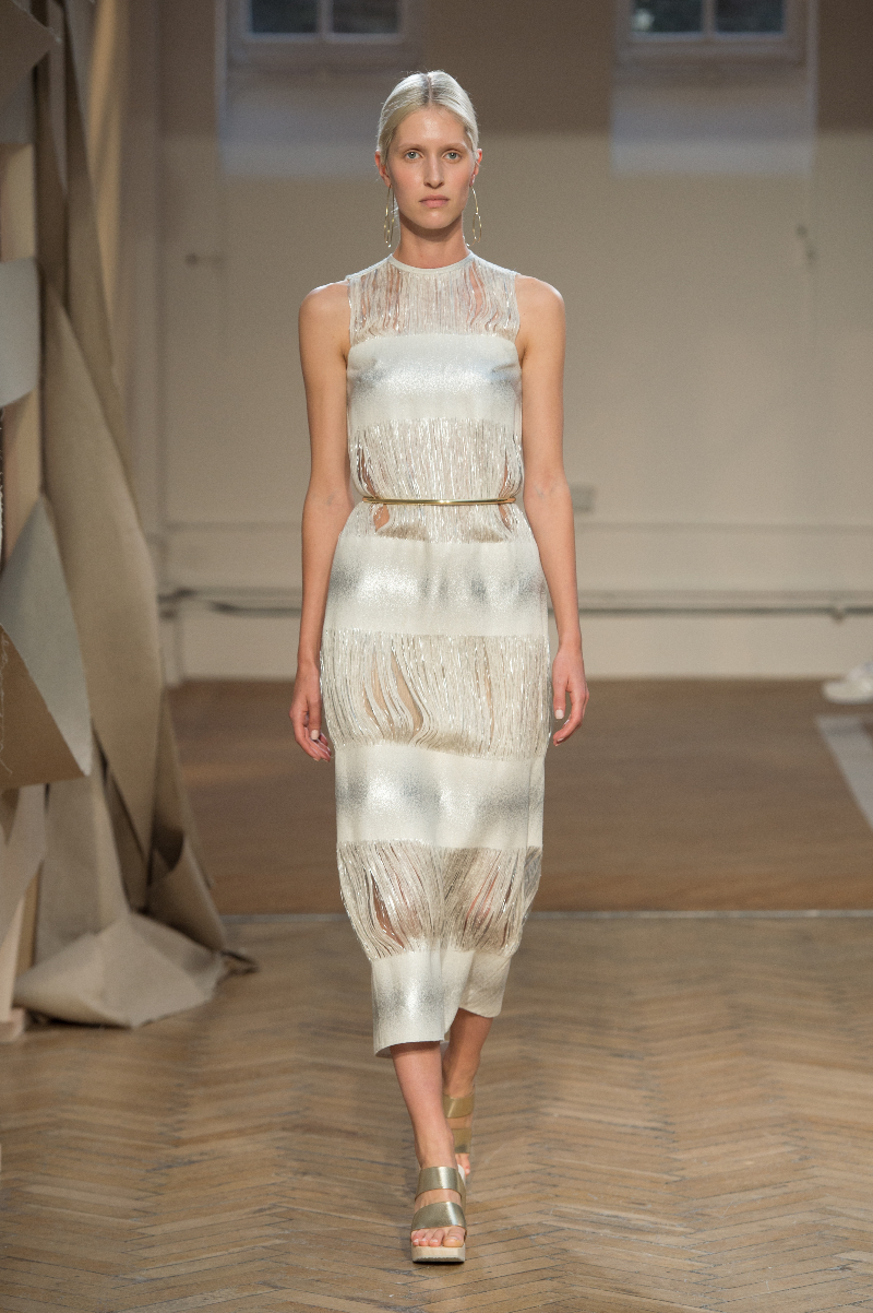 Tailored drapery featured heavily across an abundance of powerful outfits highlighting sheer panels, subtle prints and brass eyelets. The idea of dissection extended into skirts, with segments of material precisely, and beautifully, absent. Waists were cinched by narrow belts; feminine blouses, encrusted with Swarovski crystals, accompanied cut-out shirts, whilst structured, longline layers also made an appearance.