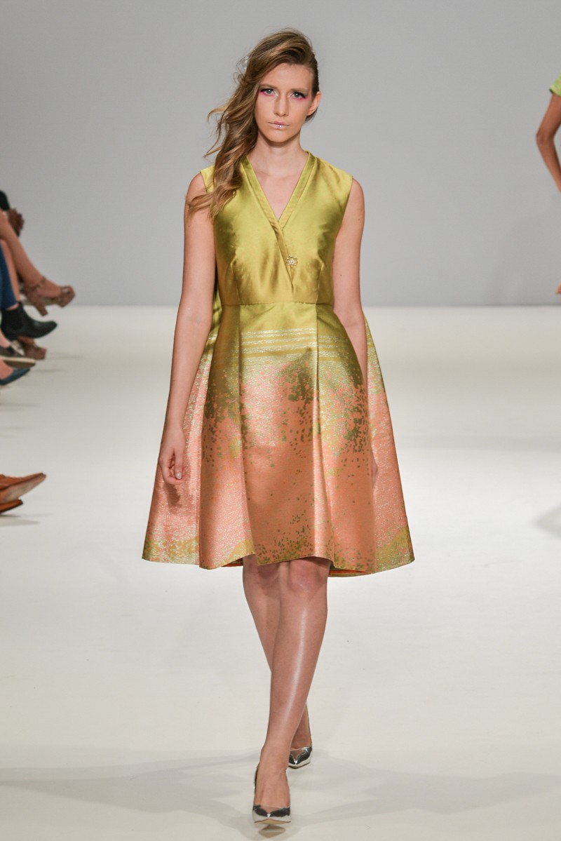 Delicate yet elaborate prints enamored the clothes, all with an oriental undertone – circa Orient Express. The collection started with a detailed print in shades of blue, in the form of structured dresses, batwing capes and short jackets. This then moved on to a sharp contrast of vibrant greens and pale corals, with scoop necklines, all hosting the similar structure of skimming the body; entirely feminine. These pieces again all carried the oriental theme, giving a background to the collection.