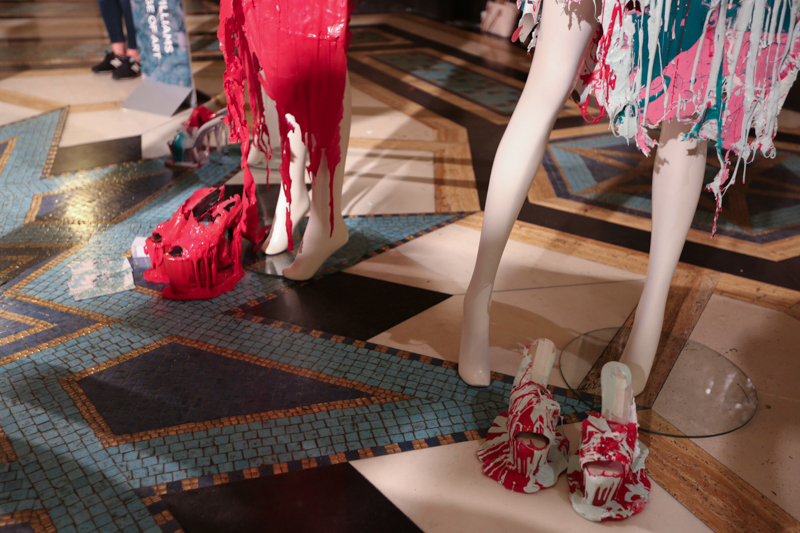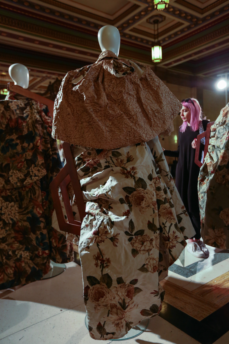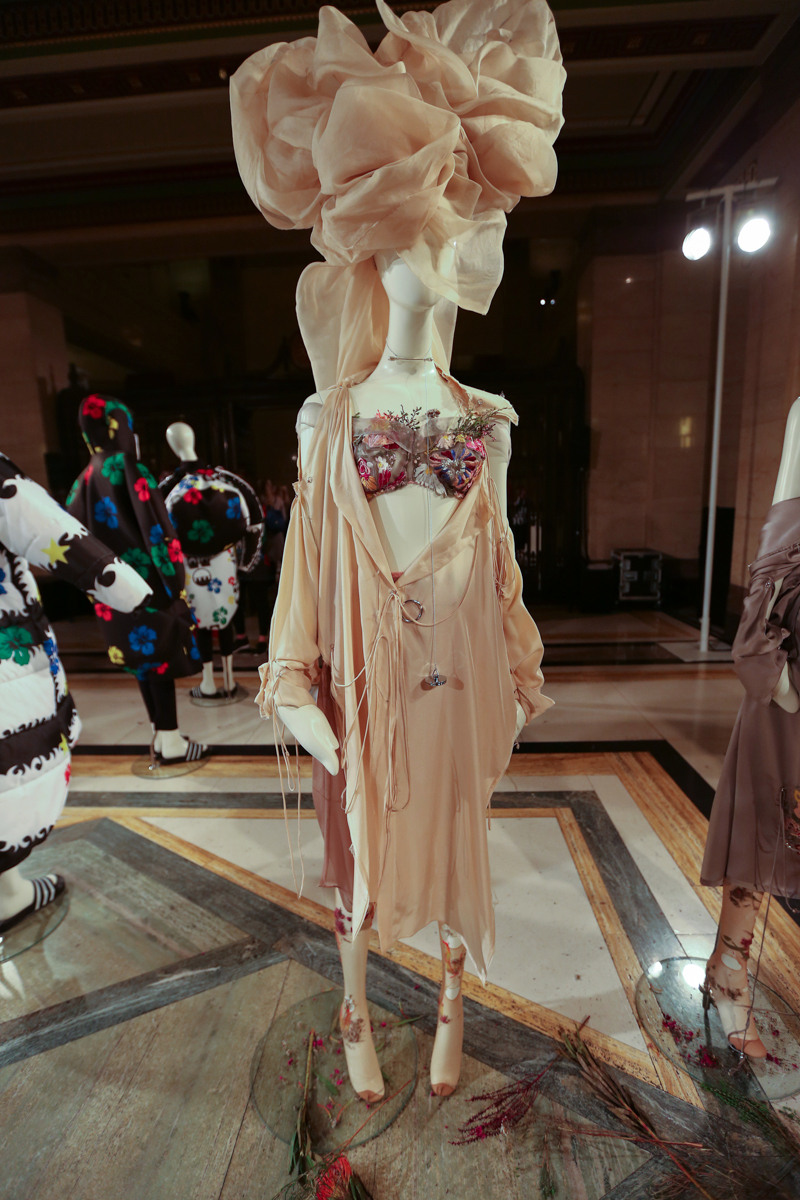 As it was their final projects, each graduate spent around four months’ producing their collection – each was individual and completely different from the next. The journey started with loud shoulder pads and bright stripes, fantastic corset-like tailoring and “bag inspired” pieces that seemed as if they have been made out of wood. It then followed round to designs created from four-tiered fabric made into boxy shapes with sharp colour contrasts, and a row of satin-dressed models with dried flowers lining their tights and lingerie, encompassing delicacy.