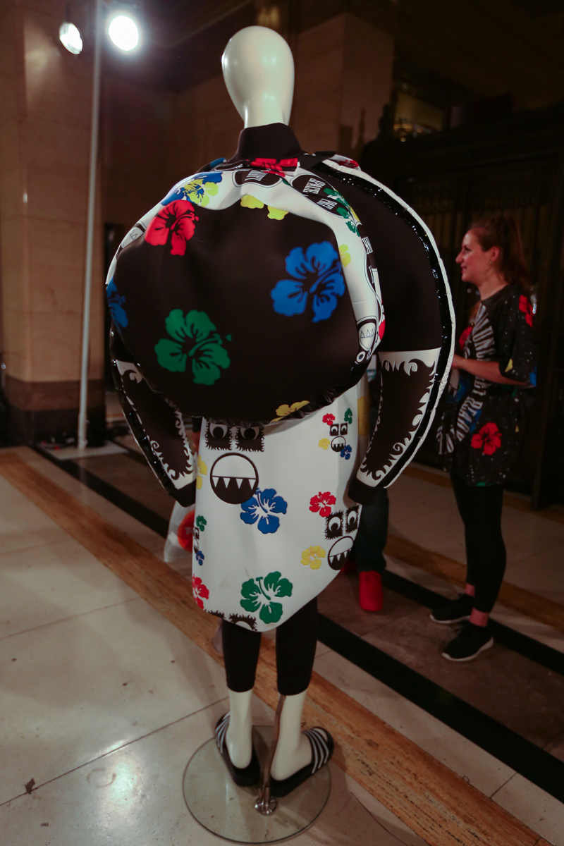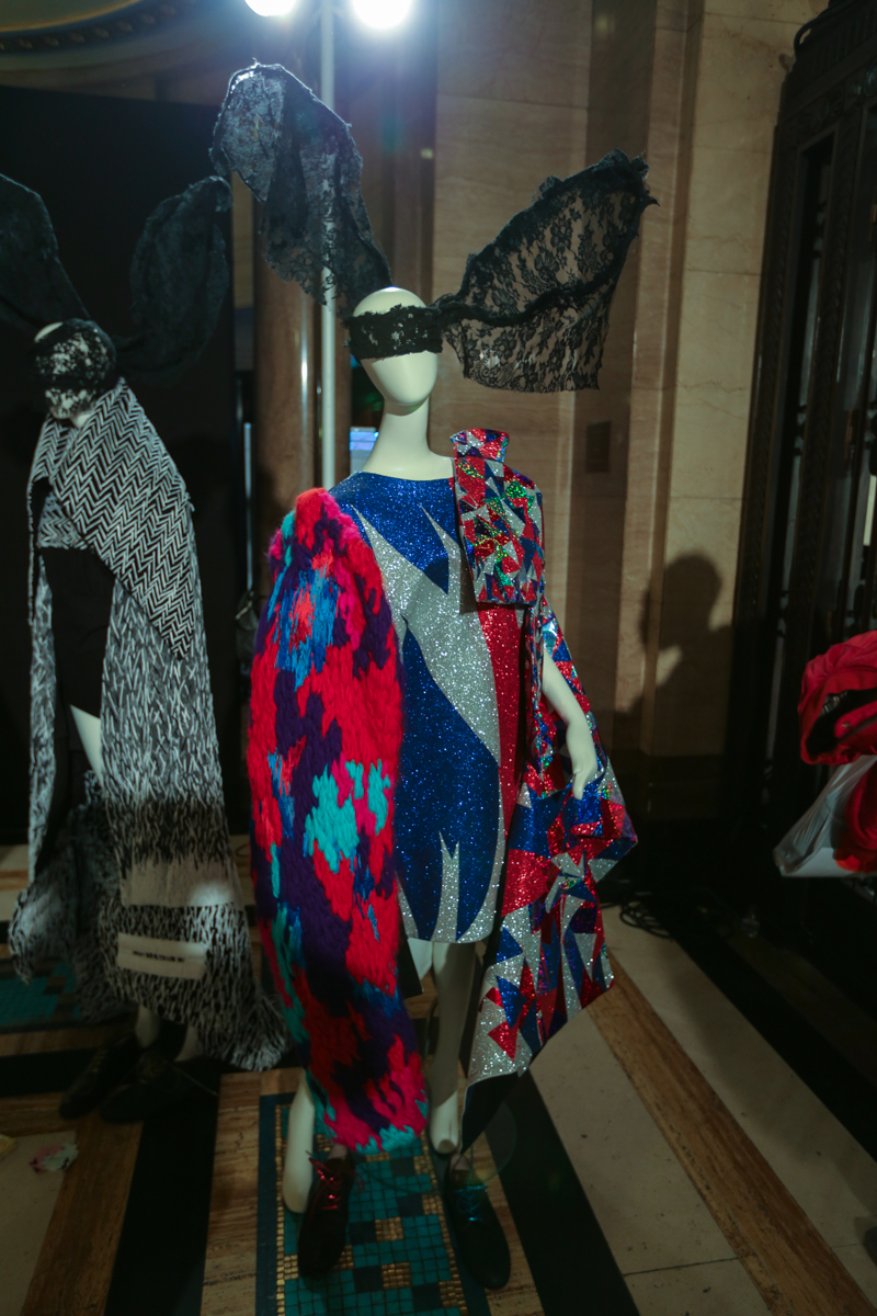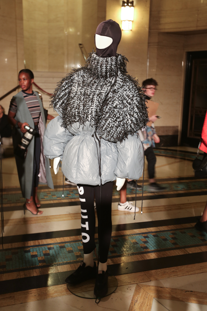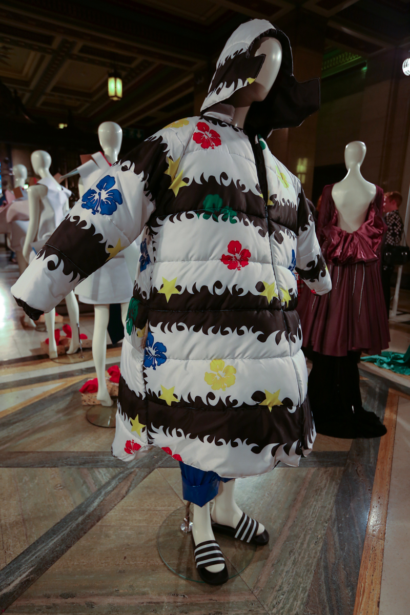 The presentation included a taste of by-gone eras with almost medieval-inspired pieces, showing a slight witchcraft twist and crystal-embellished accessories. Futuristic puffa jackets with loud cartoon prints also made an appearance, alongside made-to-measure silicon molded dresses with matching accessories.