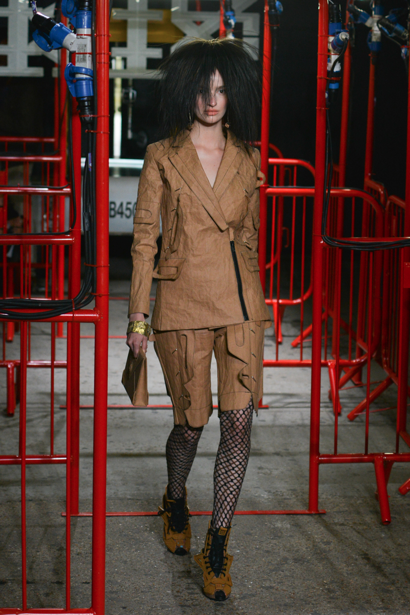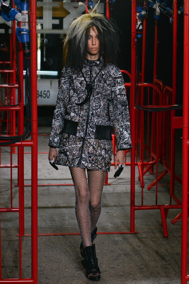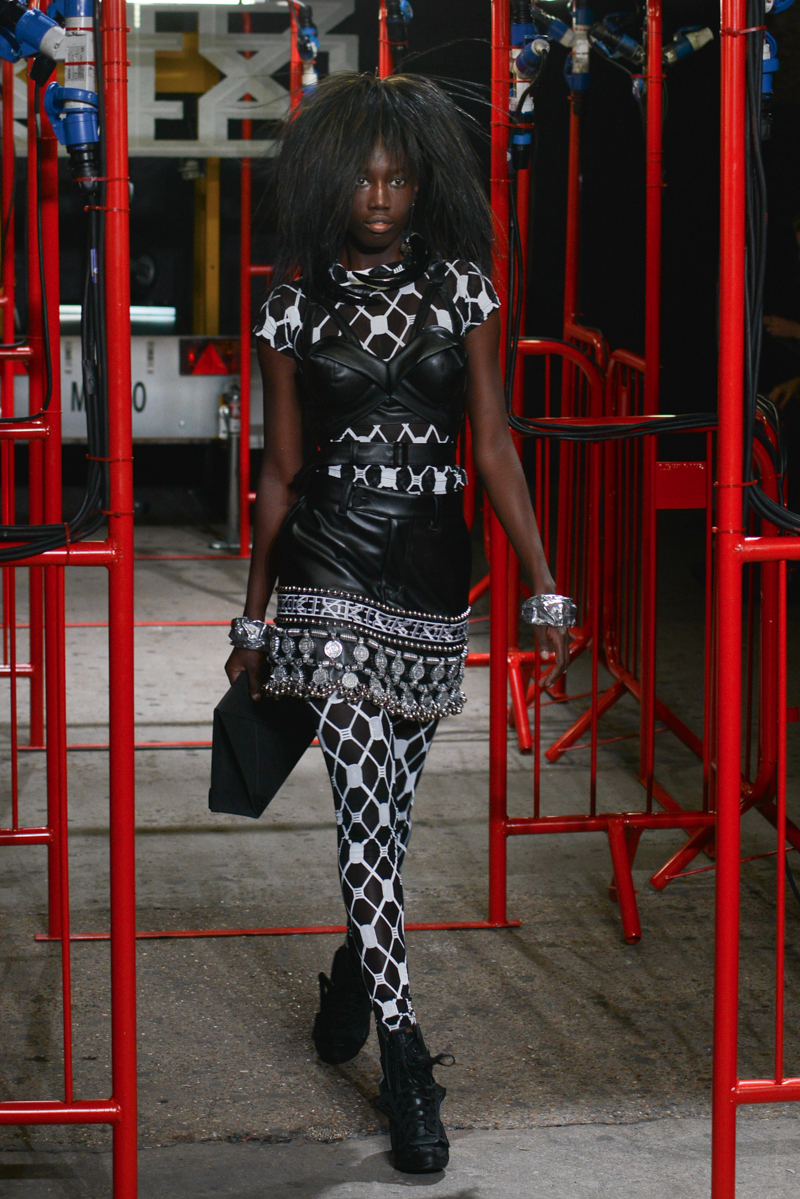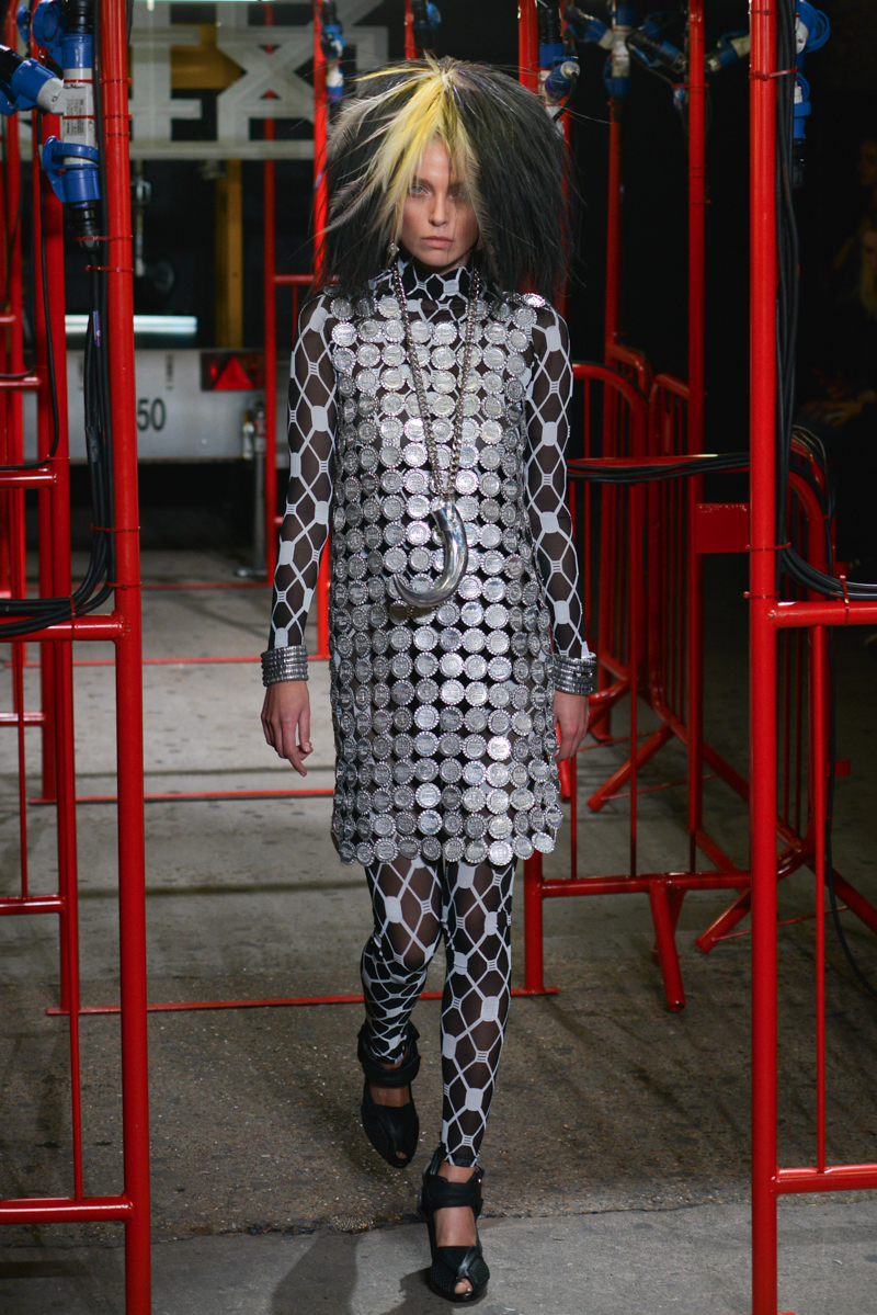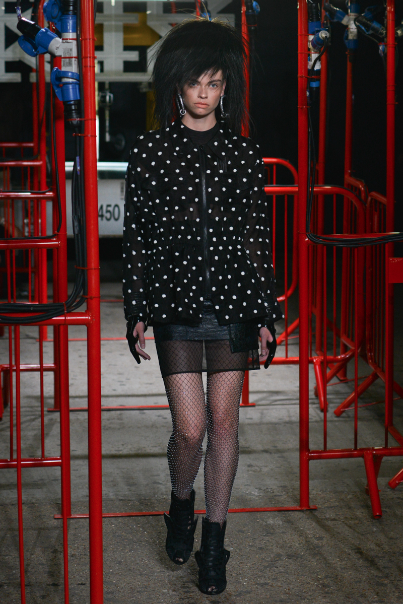 Remarkable skill was shown through the ingenuity of the cut of tanned leather, suede jackets and mini-dresses, manipulating the surface of the material to focus on producing shapes to ascertain a novel post-punk aesthetic. Black leather disco shorts and bondage bralets styled with sheer full-length sleeves added to the sensuality of the collection, whilst almost Jackson Pollock-esque abstract expressionist prints and Warholian pop art slogans of the label’s name helped to advocate a carefree, punk attitude.