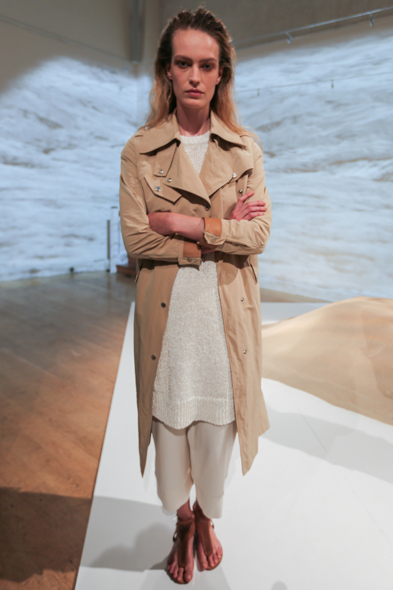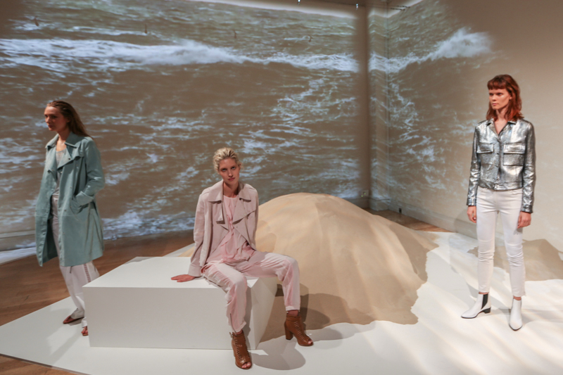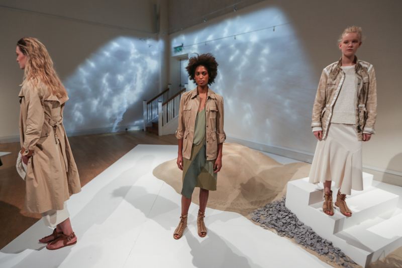 The images of waves breaking across the walls found a mirror in the clothes themselves. The sea’s influence was everywhere, most obviously in the printed pattern that evoked the interplay of light on water. Mottled reflections in shades of blue or cool grey moved across a wax-cotton jacket, or (most strikingly) over a tiered georgette gown worn beneath a beige trench.