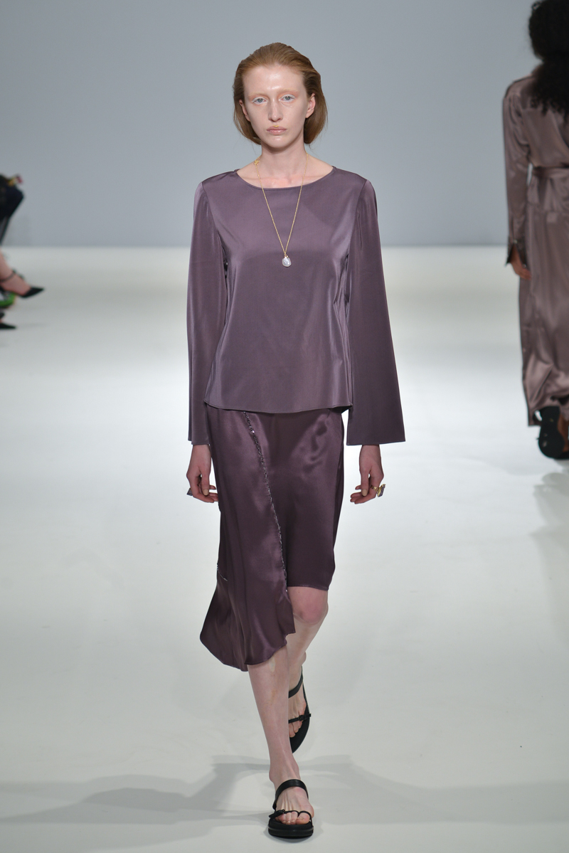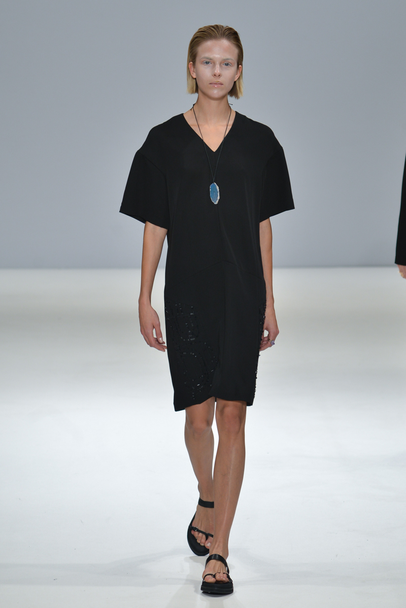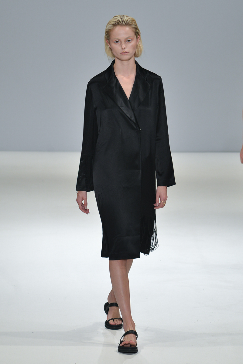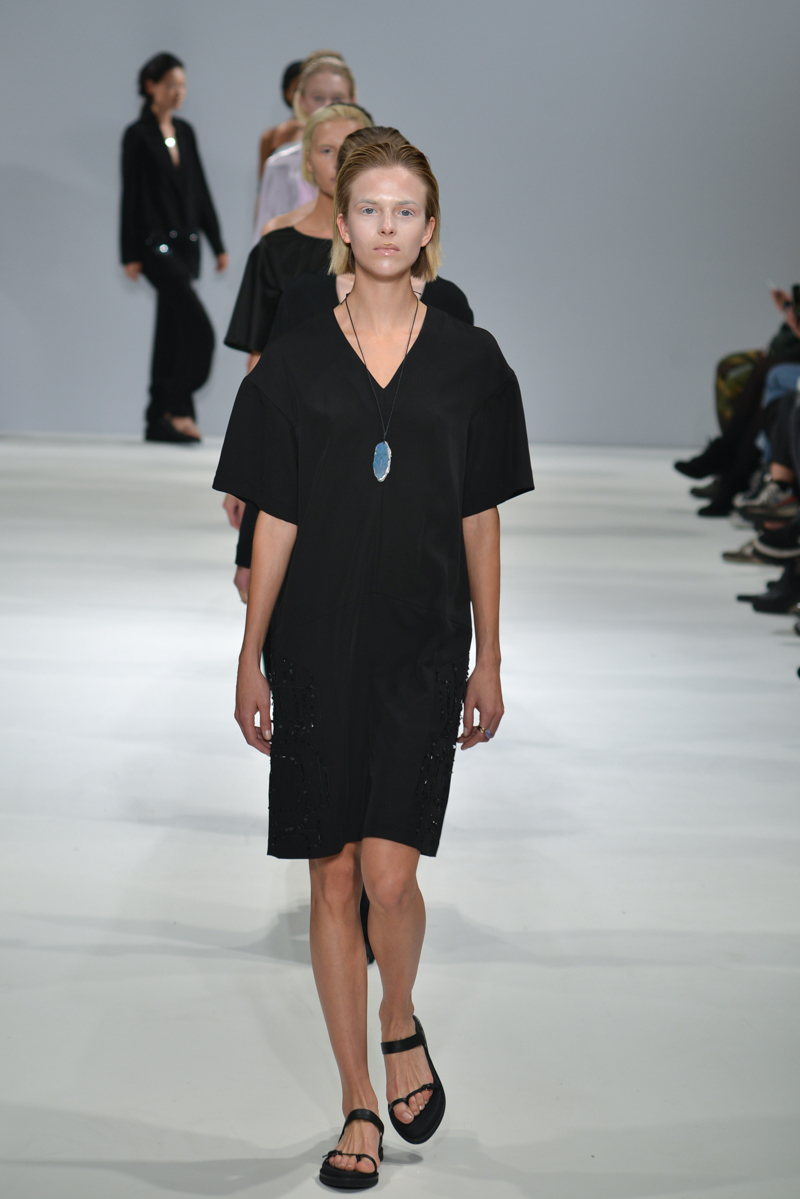 The collection also hosted a series of subtle embellishments – either beaded or statement semi-precious stones – with the fit still just hanging off the models, skimming their figures but managing to be more flattering than if they were skin-tight.