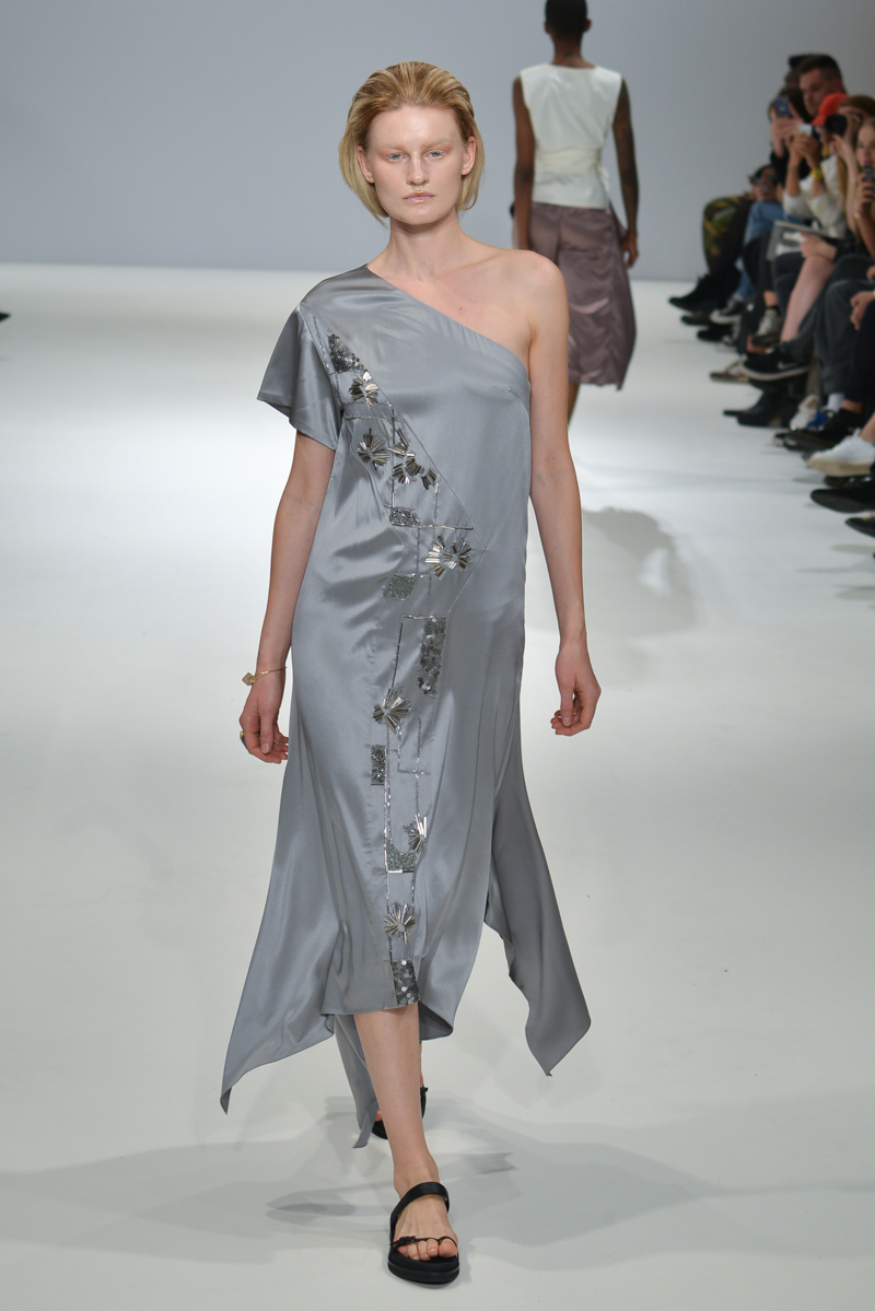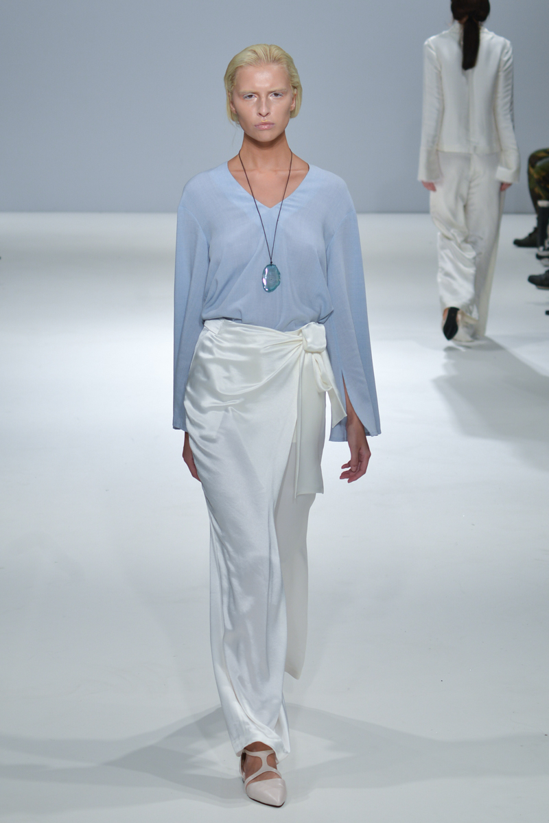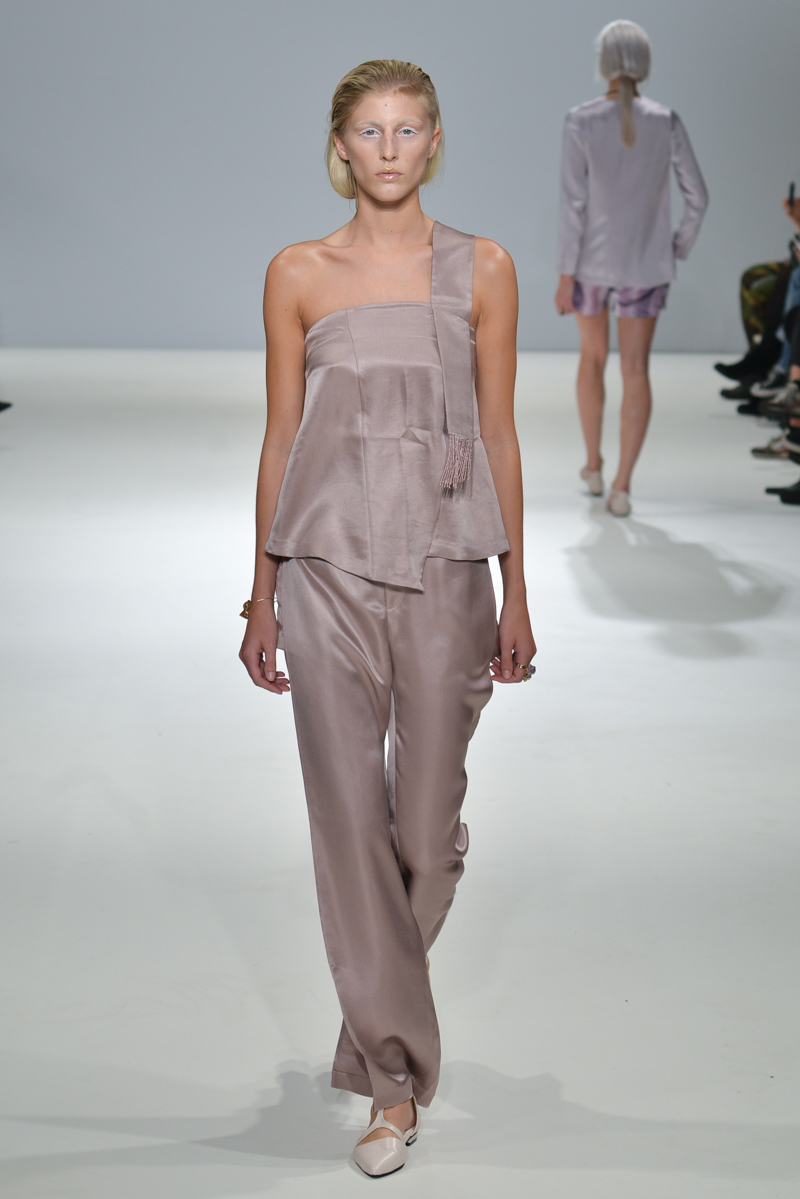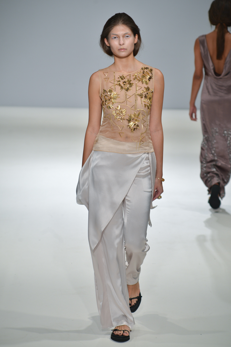 The show progressed into asymmetric designs – the material used was gentle yet sophisticated, and so elegant that it managed to reflect that on to the models, mirroring the futuristic sparkle on to their skin. A mixture of cropped tops with low hanging knotted ties at the front, were layered over satin smooth tailored trousers, while silk dresses in soft shades hung off the models with an unequivocal elegance.