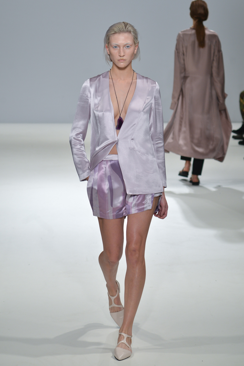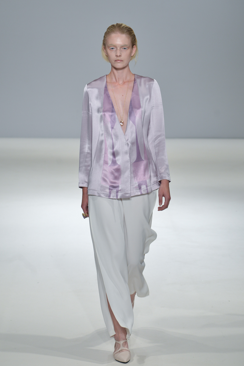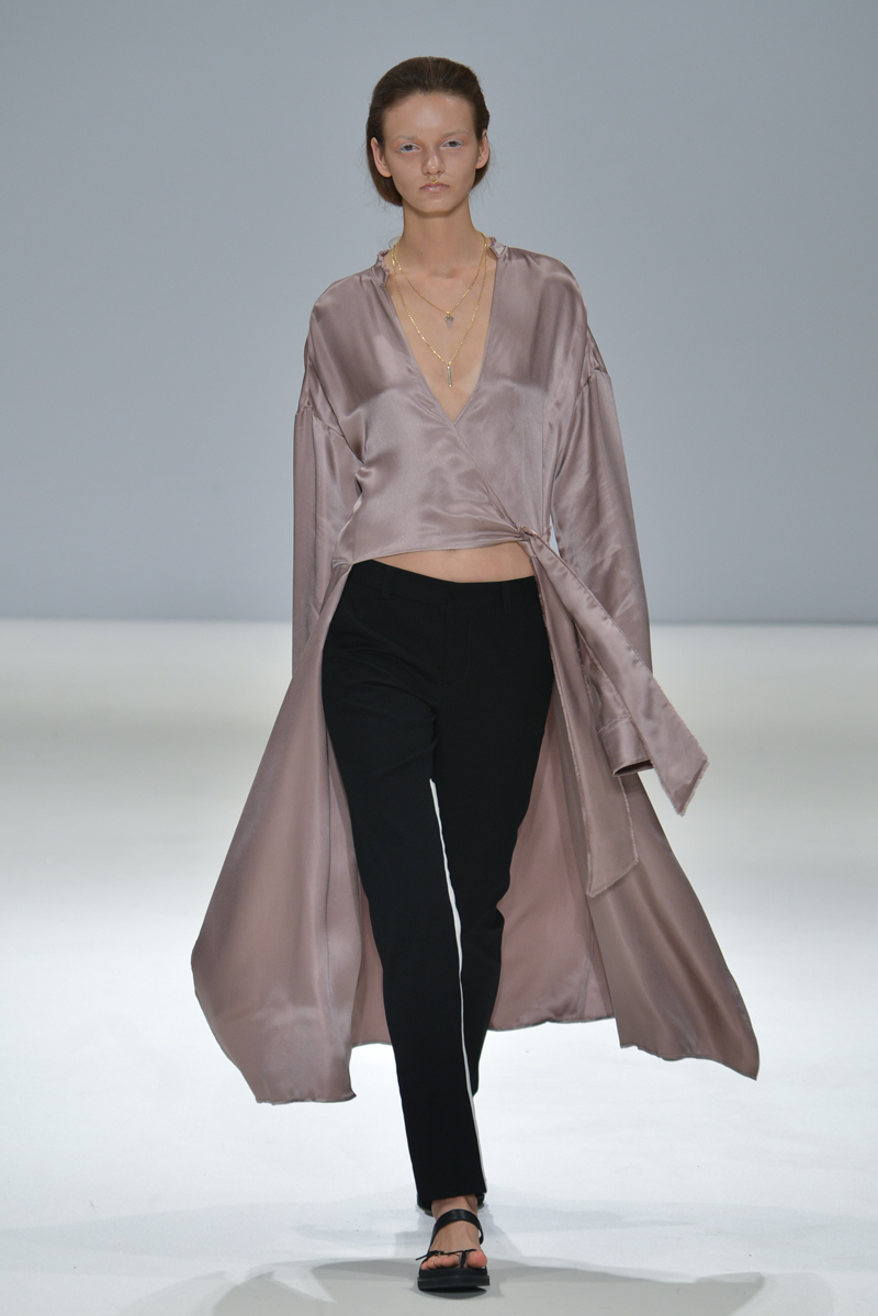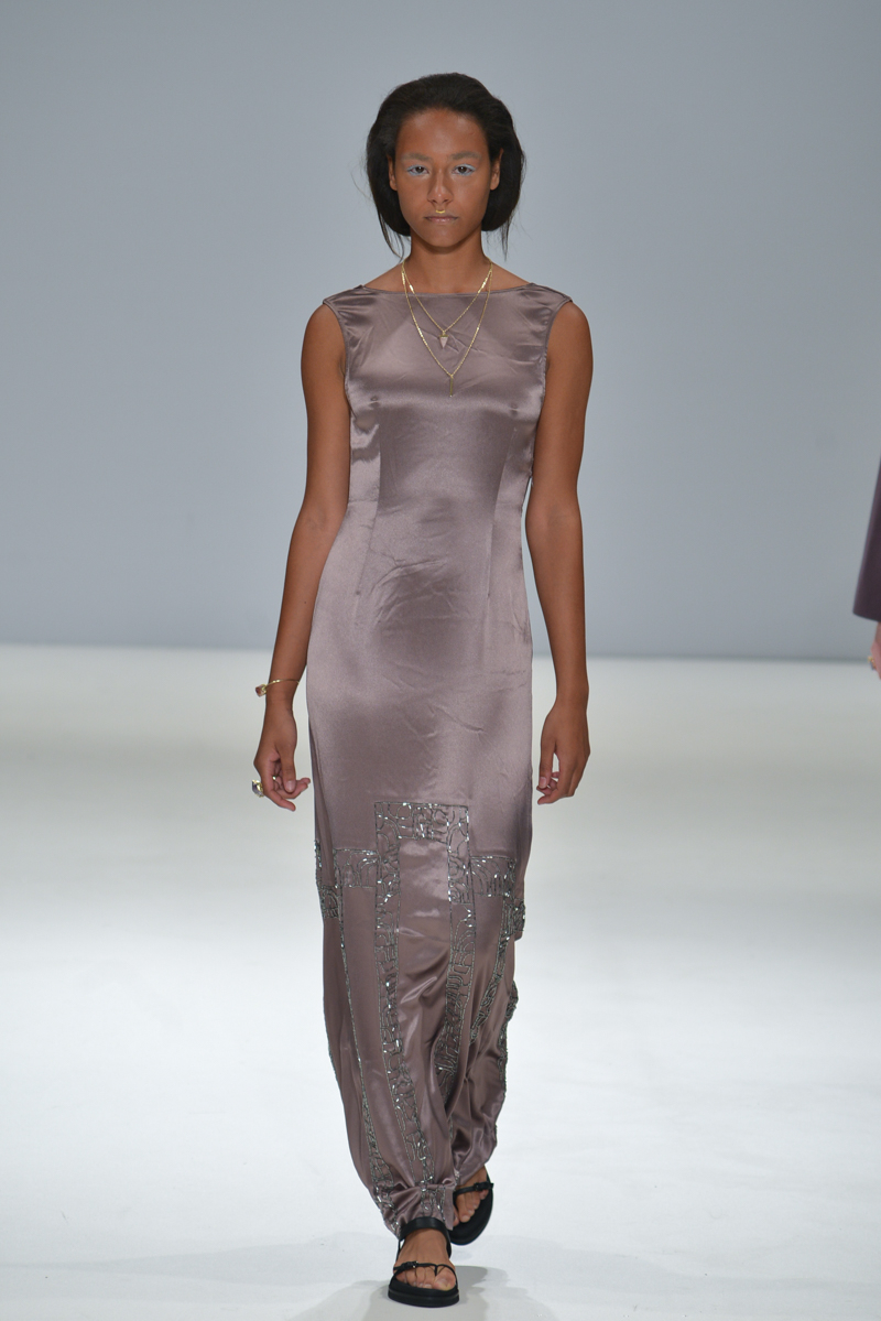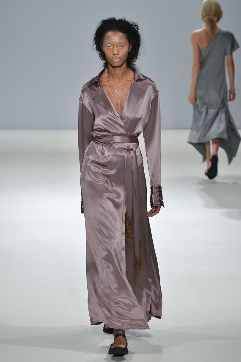 The show progressed into asymmetric designs – the material used was gentle yet sophisticated, and so elegant that it managed to reflect that on to the models, mirroring the futuristic sparkle on to their skin. A mixture of cropped tops with low hanging knotted ties at the front, were layered over satin smooth tailored trousers, while silk dresses in soft shades hung off the models with an unequivocal elegance.